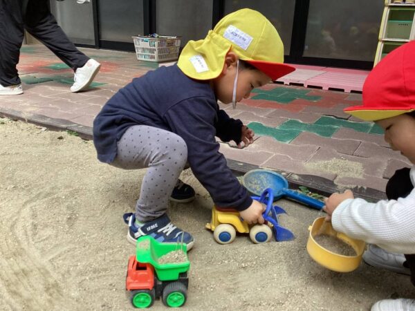 男の子は、車の玩具でショベルカーに砂を入れ、それをダンプの荷台にこぼし