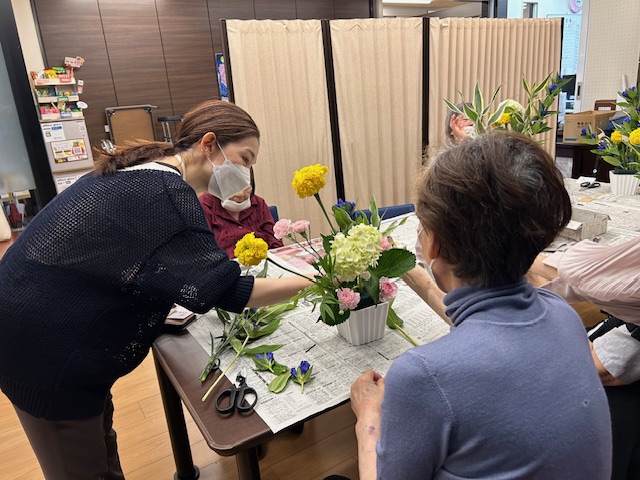 以前、生け花をしたことのある利用者様は、同じ色どうしを集めるグルーピングという技法や、混色を考え配置するなど、