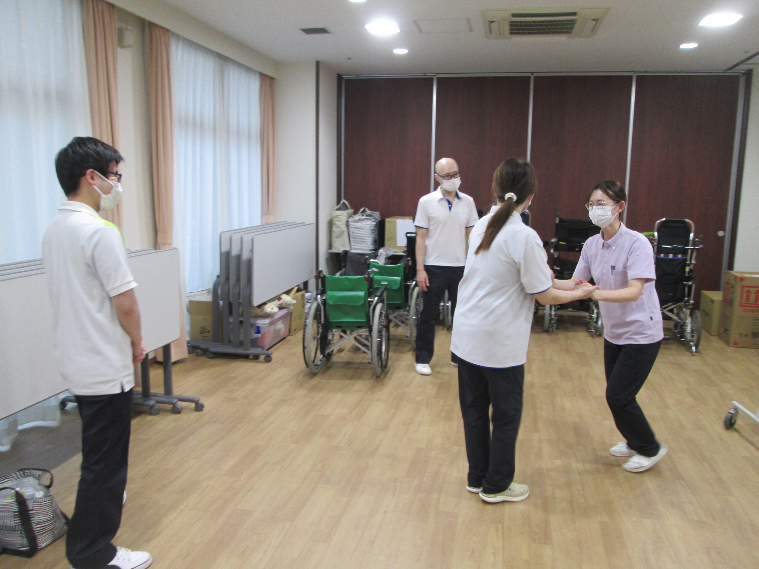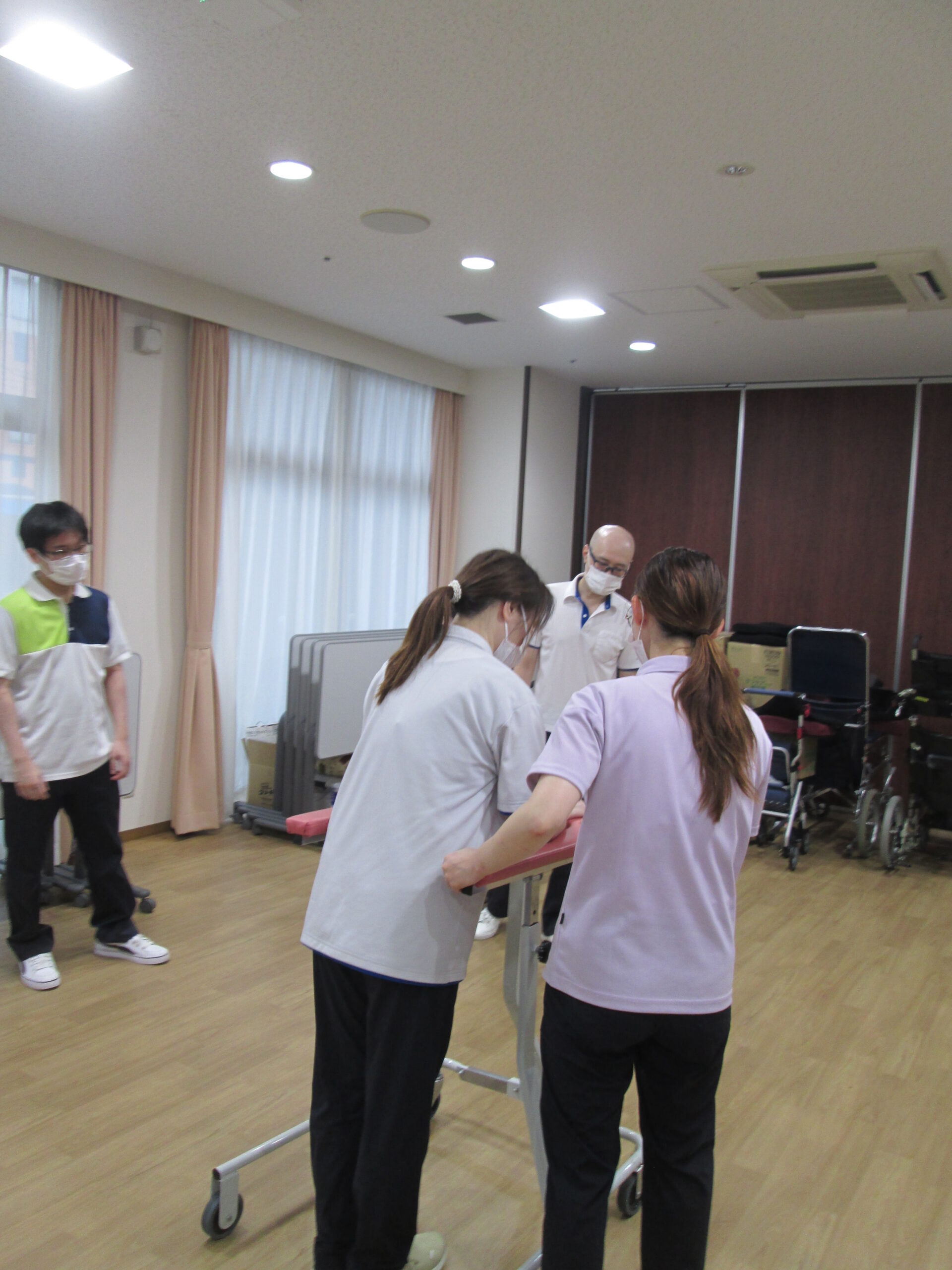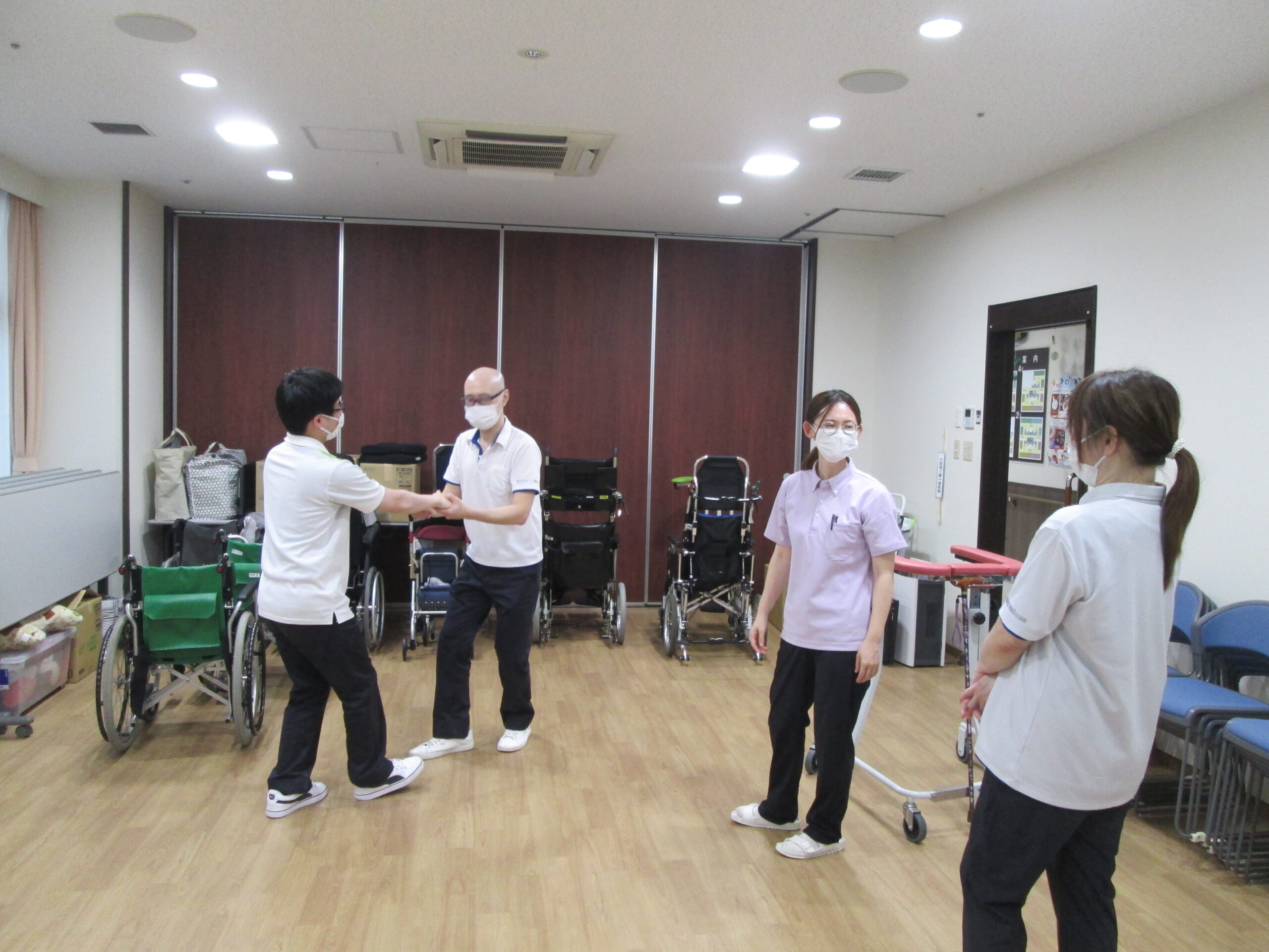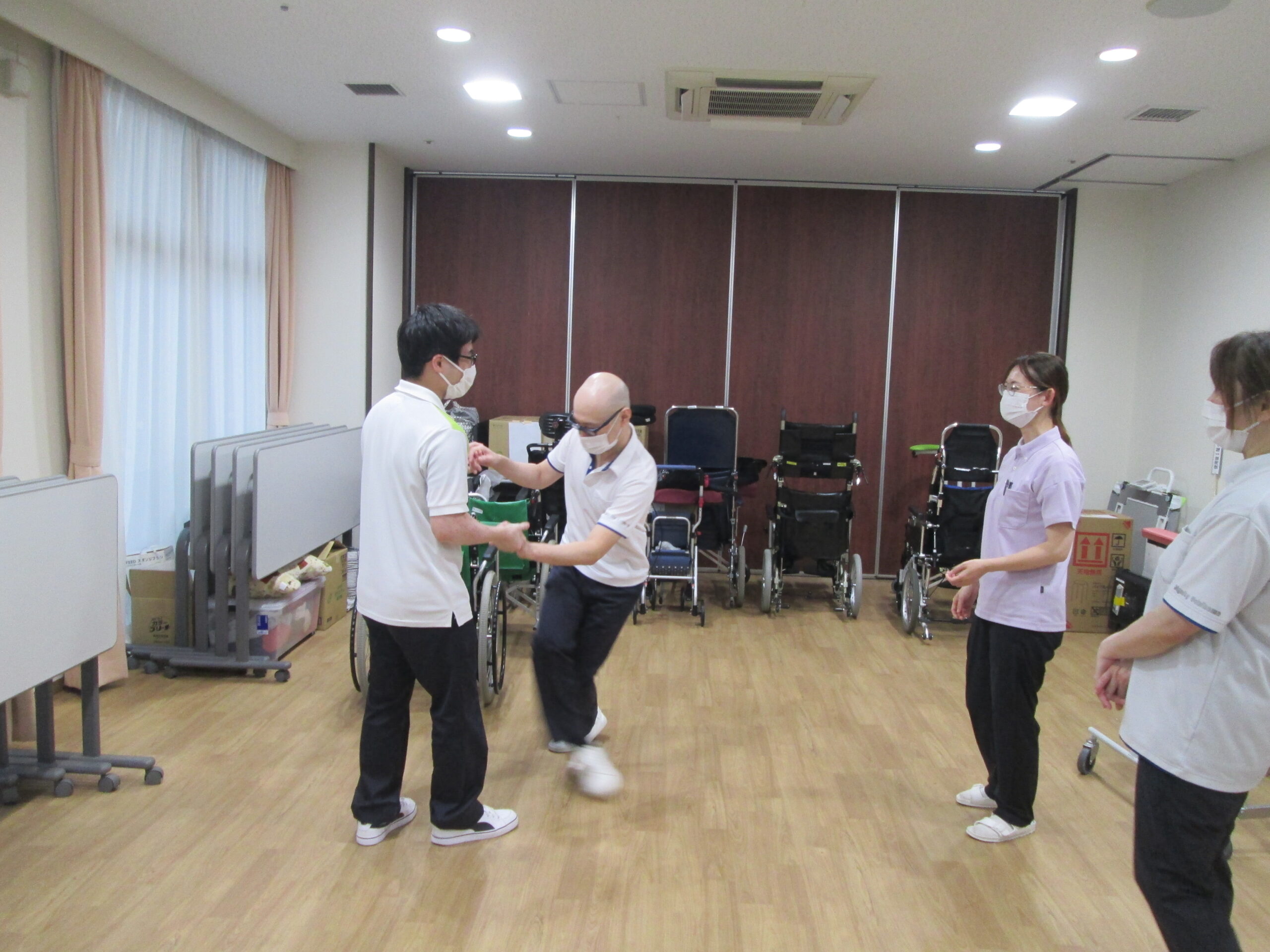 ユニットの利用者様の歩行を模倣してもらい、手掌把持と前腕支持の違いを感じていただきました。
