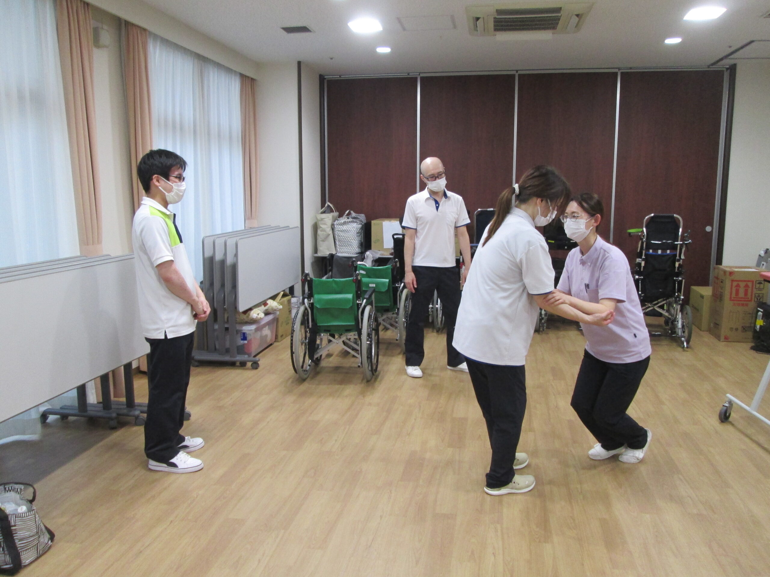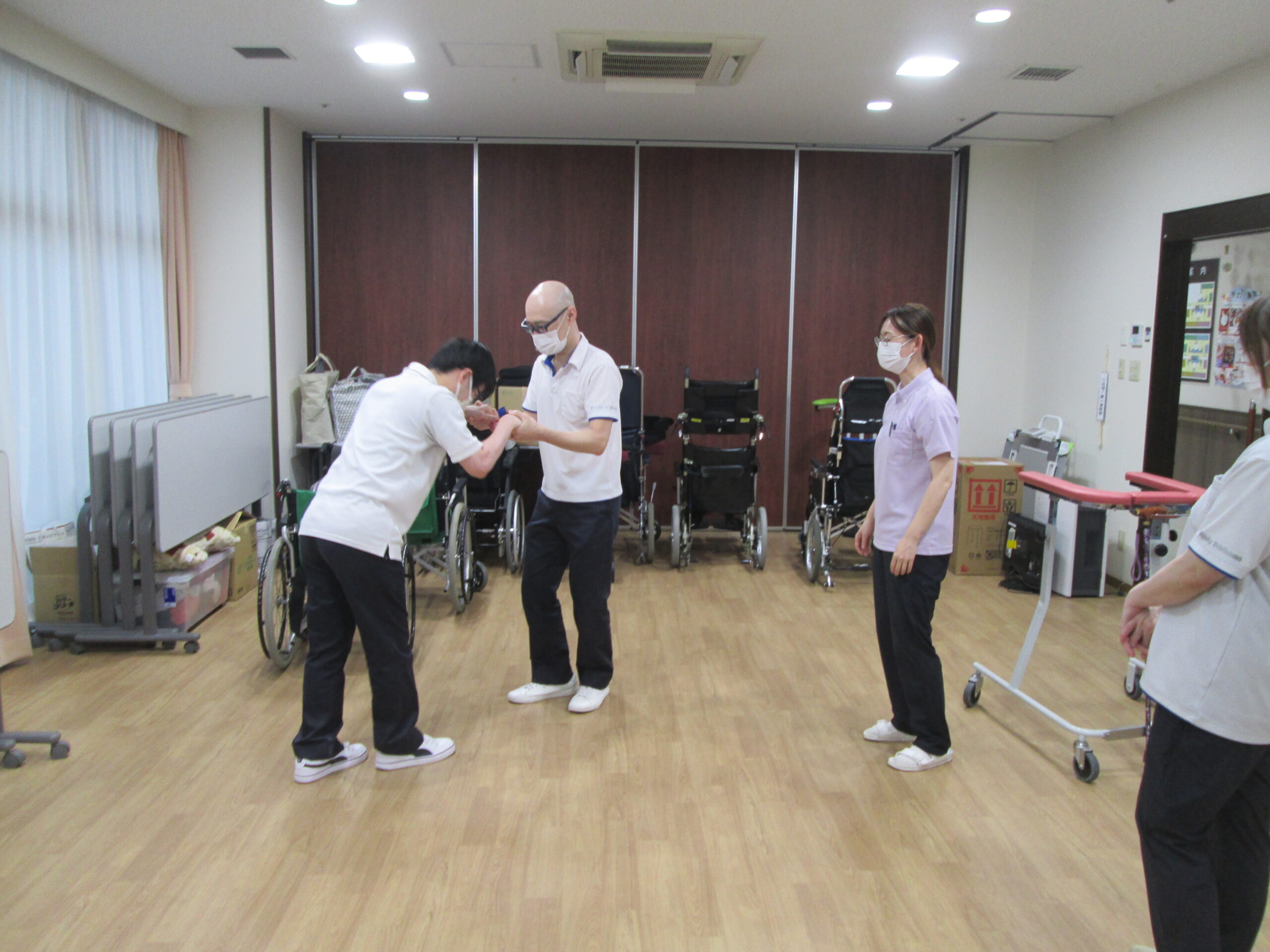 と、ディグニティ内浜では月に2回、和やかムードで真面目に介護研修しています。