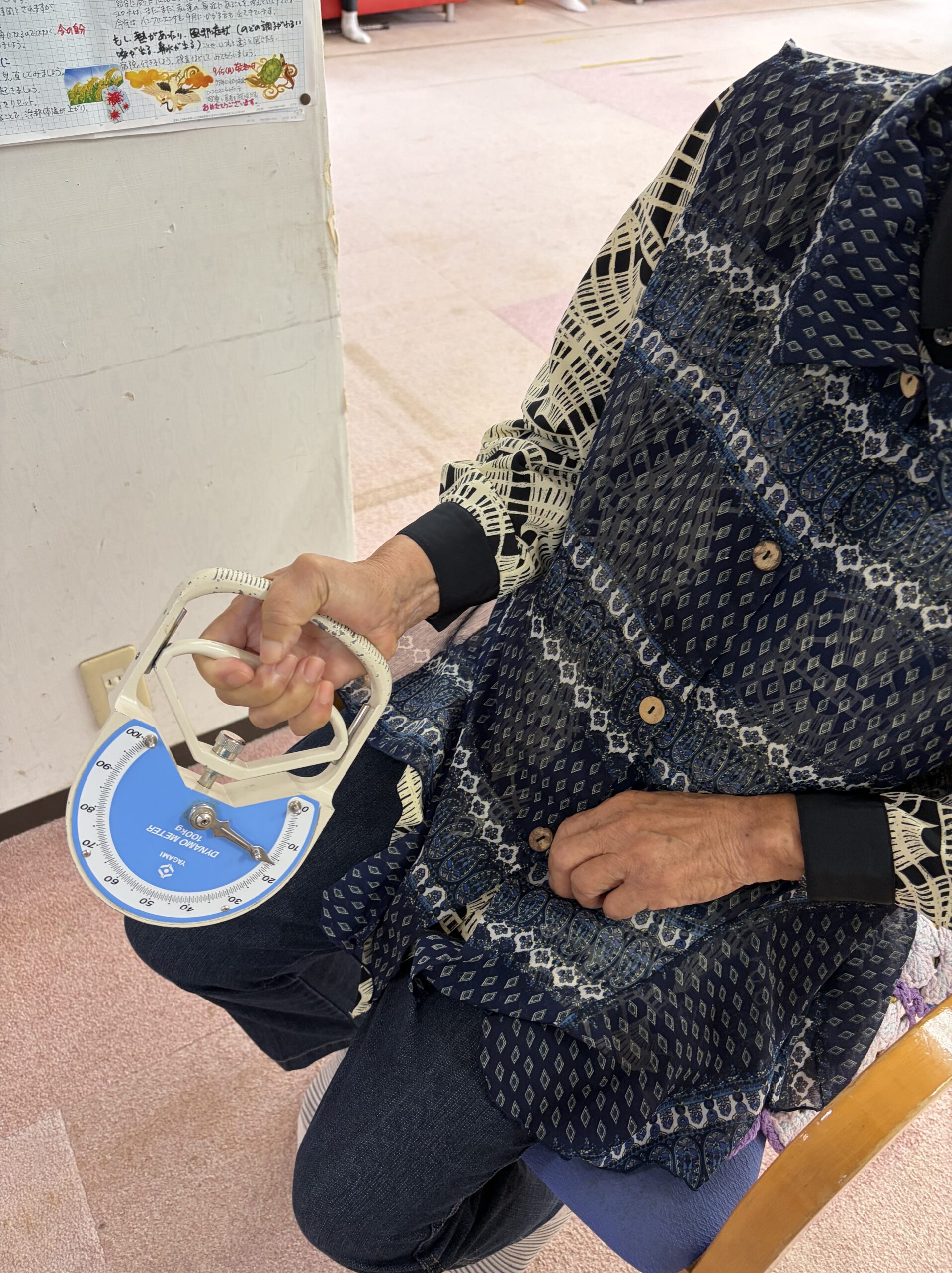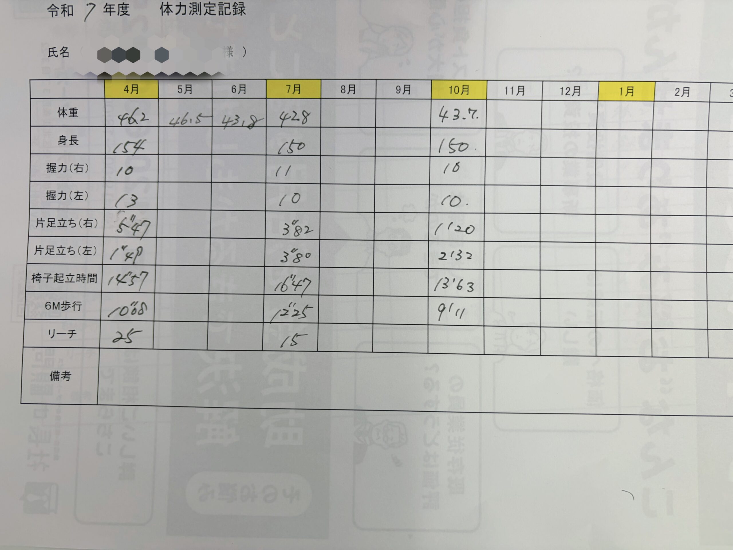 歩行や、握力・片足立ち・身長の変化などを把握するために行っています。