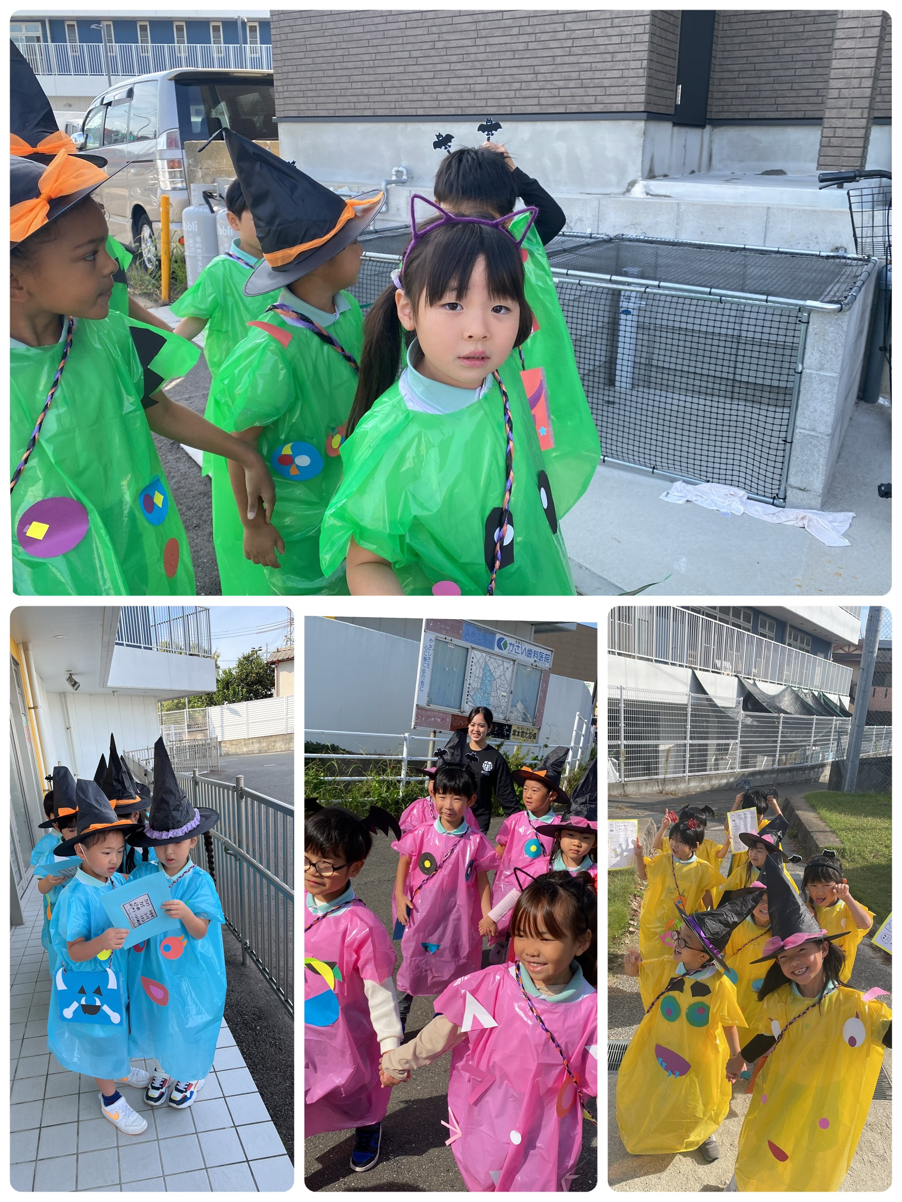 10月30日にハロウィンウォークラリーに行きました! 年長児の子ども達が保育園で衣装を手作りし仮装をしました。 この行事は地域の方々にも協力をお願いして交流を図ることも目的の一つです(*^-^*)
