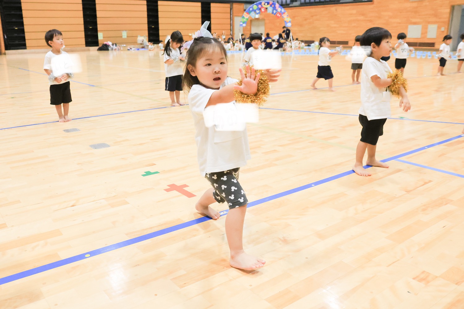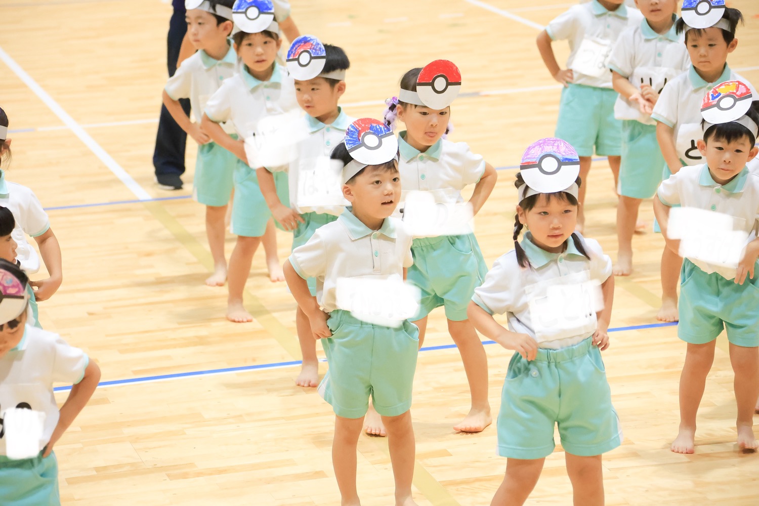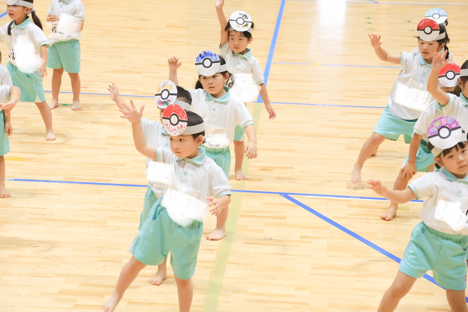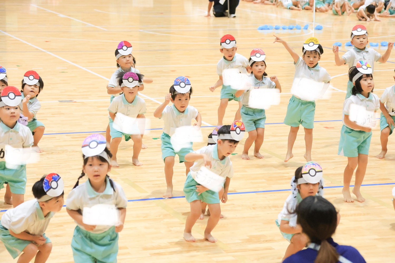 自分で作ったモンスターボールのお面をつけてノリノリで踊りました♪