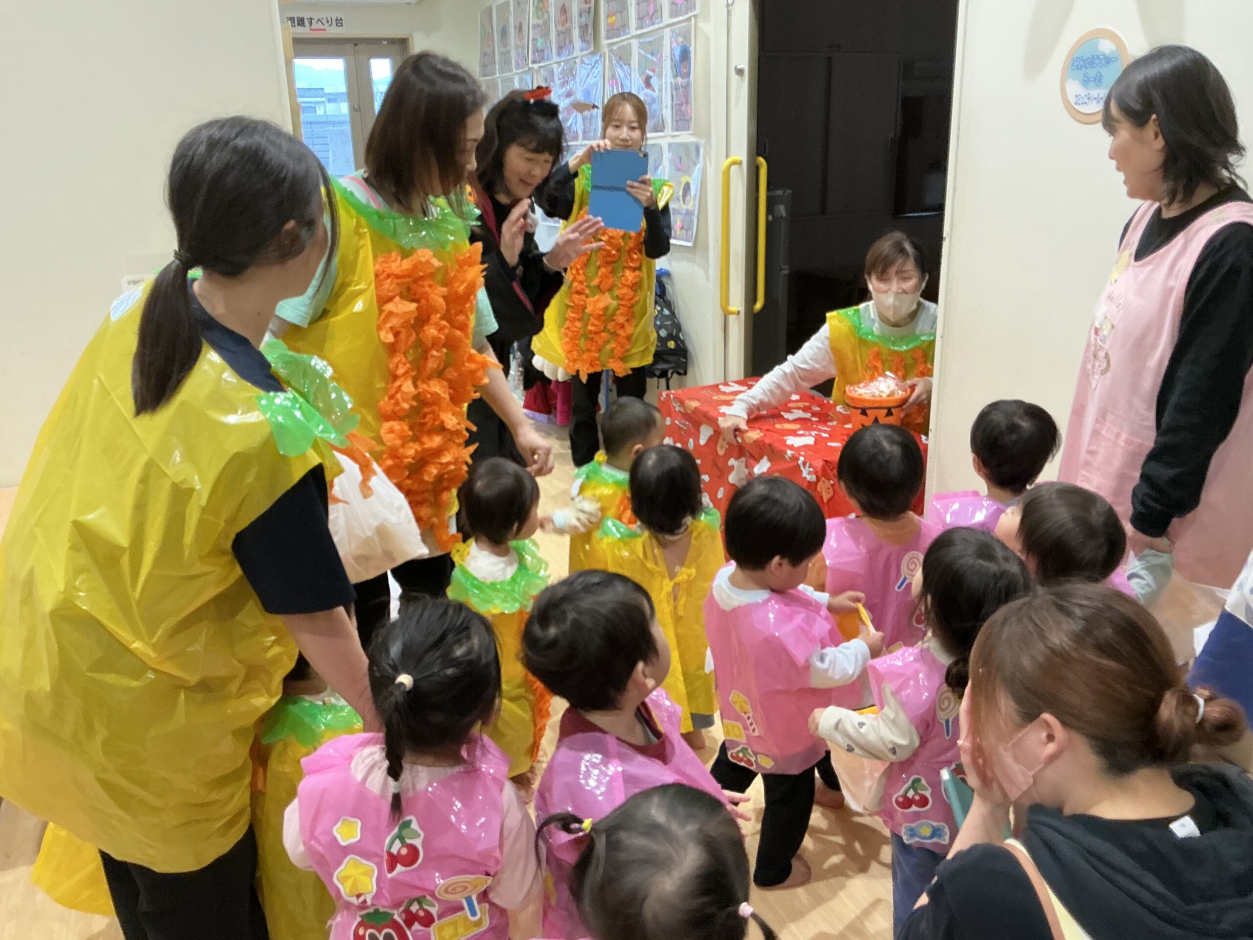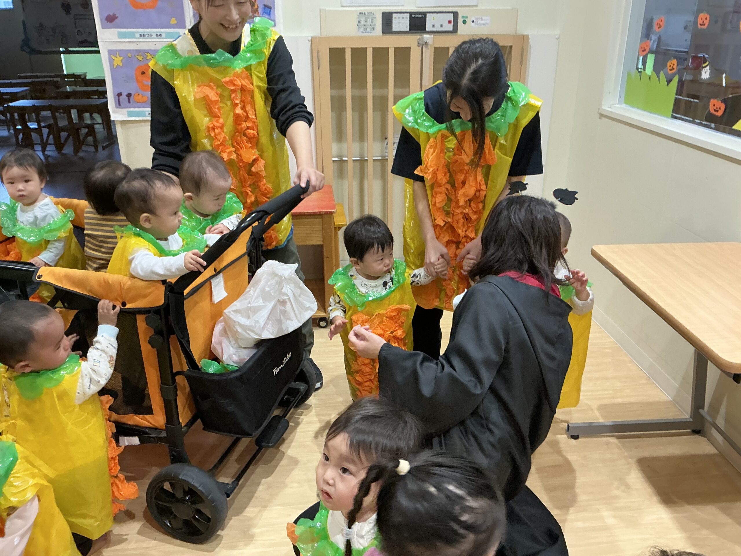 0歳児クラスほし組は、カボチャの衣装を着て園内をまわり、お菓子をもらいました😊胸に付いているオレンジの花紙は、子ども達が丸めました👏🏻