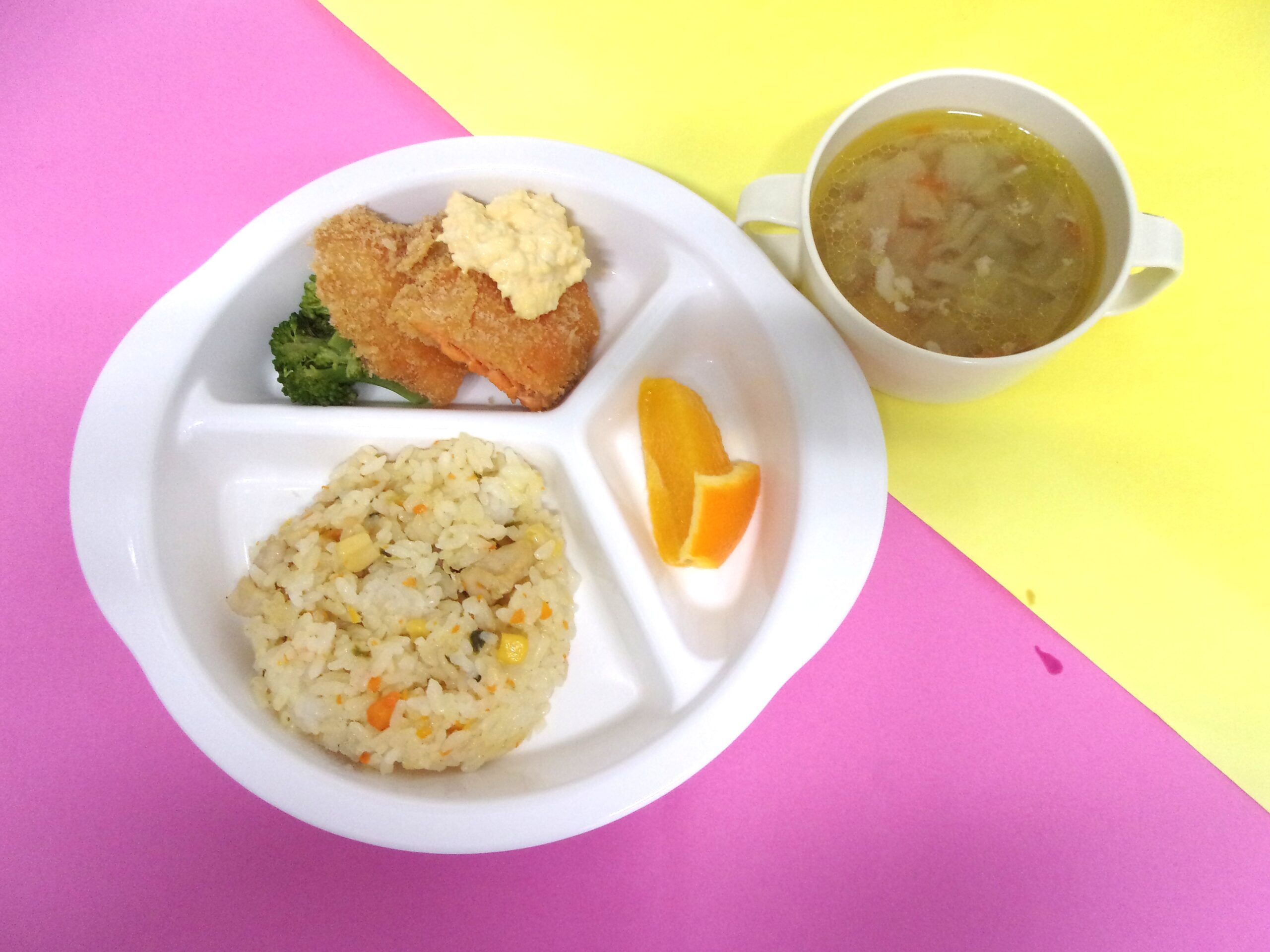 脂がのって美味しい鮭をメインにしました。魚をメインに⁉と思うかもしれませんが、保育園のこどもたちは魚料理が大好きです!魚屋さんがいつもおいしい魚を持って来てくださるおかげです。鮭フライも美味しくいただきました🍴