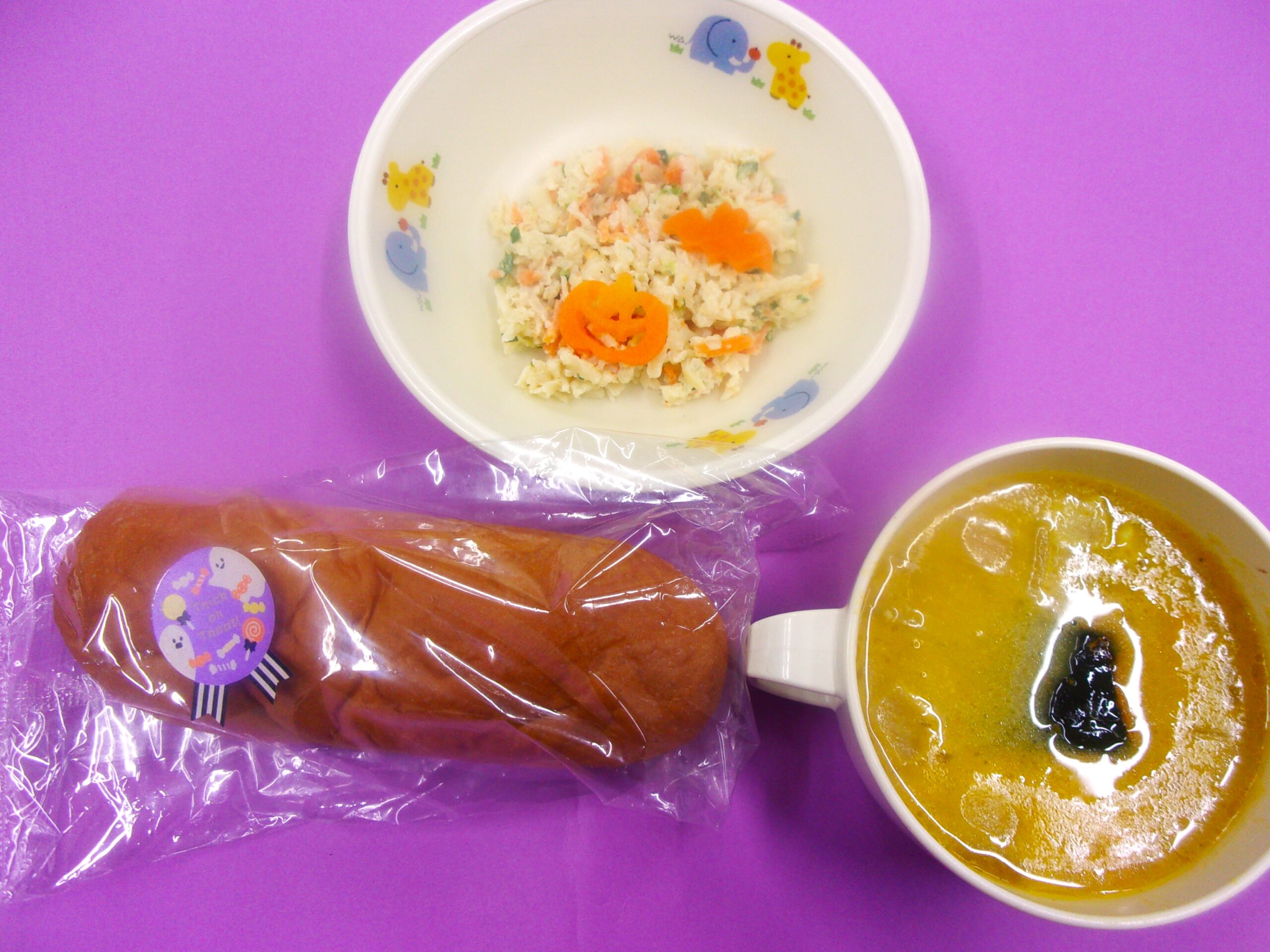 こども達が楽しみにしているハロウィン。給食室も頑張りました!にんじんをジャックオーランタン🎃と、こうもり🦇の型で抜いてトッピングしました♪パンはいつもと違う紫芋のパンで、中がほんのり紫色です。シールを貼って雰囲気を出しました。こどもたちはハロウィン給食を喜んでおり、型抜きの疲れも吹っ飛びました。