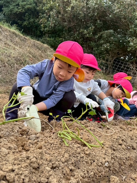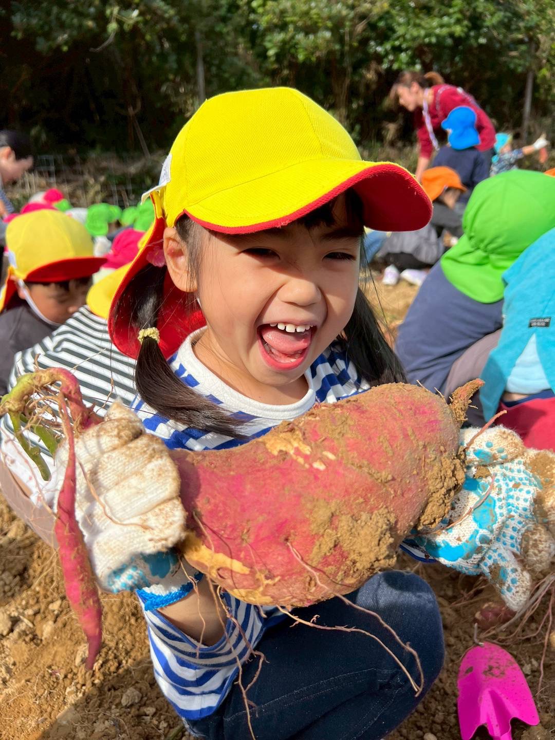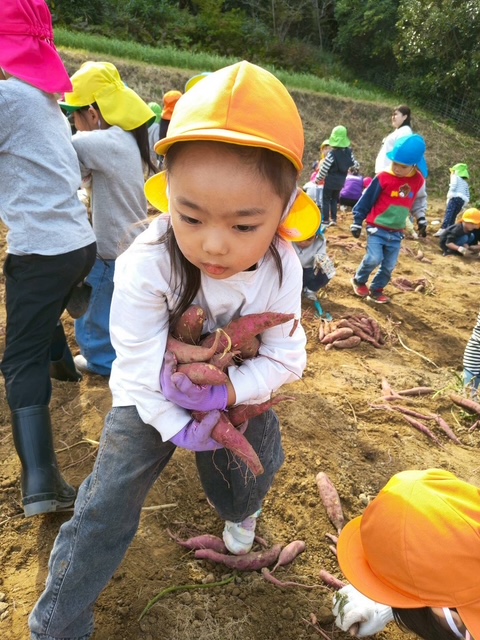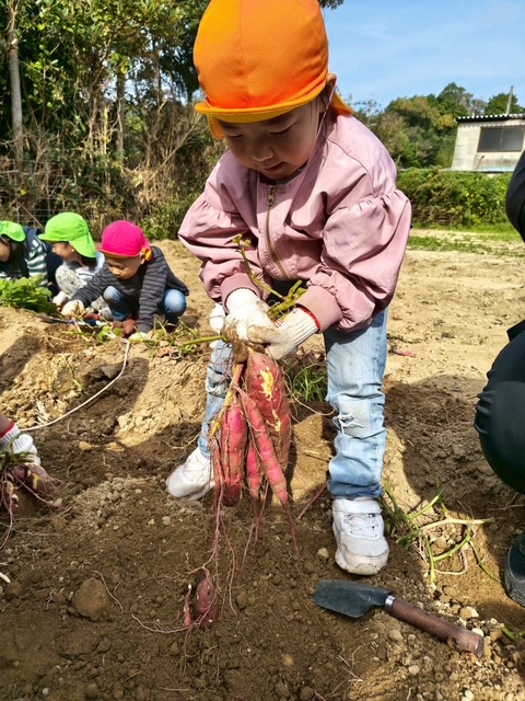 掘った芋は本人が持って帰られると思って掘る場所掘る場所に、芋を持って移動するNちゃん。