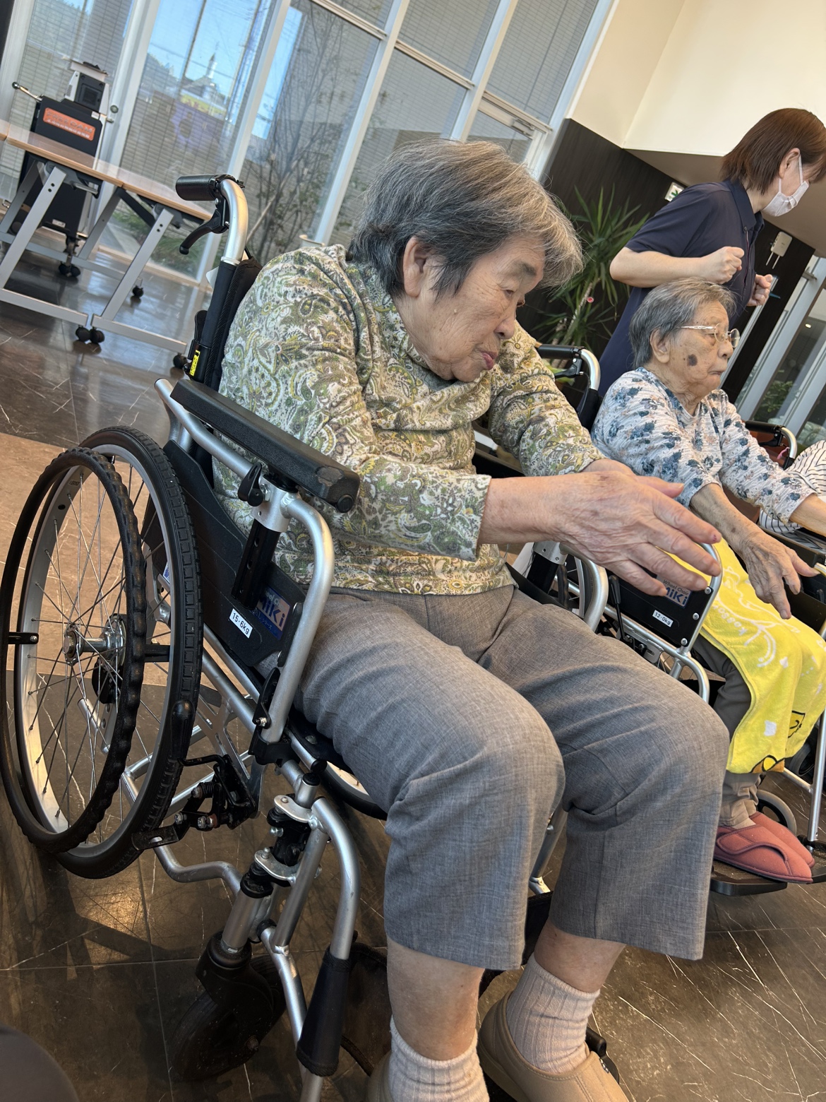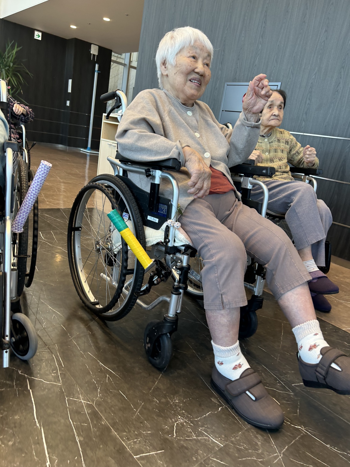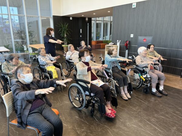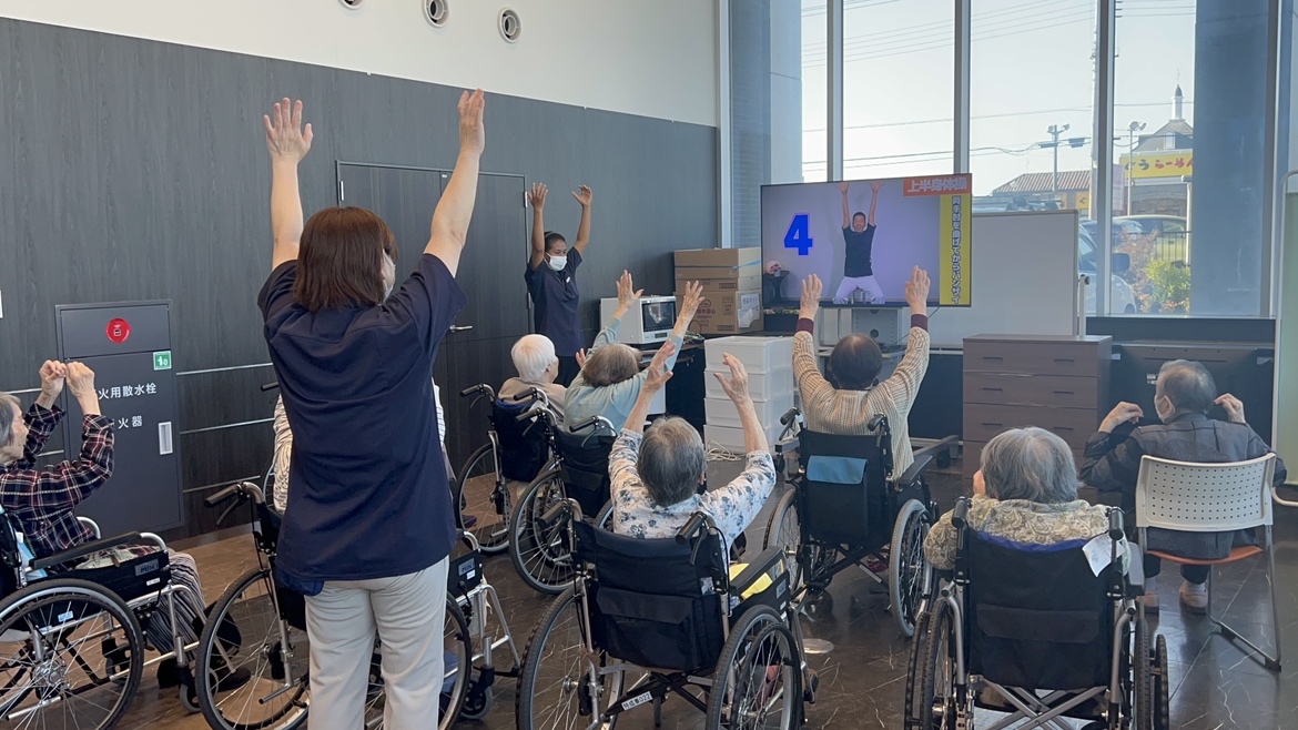 K様「これであってる?」とご自分が体操している様子を職員へ確認しながら、