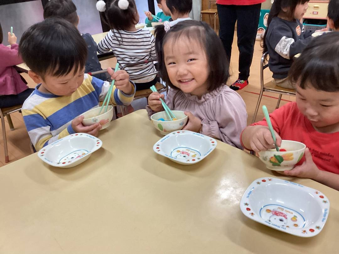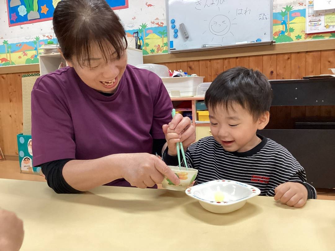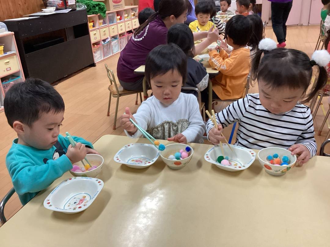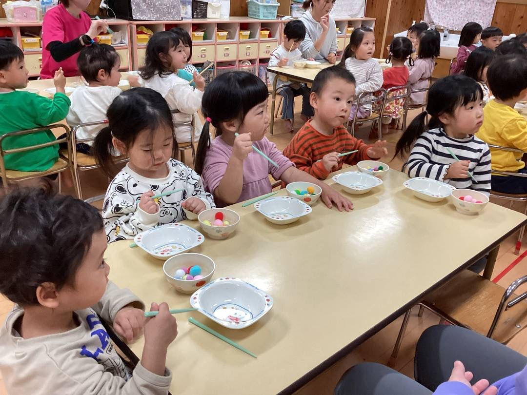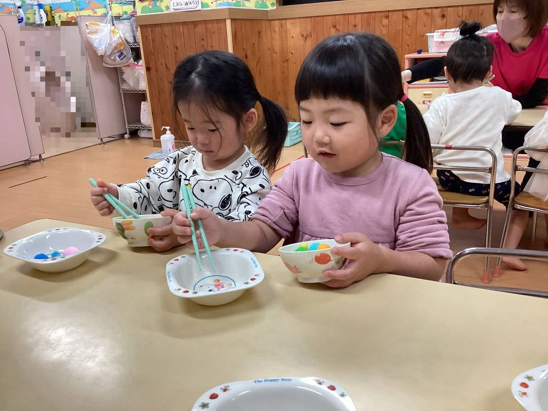 箸使いは、保育園の給食時だけではうまく持てませんので、ご家庭の方にも箸の持ち方に気をつけて