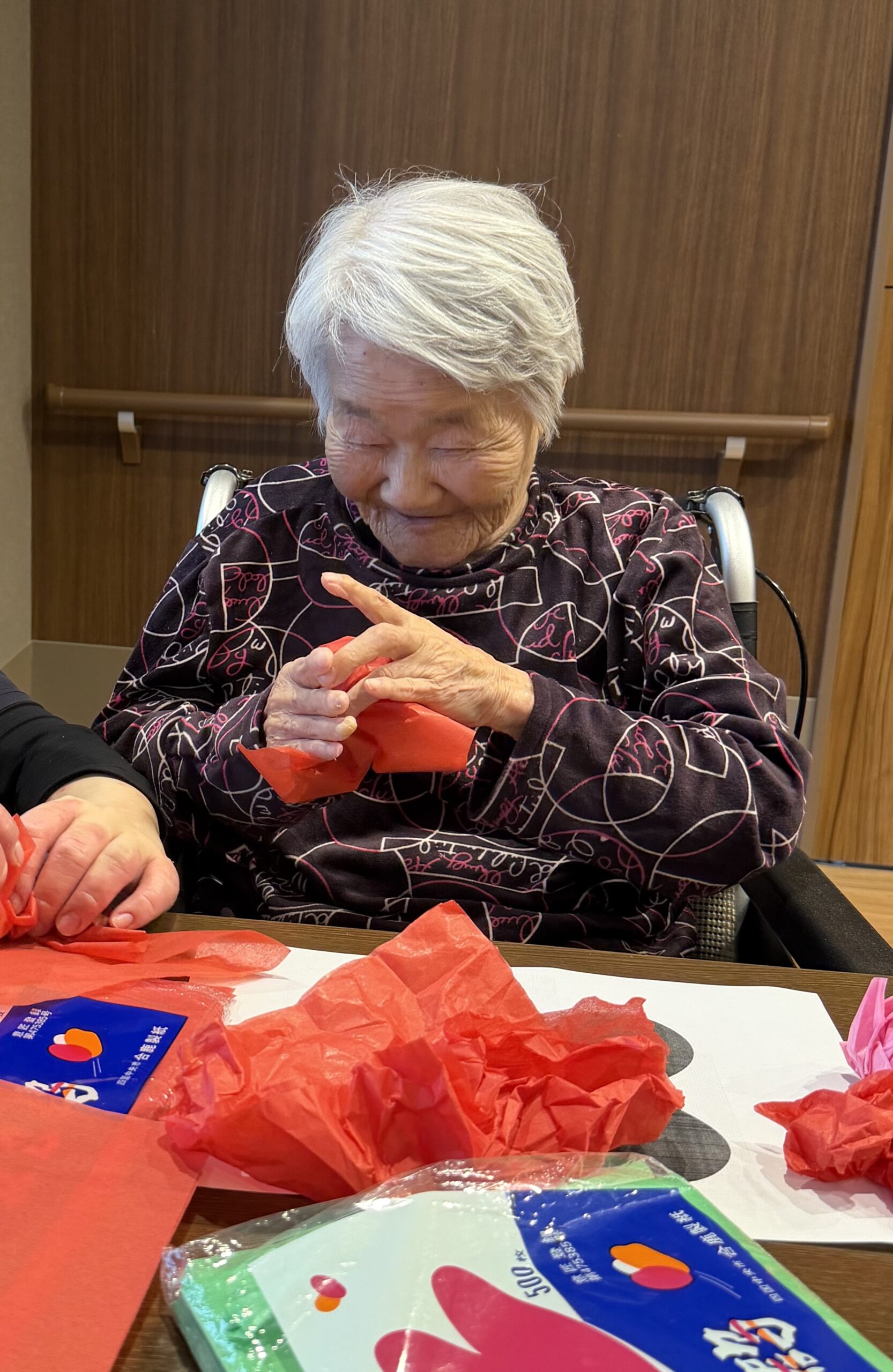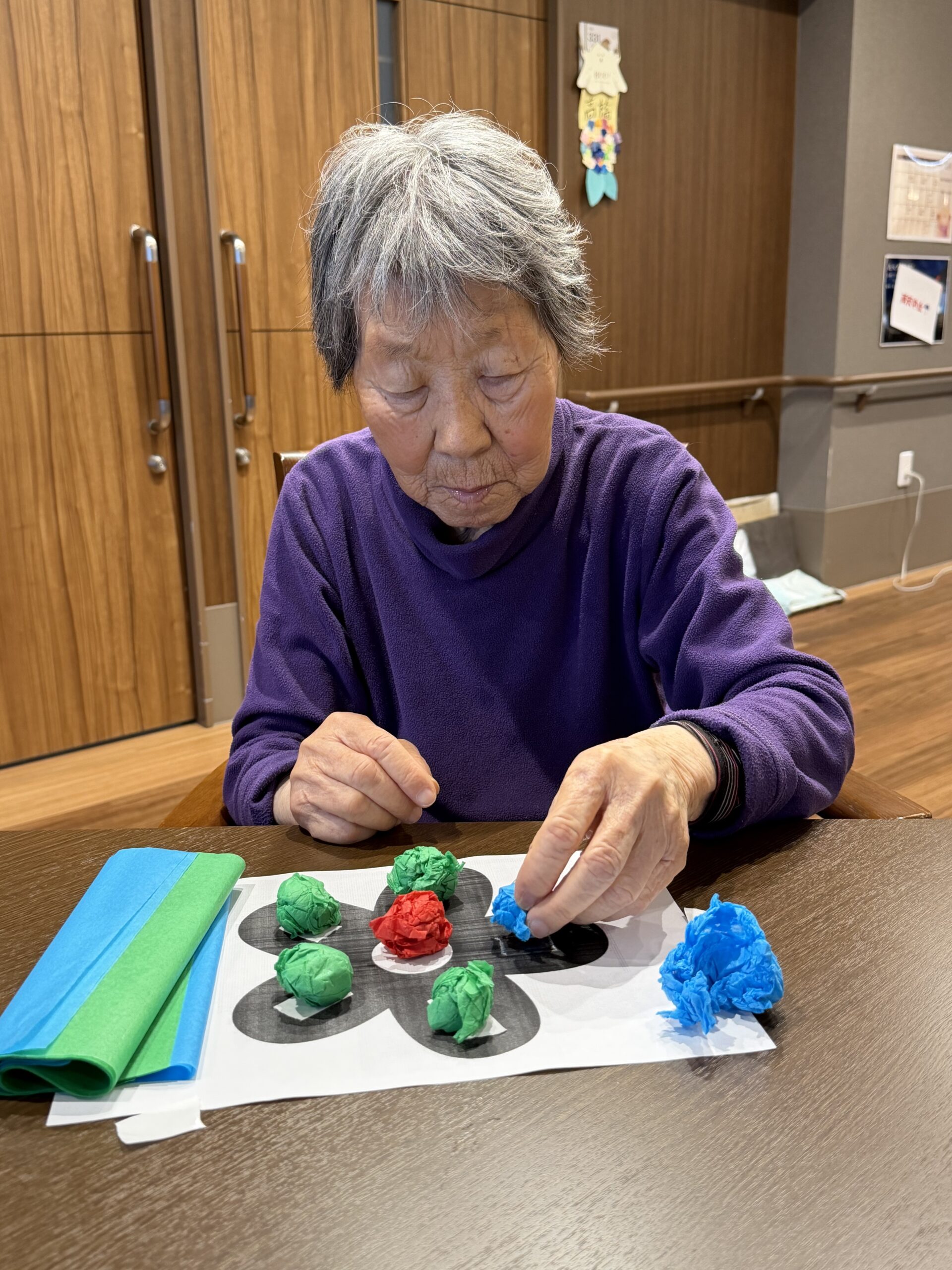周りの利用者様が作り始めると、自らお花紙に手を伸ばされ、集中して作品作りに参加して下さいました。