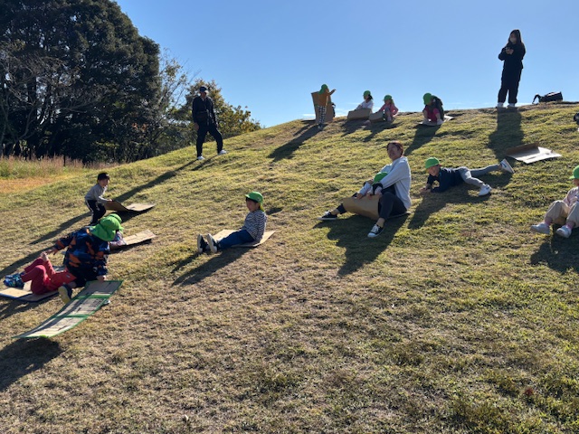 段ボールで手作りしている板で、みんな上手でお友だちと一緒に座って滑ったり、先生たちと滑ったり、自然を満喫していました!