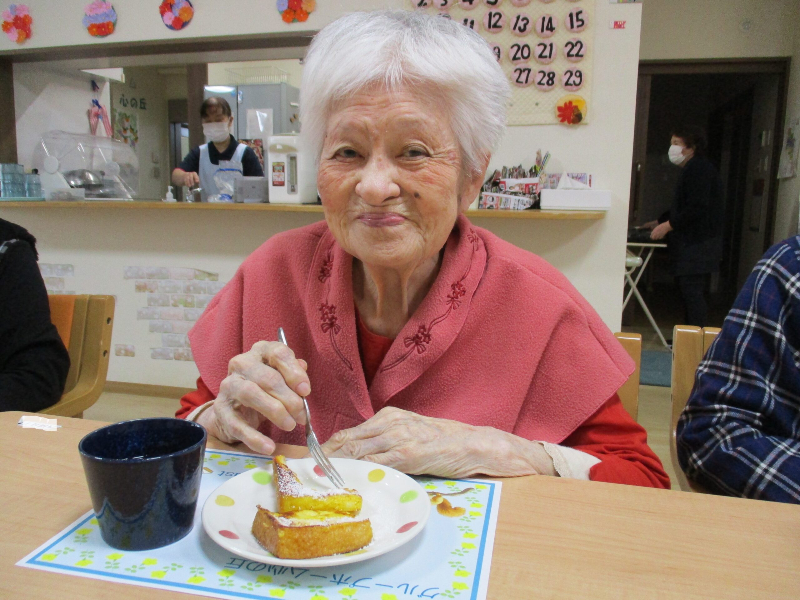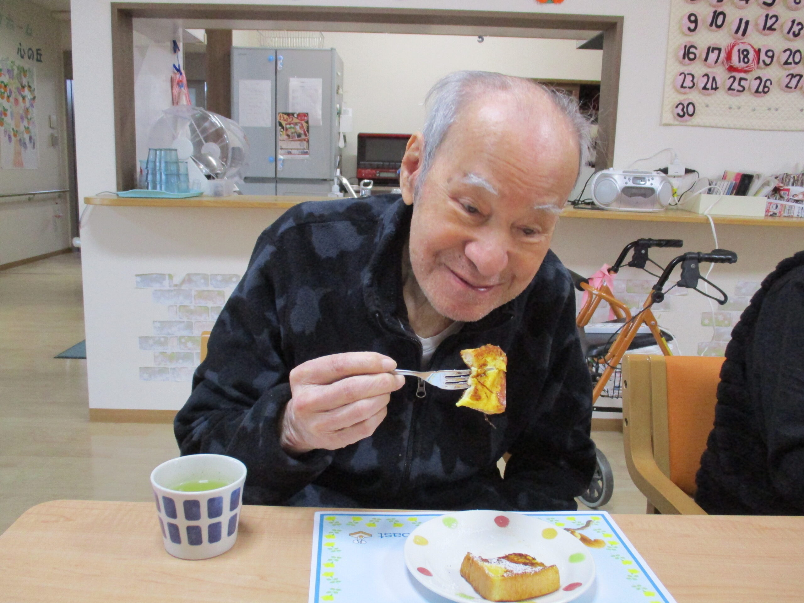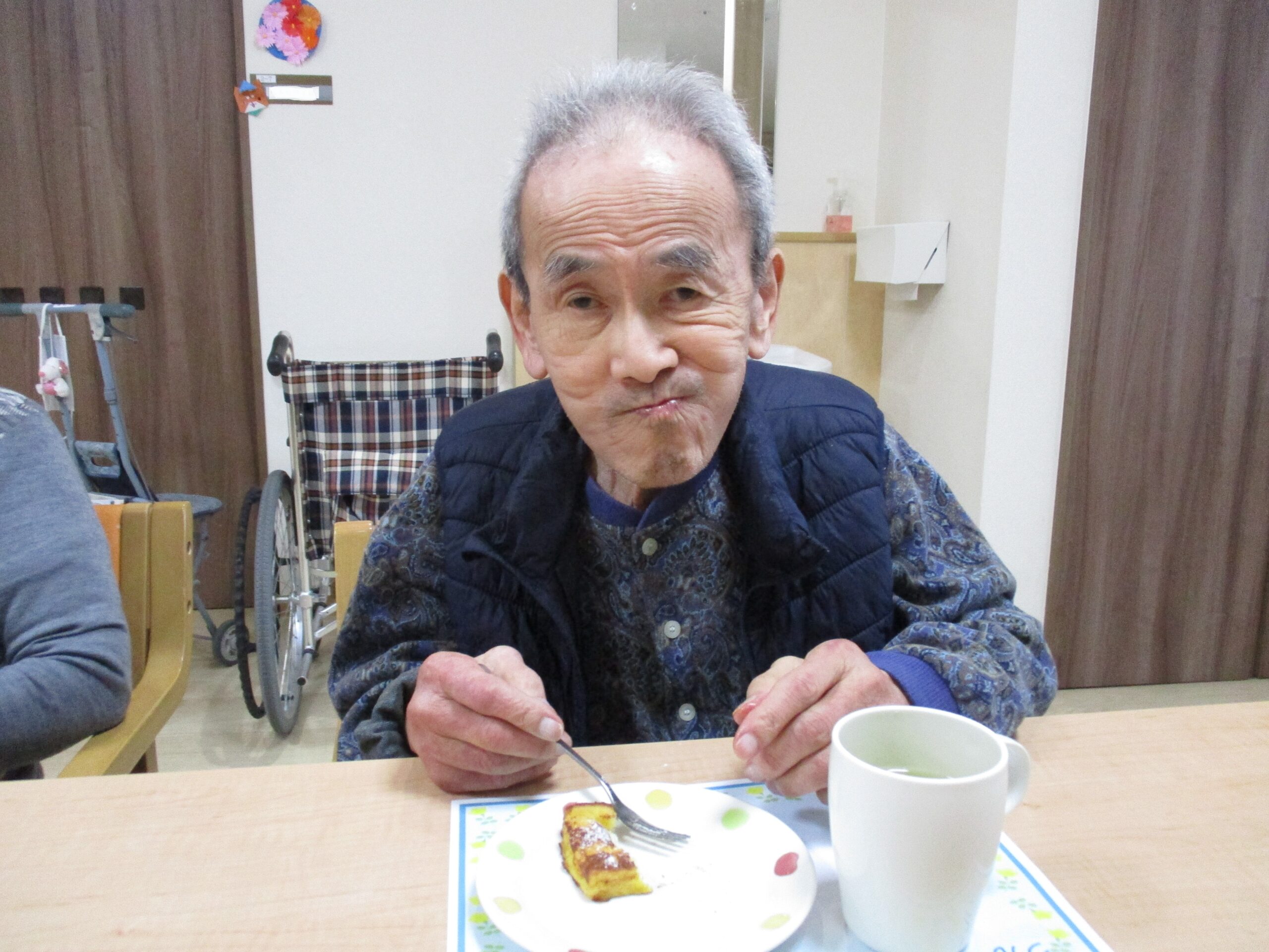ほおばる寸前に笑顔を求められ、戸惑うご入居者様😅
