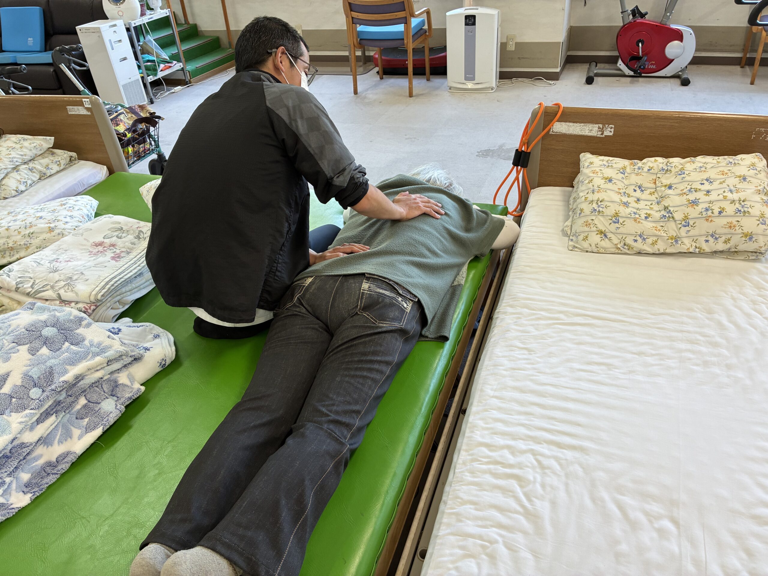 ベッドサイドでの関節可動域訓練、腰背部リラクゼ―ションをしている様子です。