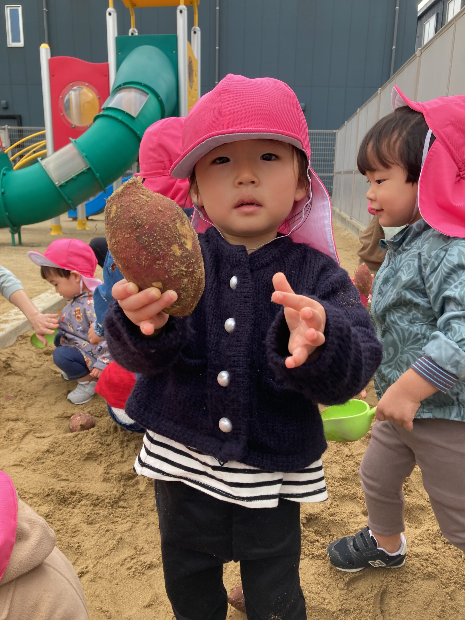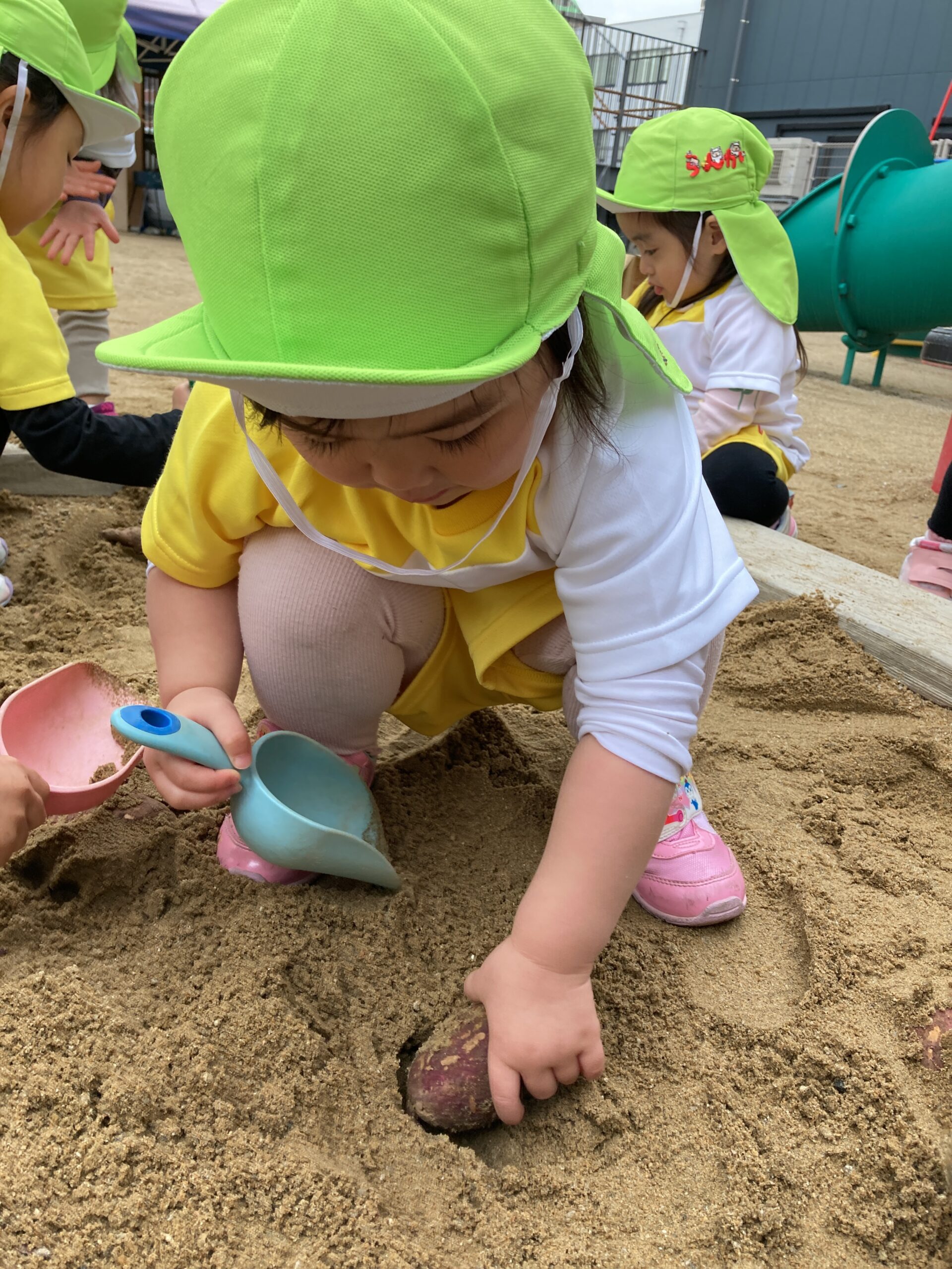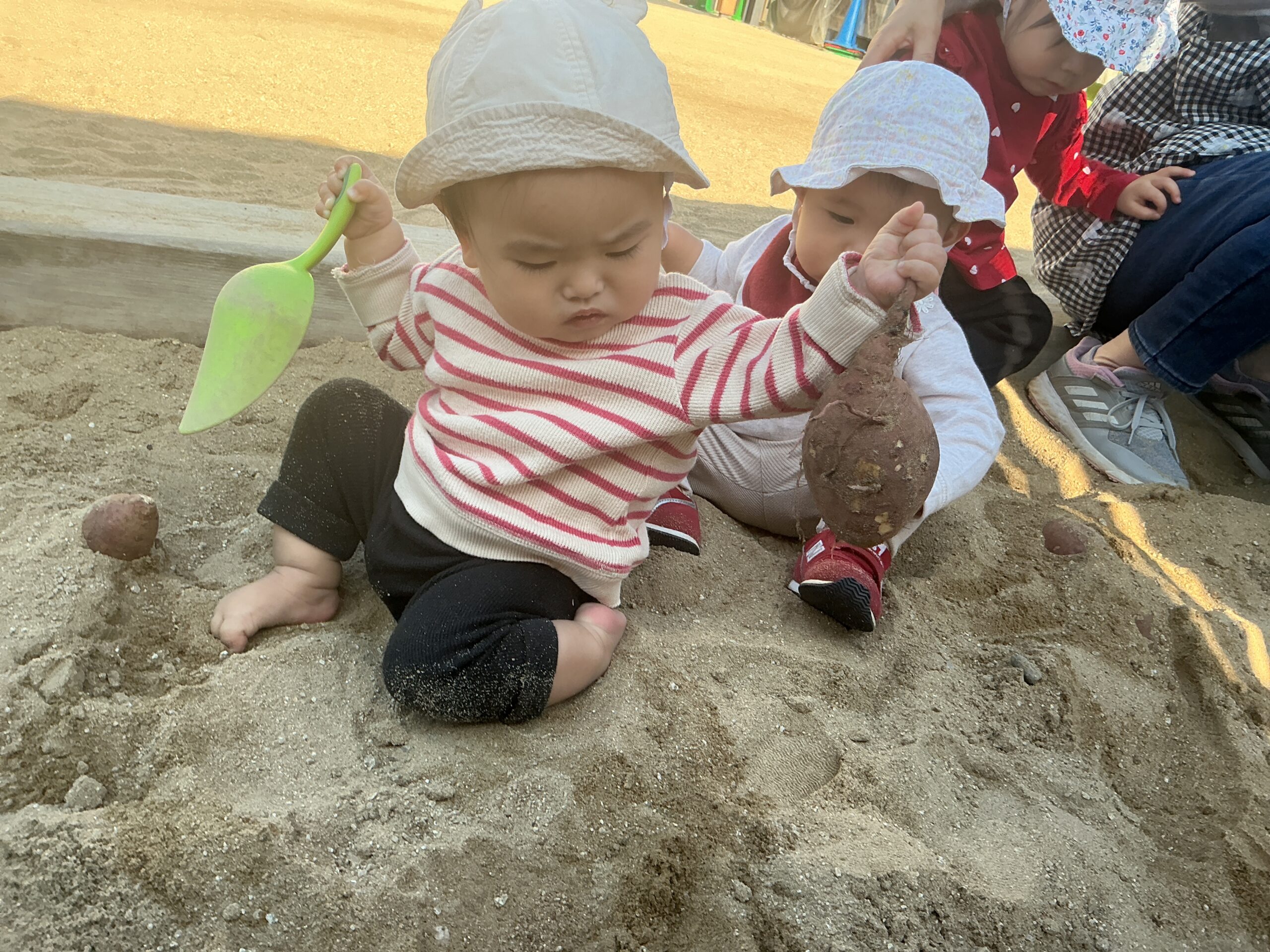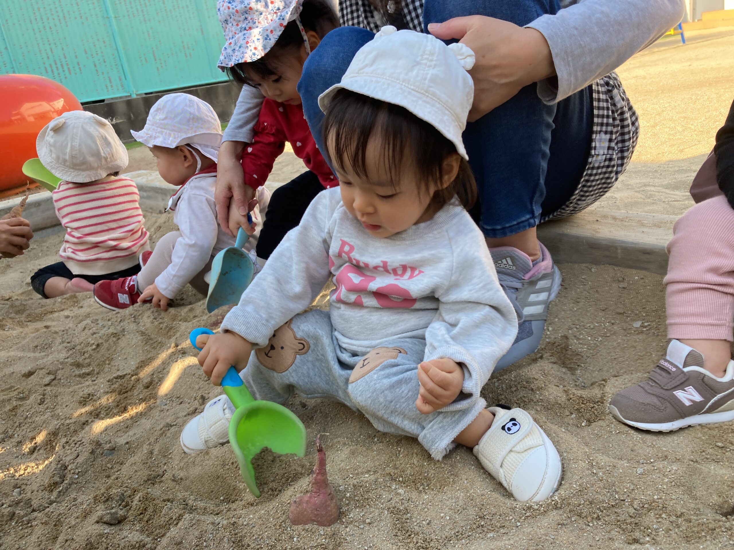 以上児さんの芋ほり大会に続いて、未満児さんも保育園の砂場を使用して、