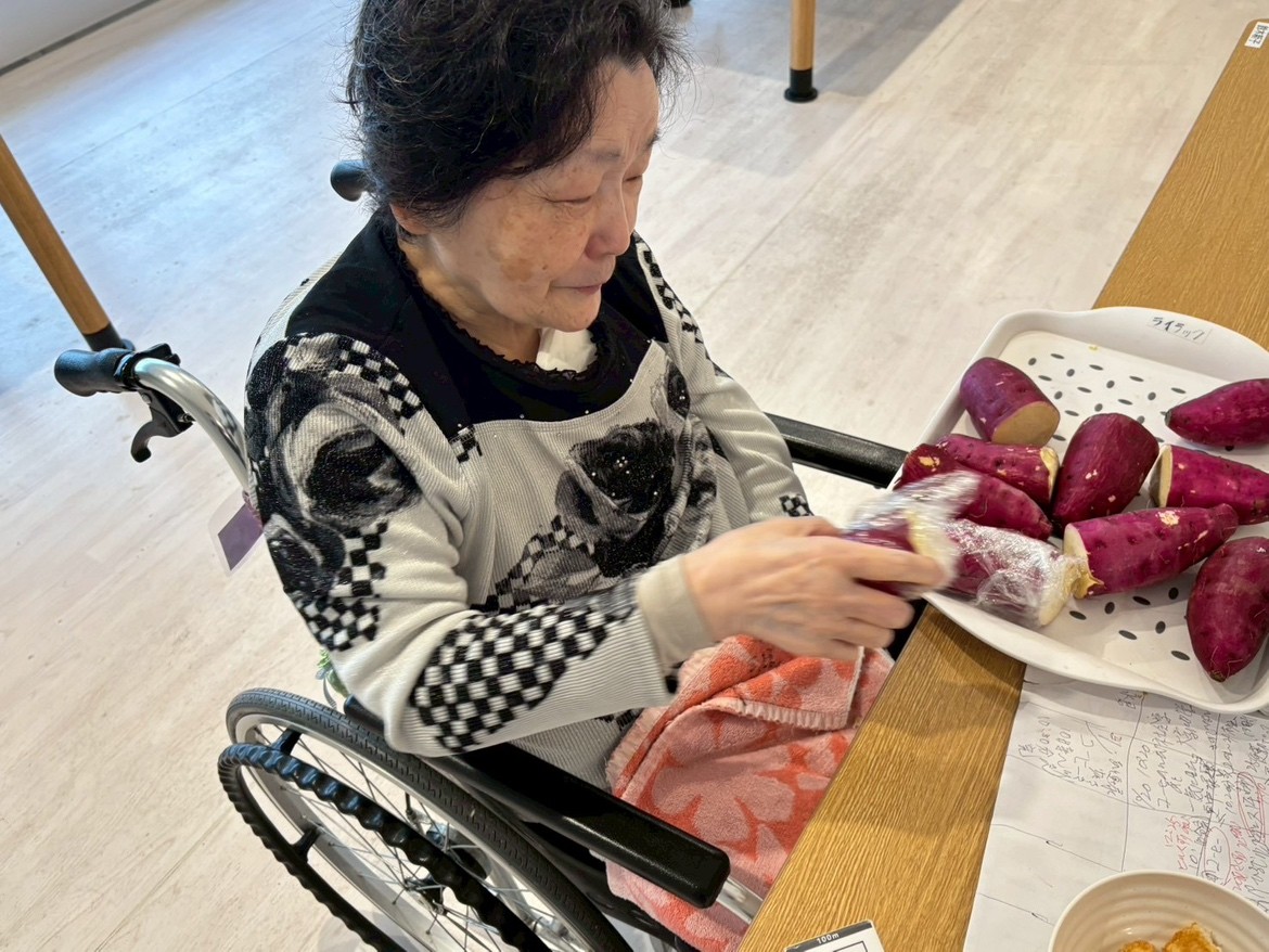 1つ1つ丁寧にさつま芋をラップに包み、嬉しそうな表情で職員に話しかけられる利用者様もいました。