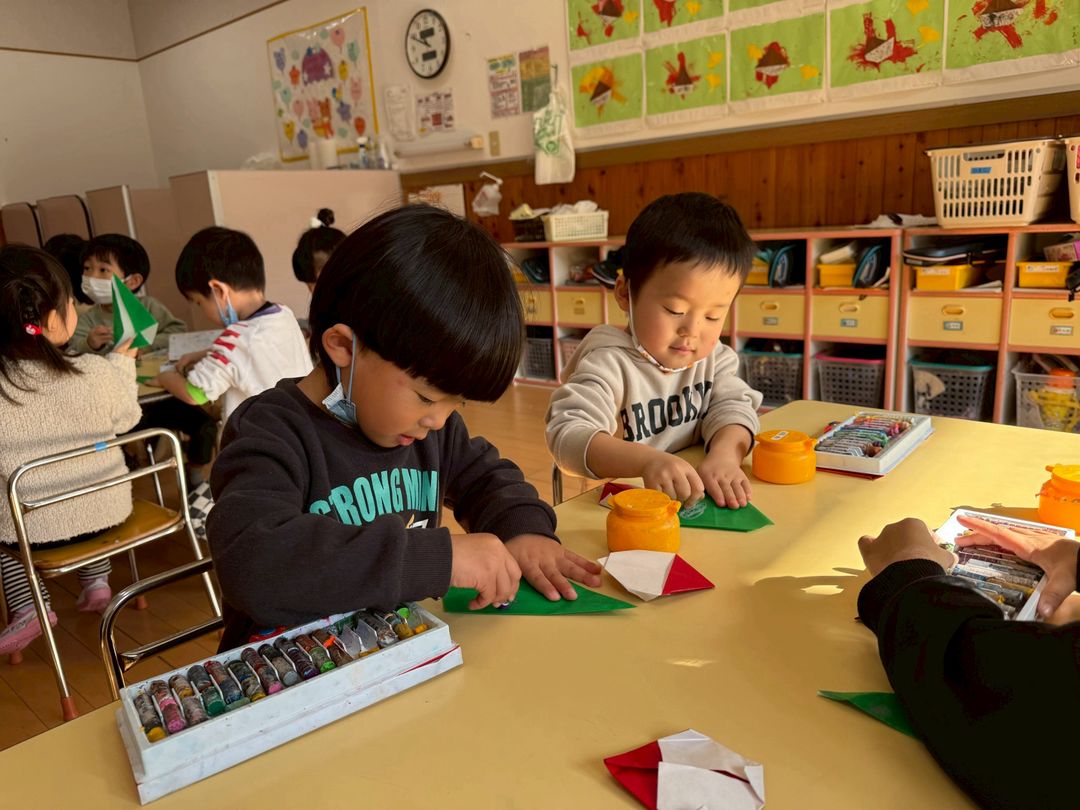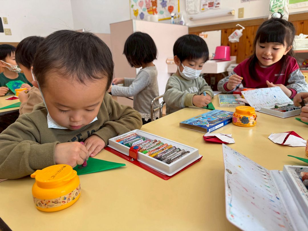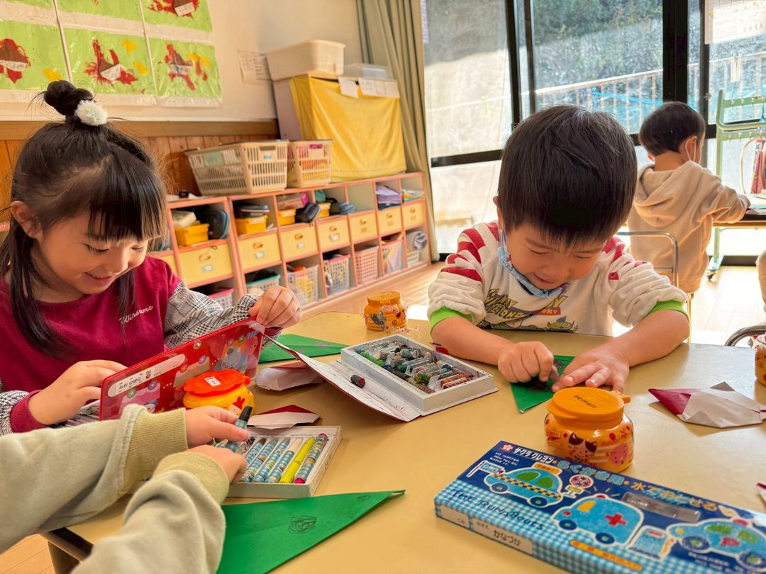 3歳児ひまわりA、C組の12月の製作の様子です。