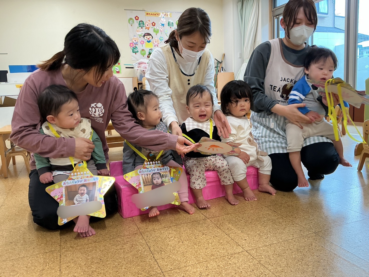 27日に11月のお誕生会がありました。今回は0、1歳児のお友達と2〜5歳児のお友達に分かれて行いました。