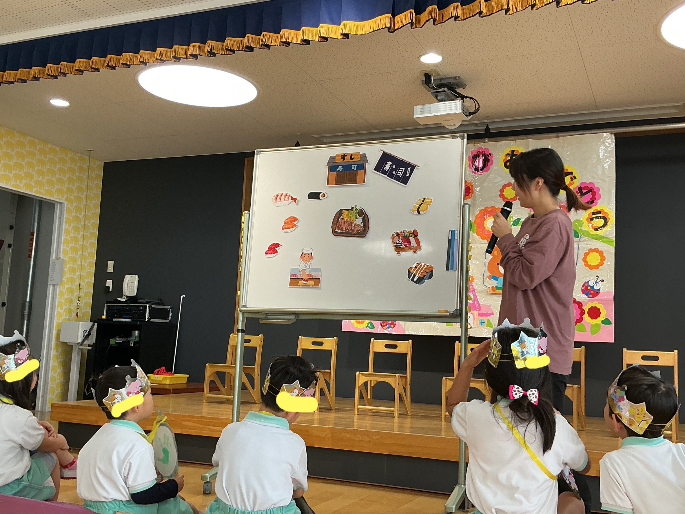 先生が色んな巻き寿司をお誕生日のお友達に「へい、おまち〜」と出すと、笑顔で喜んでいましたよ!「次は何が巻かれているかな〜」と皆で考えながら盛り上がり、とても楽しい誕生会になりました。