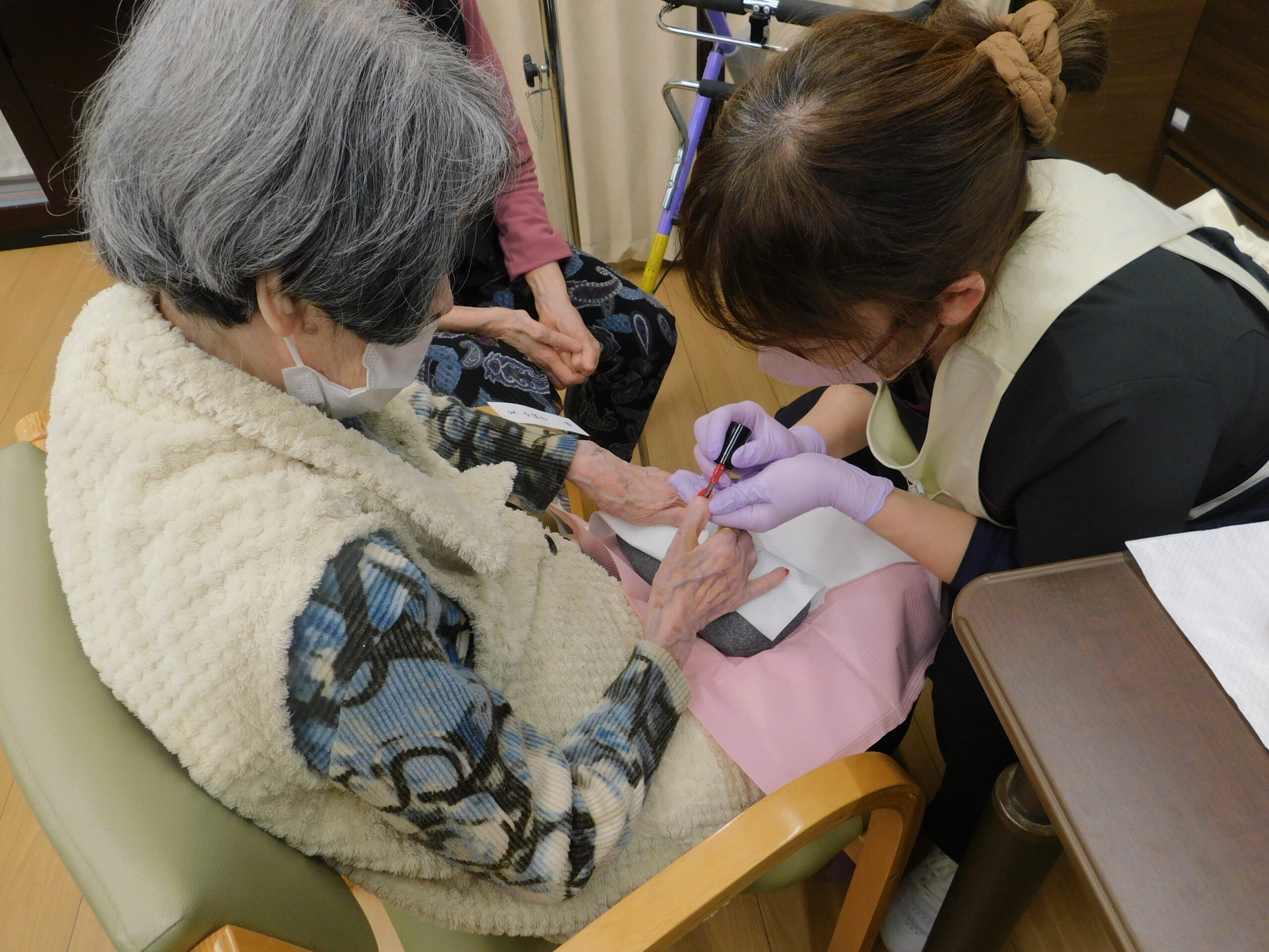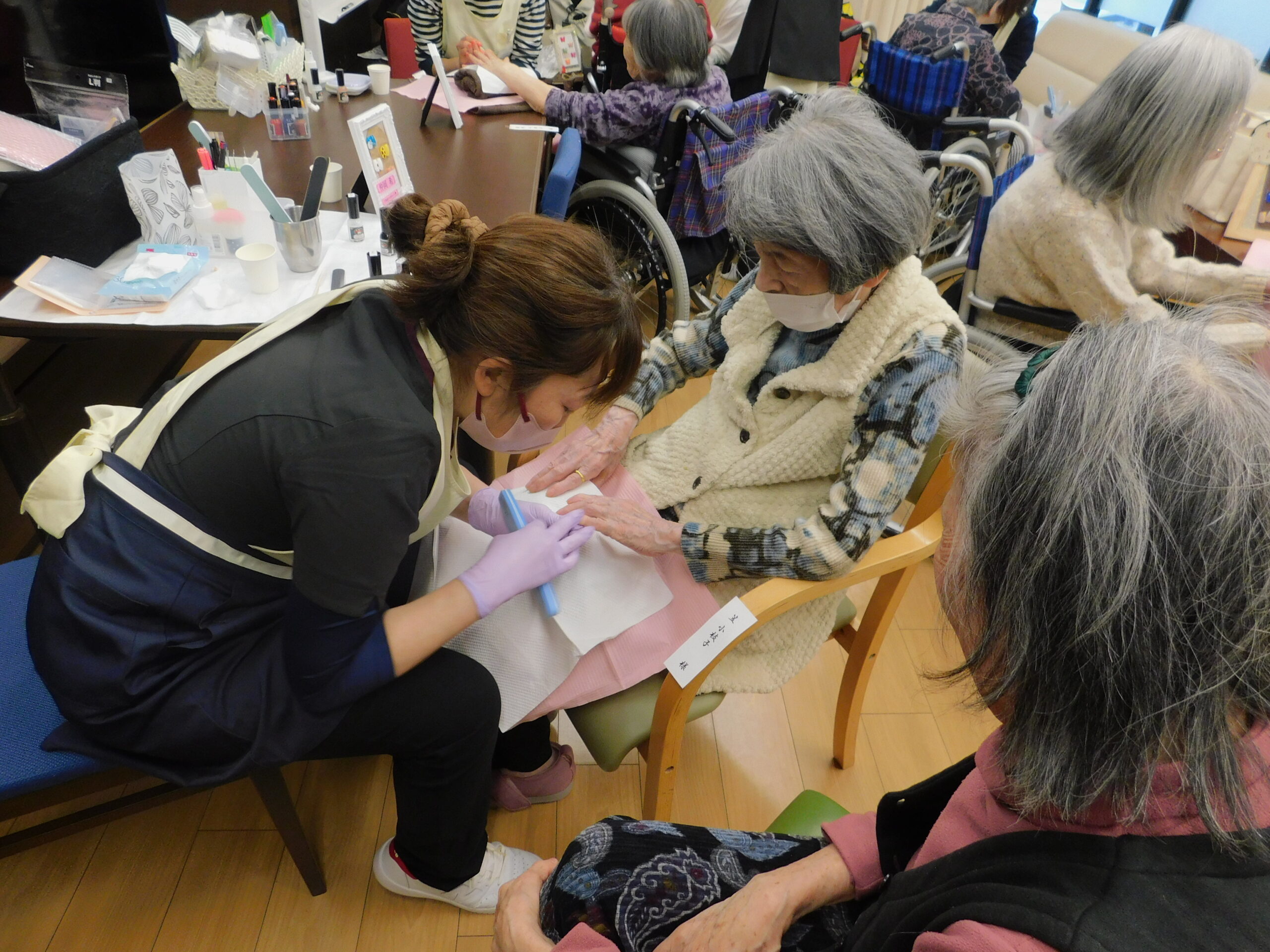 会話をしながら爪を削ったり、磨いたりして頂いています。