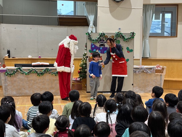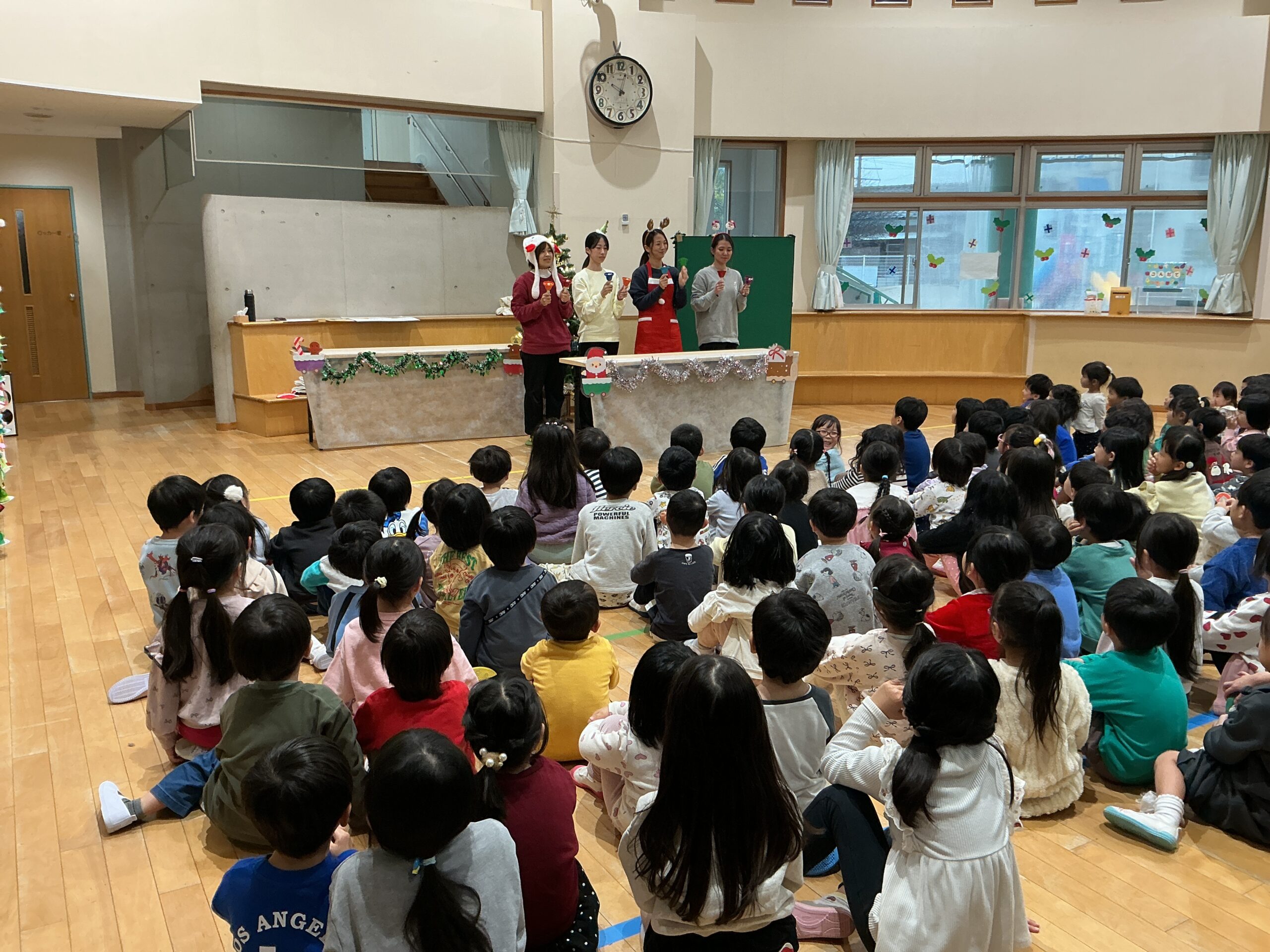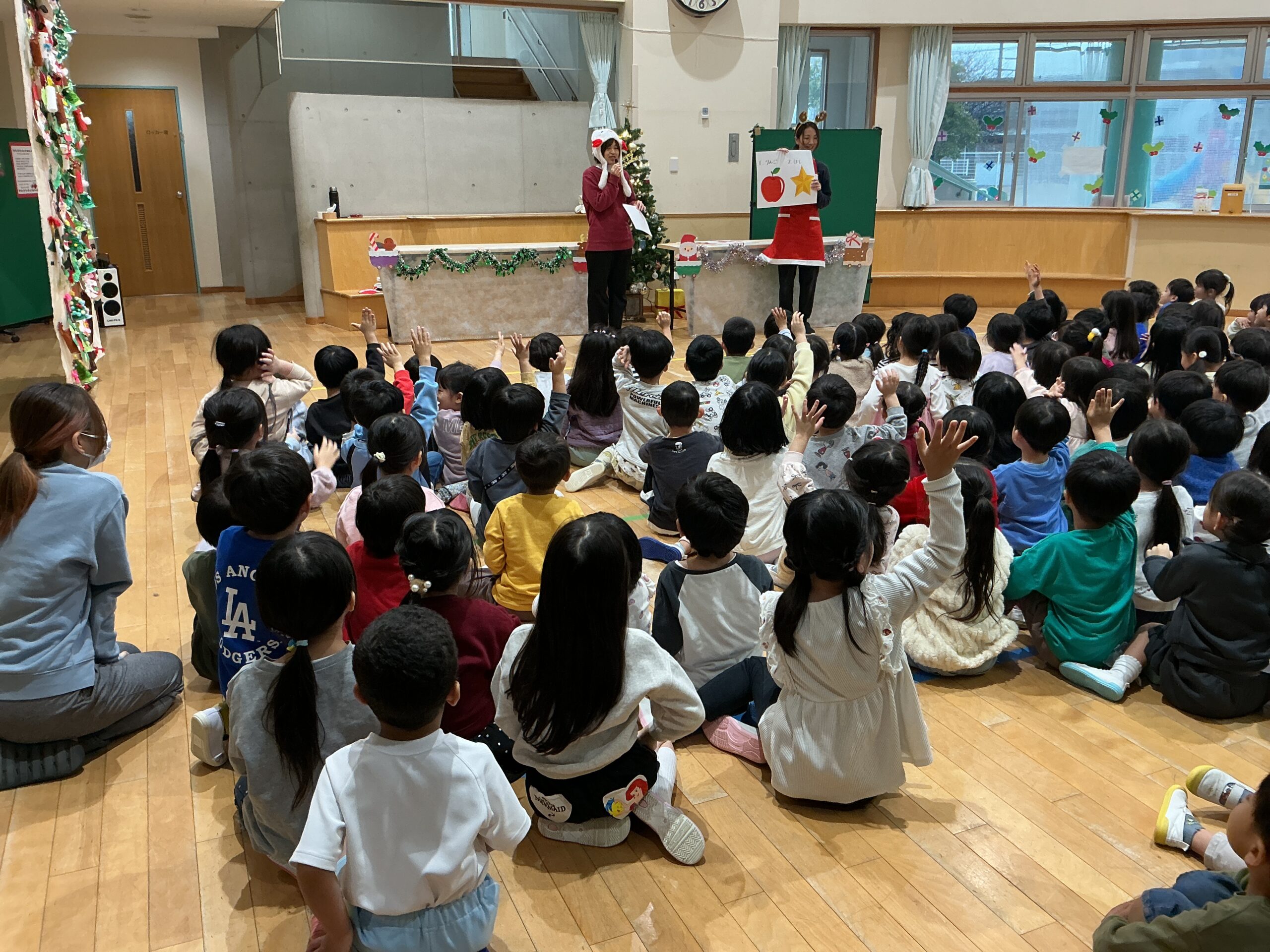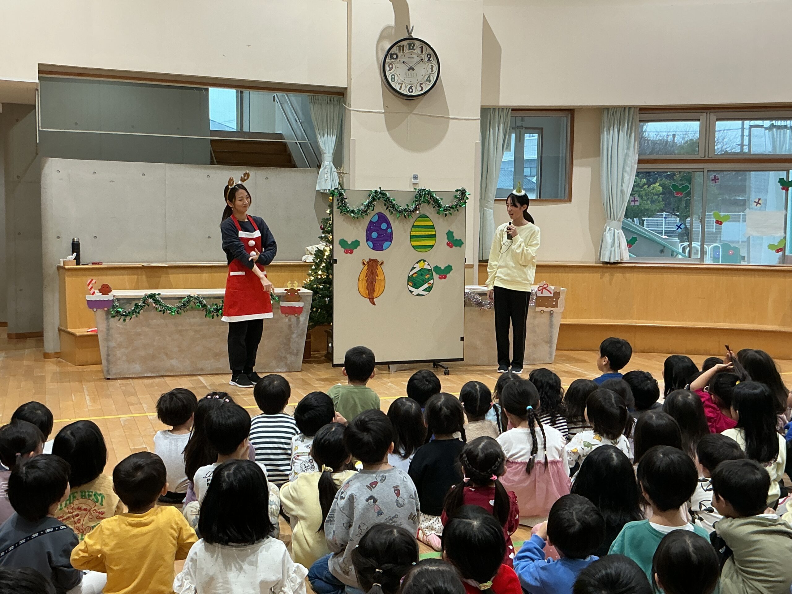 クリスマスツリーの上にはなにが乗っているでしょう?のクイズや、『まあるいたまご』のパネルシアターで、たまごの中からなにがでてくるかな~で、みんな大きな声で答えてくれていました。