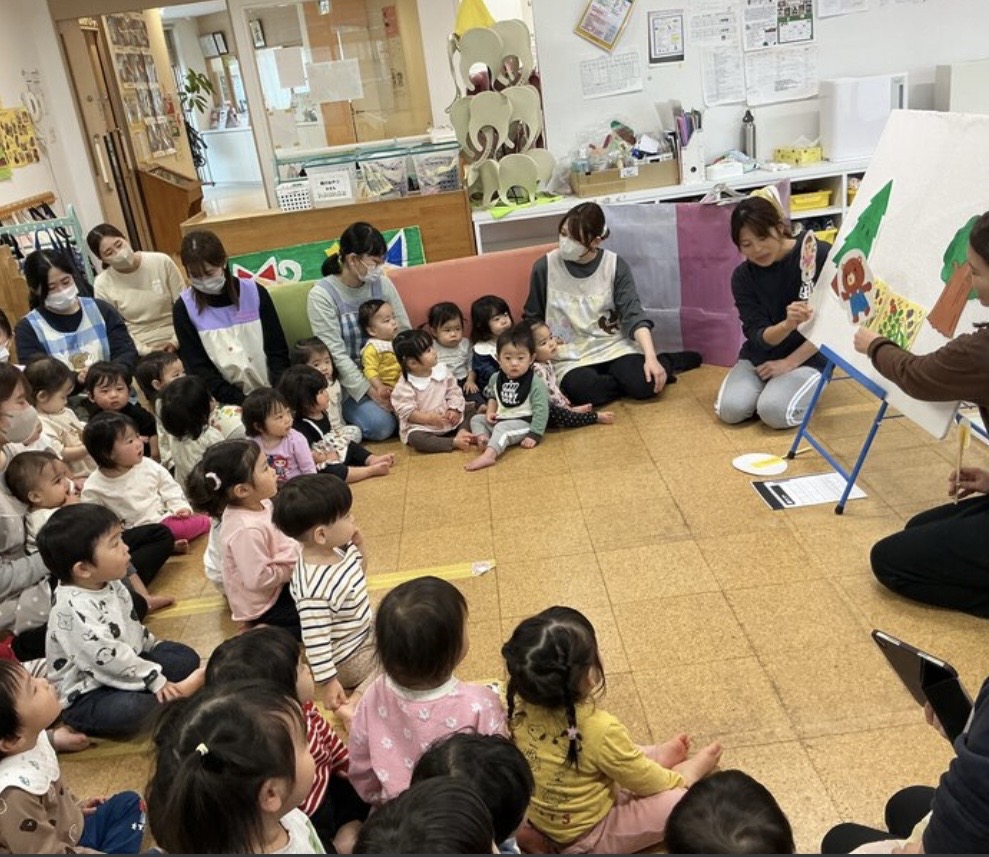 森のクマさんのペープサートや幸せなら手をたたこうのパネルシアター合わせて歌を歌って楽しみました♪幸せなら手をたたこうでは、歌に合わせて手をたたいたり、足を鳴らしたりするのが上手なお友だちでしたよ^_^