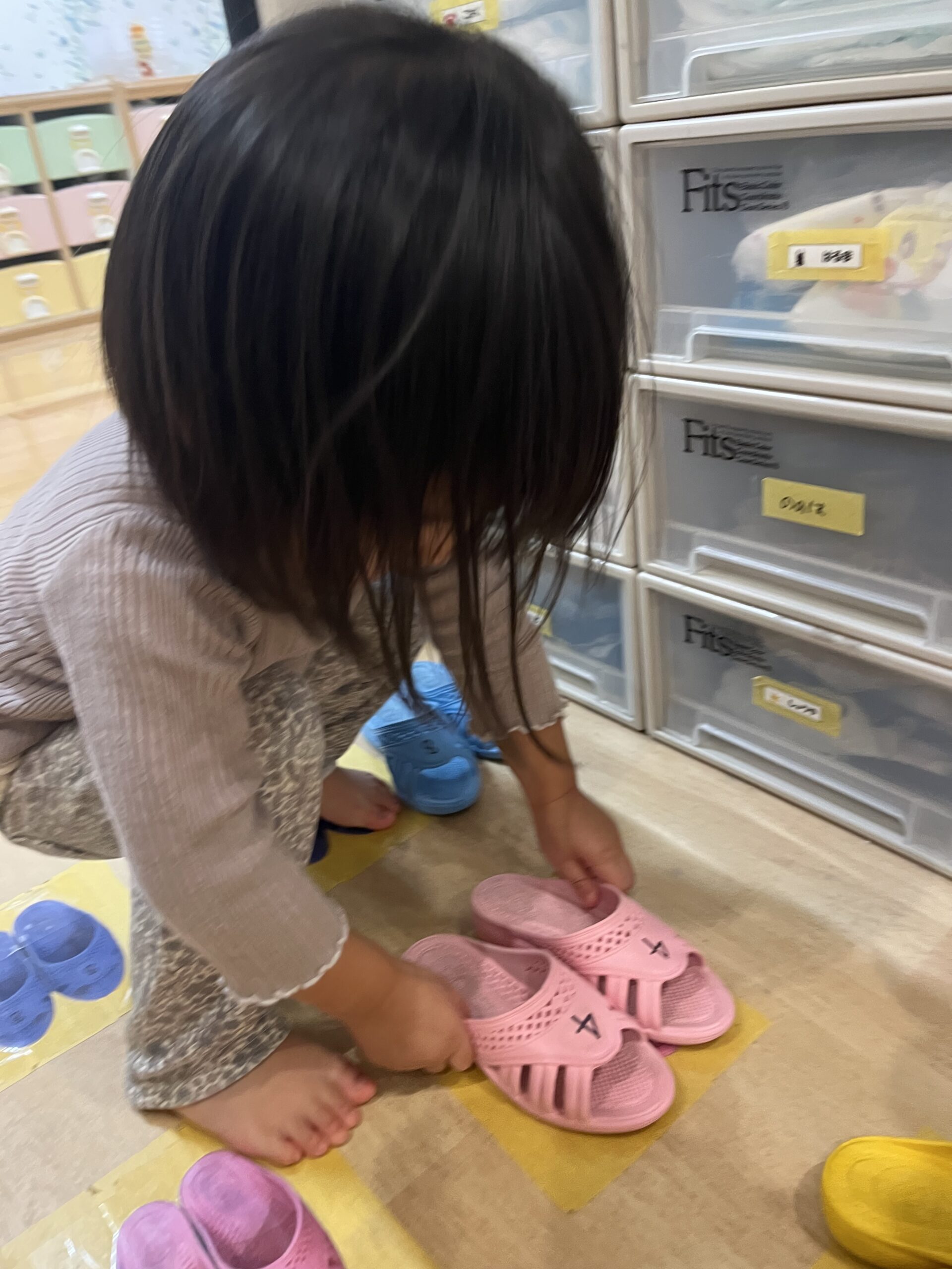 日中は上靴を履き始め、トイレではスリッパを履き始めました。最初は脱ぎ履きが難しそうな場面もありましたが、少しずつ慣れてきトイレから出る時はきれいに並べています。