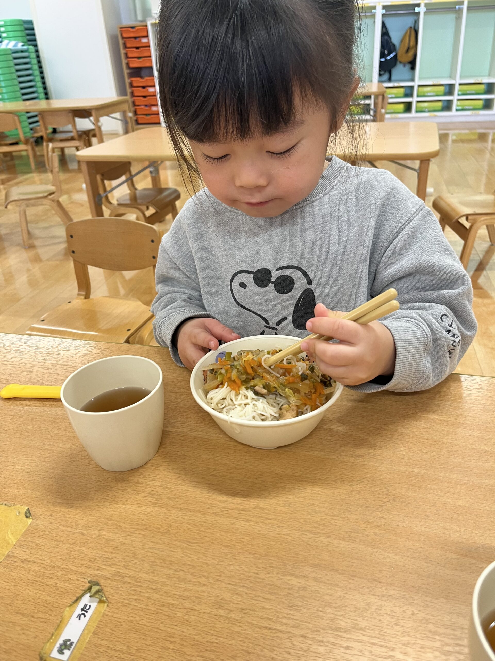 夏頃から遊びの中で練習してきたお箸。上手になってきたので給食時に使用し始めました。お箸を使えることを喜び、集中して食べています♪