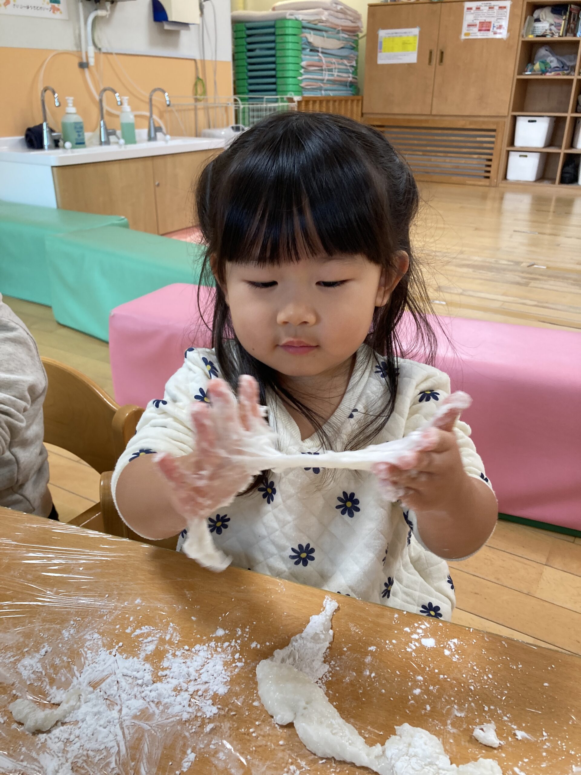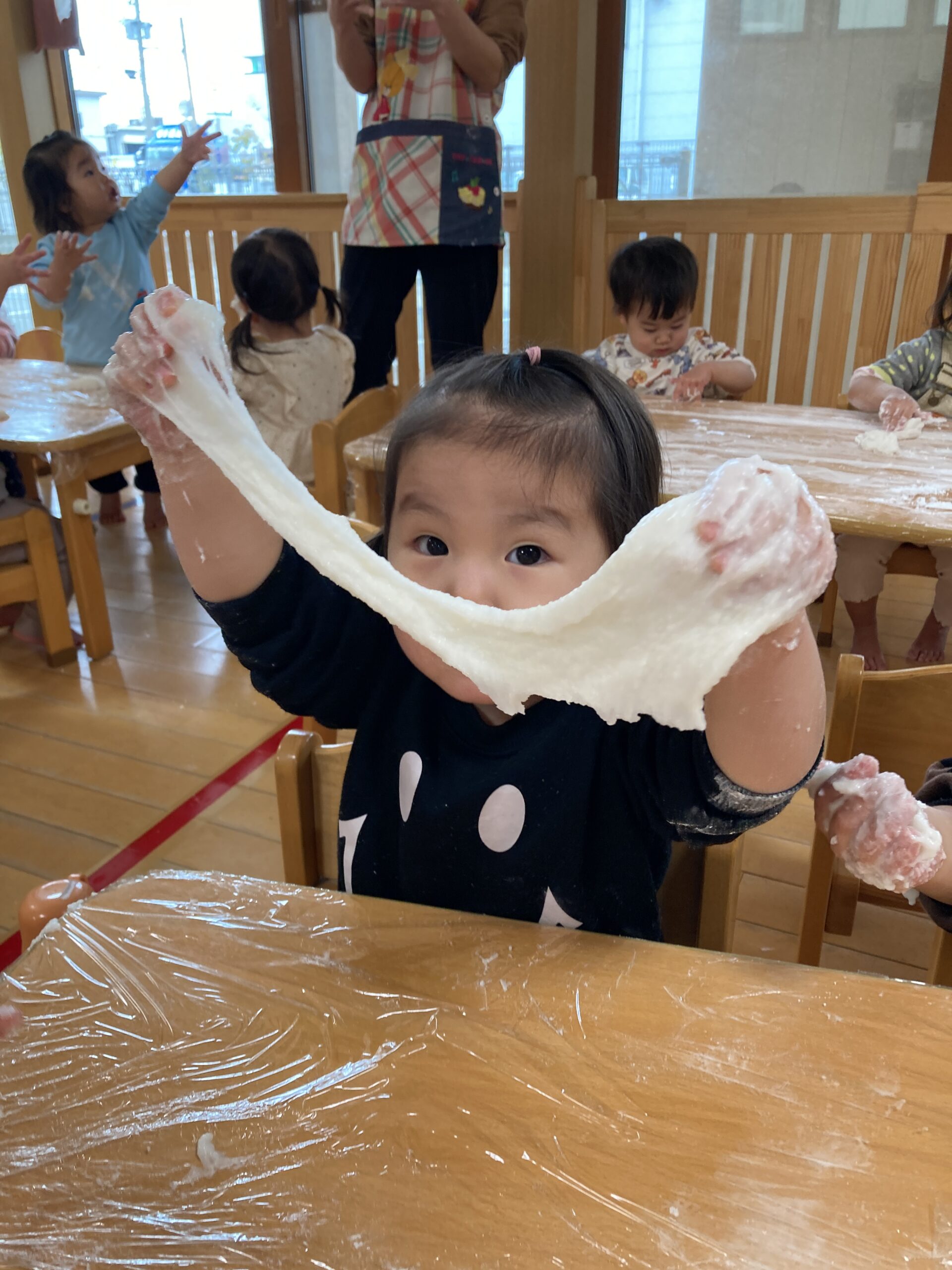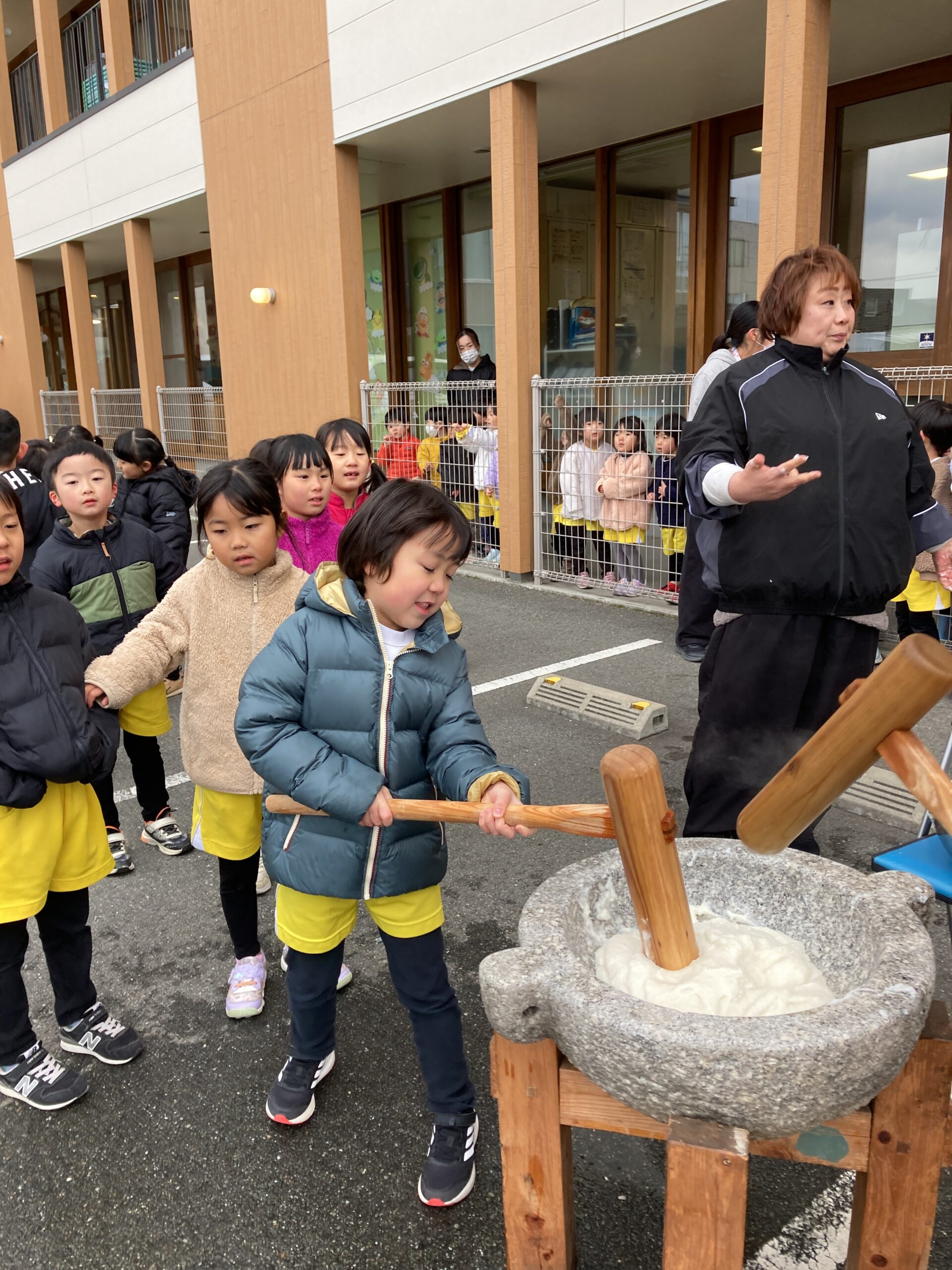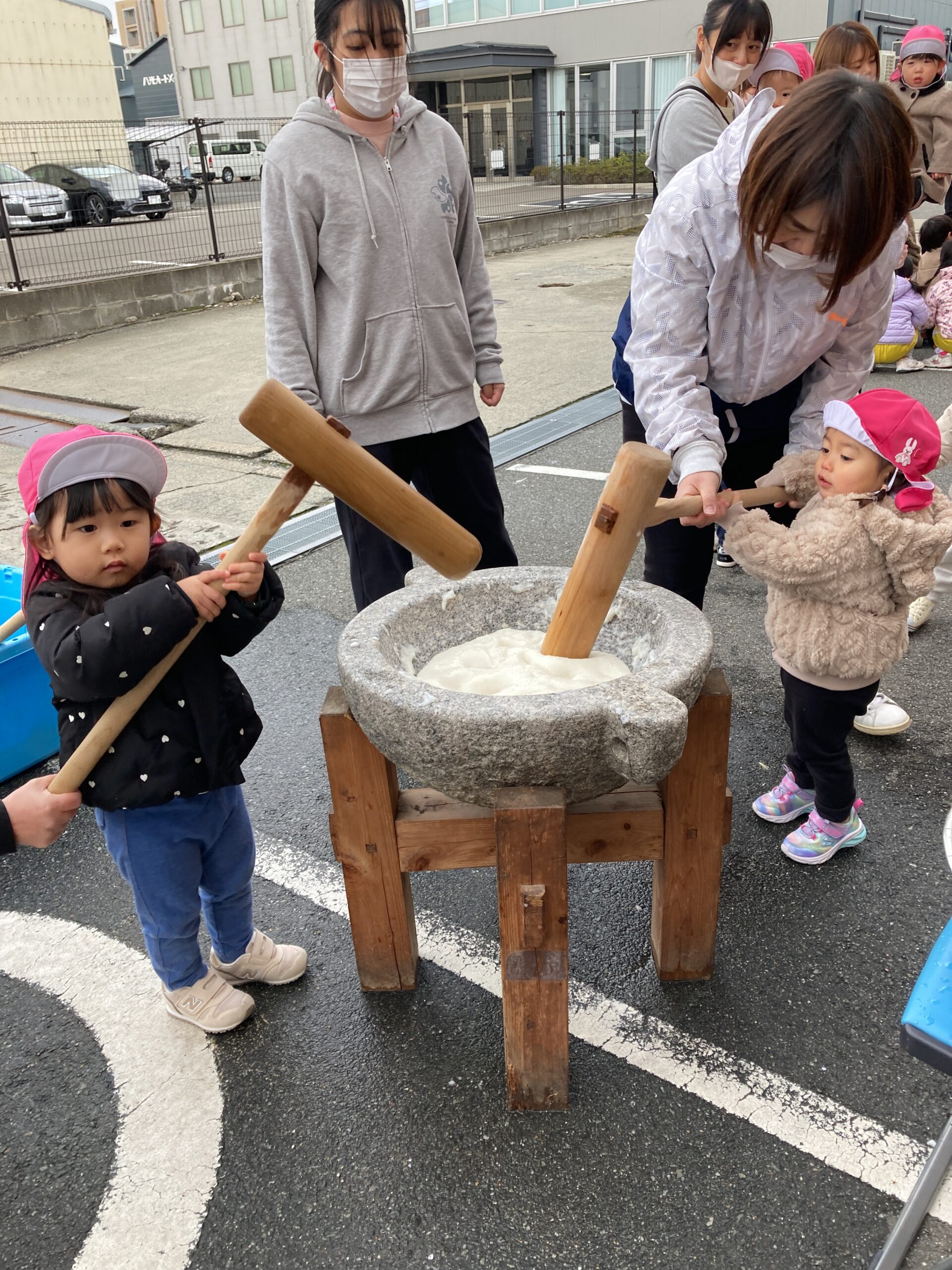 小さいお友達は、杵と臼でついたお餅で感触遊び✨