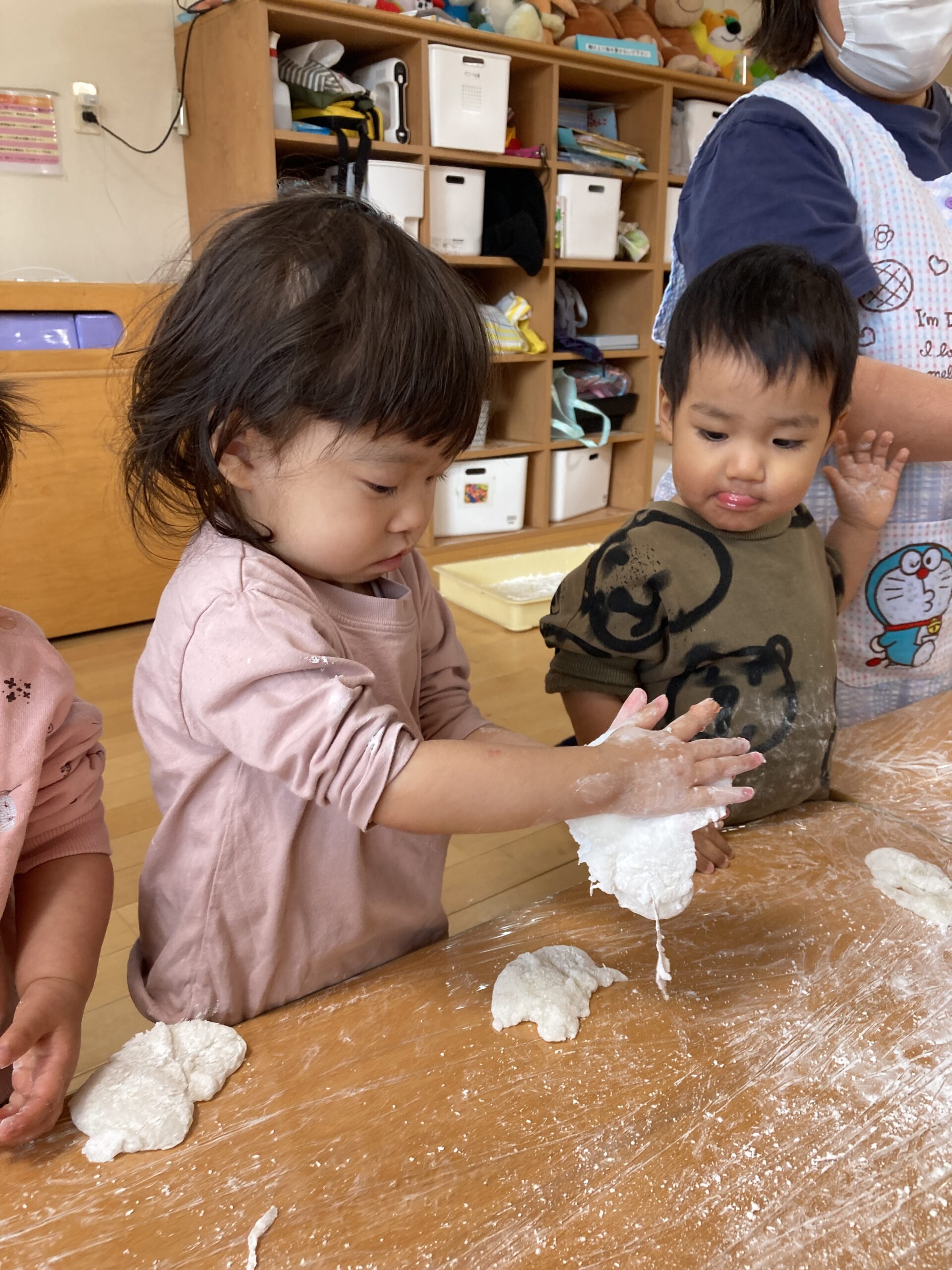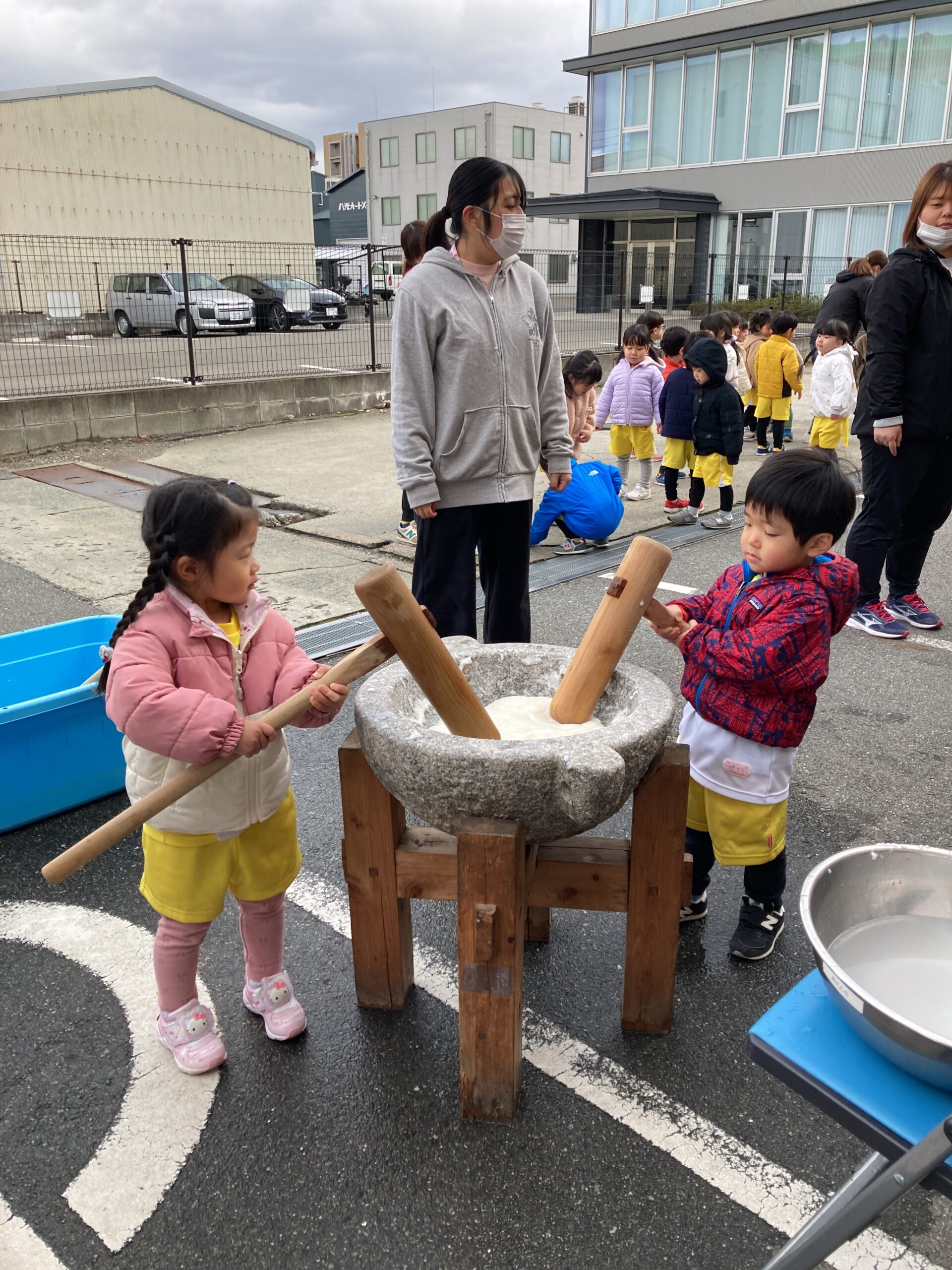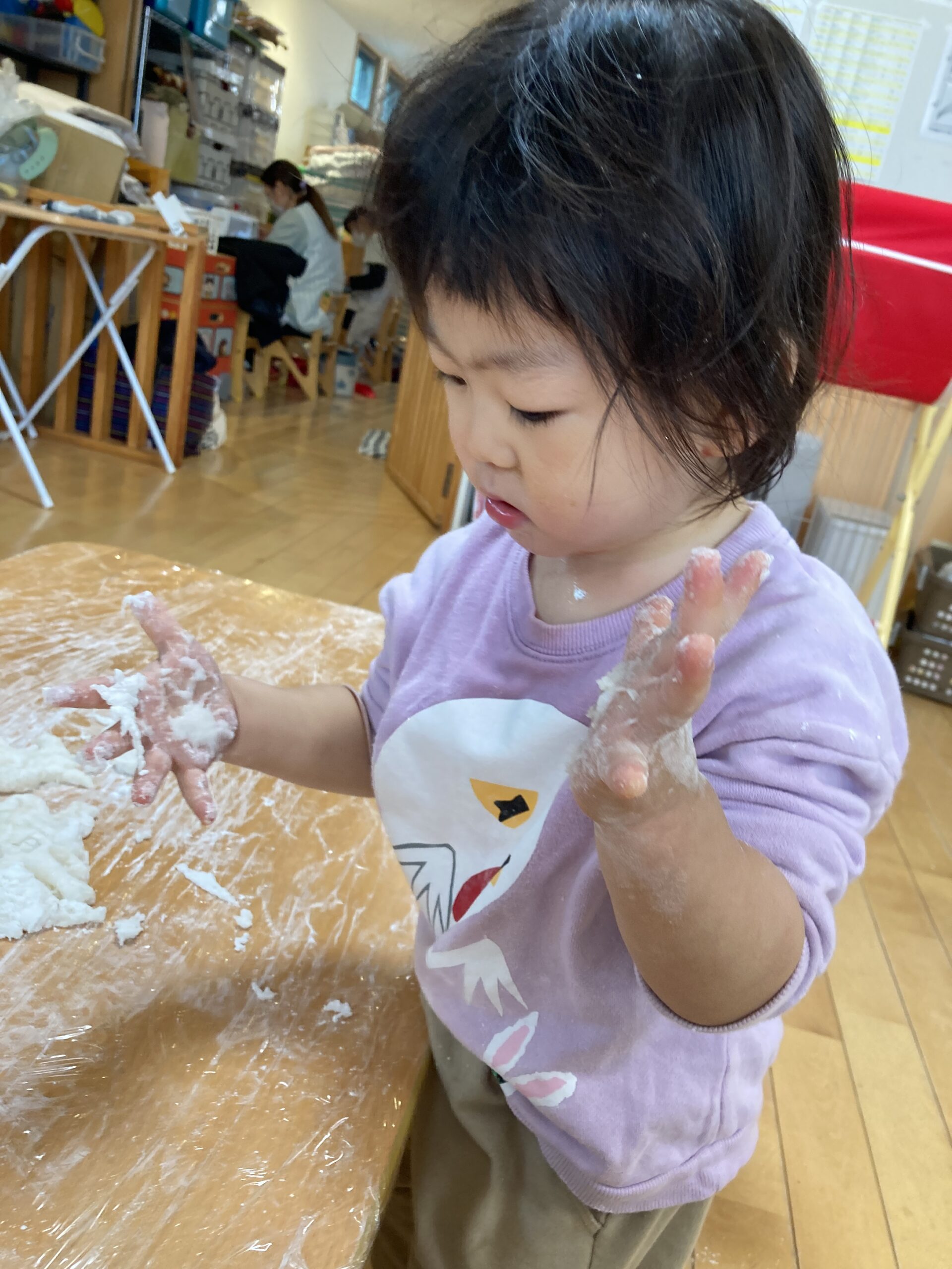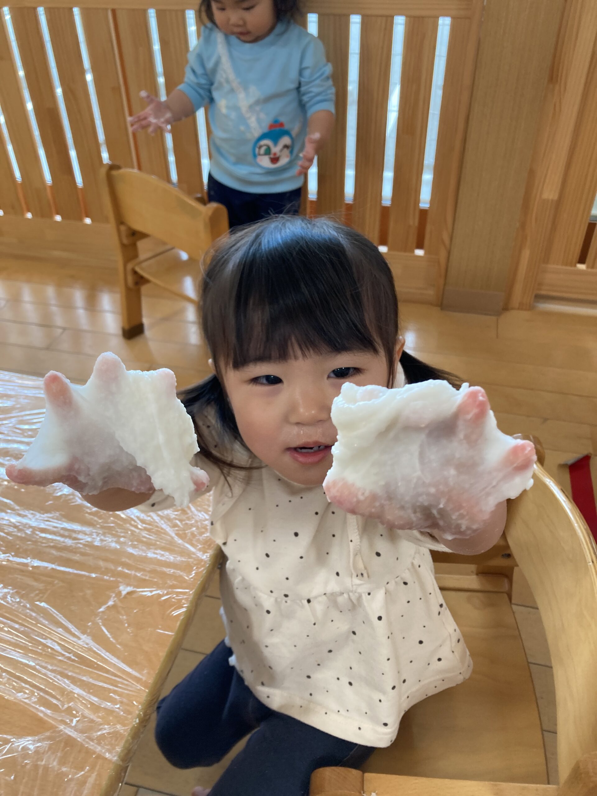 小さいお友達は、杵と臼でついたお餅で感触遊び✨