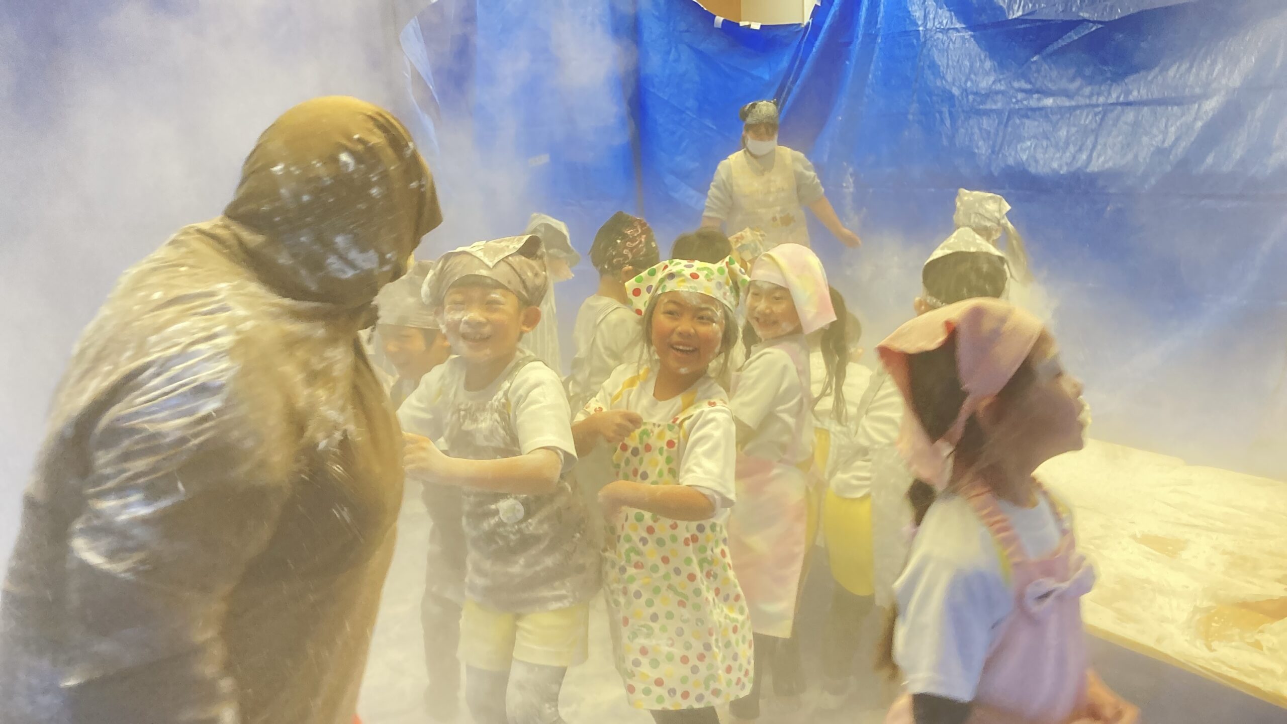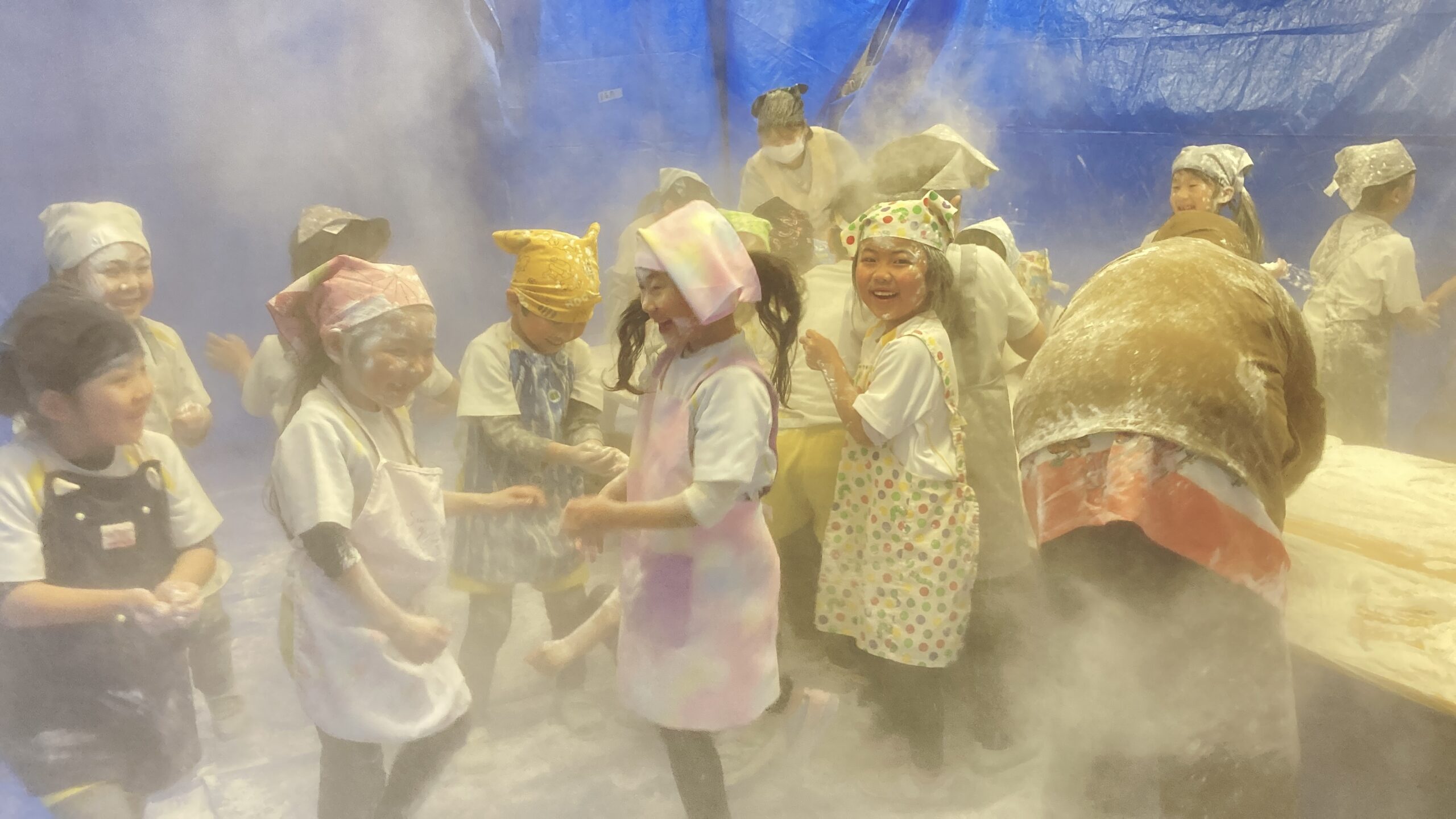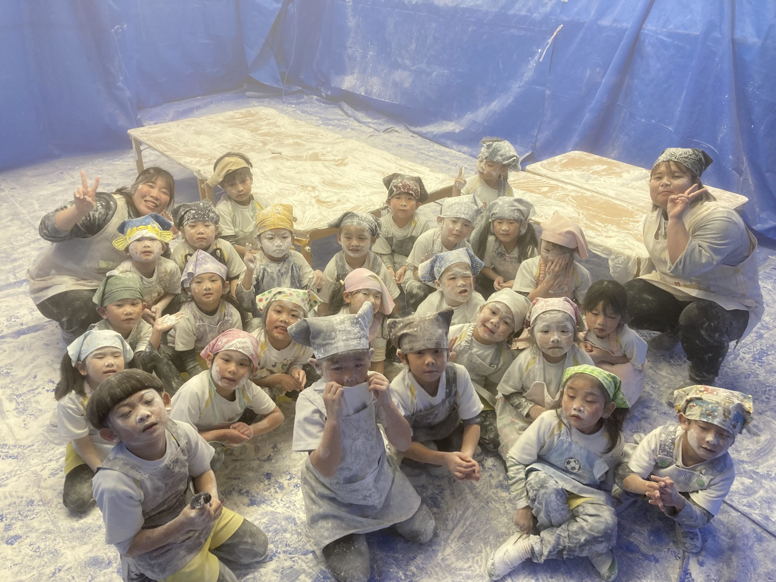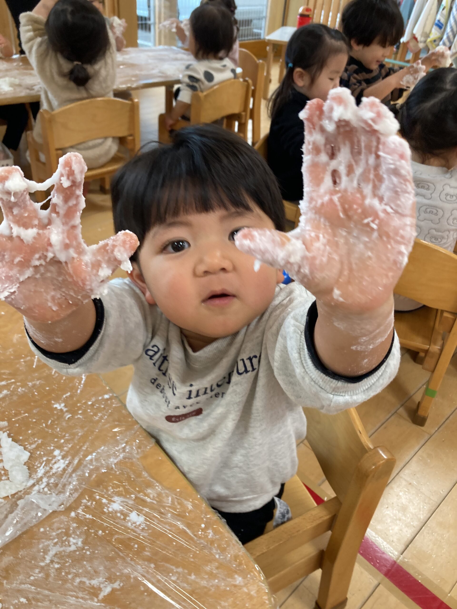 小さいお友達は、杵と臼でついたお餅で感触遊び✨