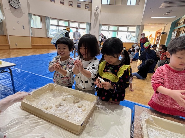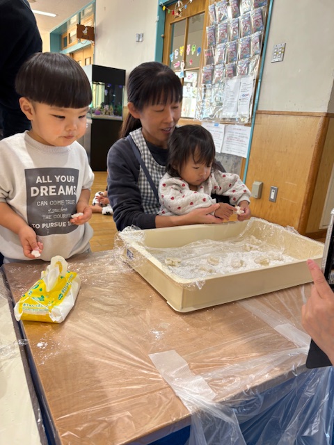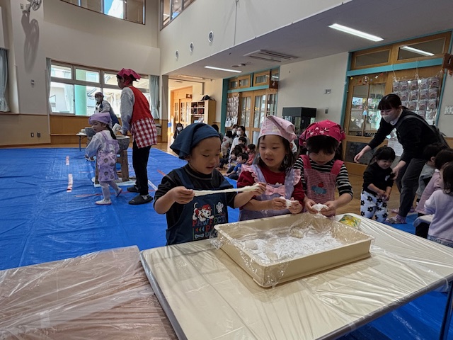 お餅をついたお友だちは早速お餅を伸ばしたり、コネコネしたりやわらか~い!と