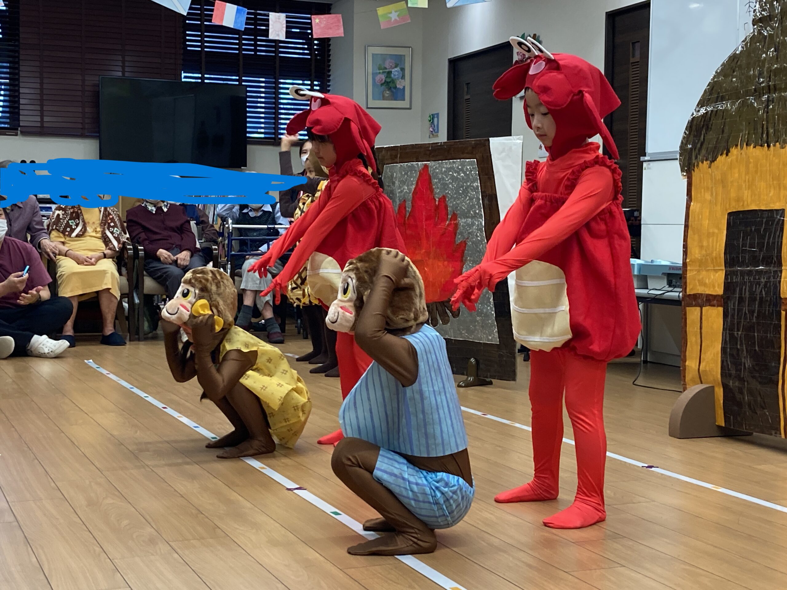 劇は、「さるかに話」衣装姿に演技に笑いがこぼれてまし