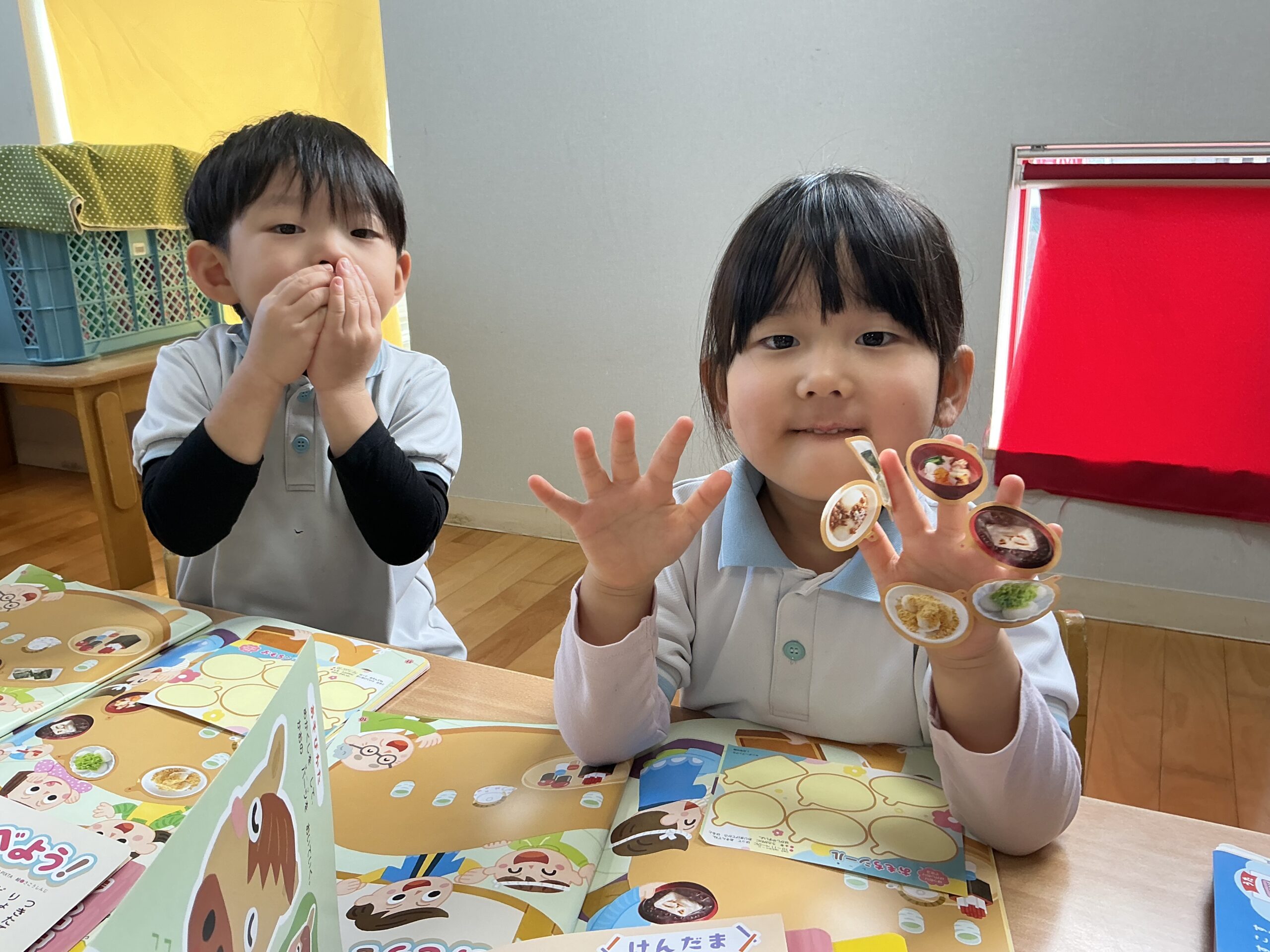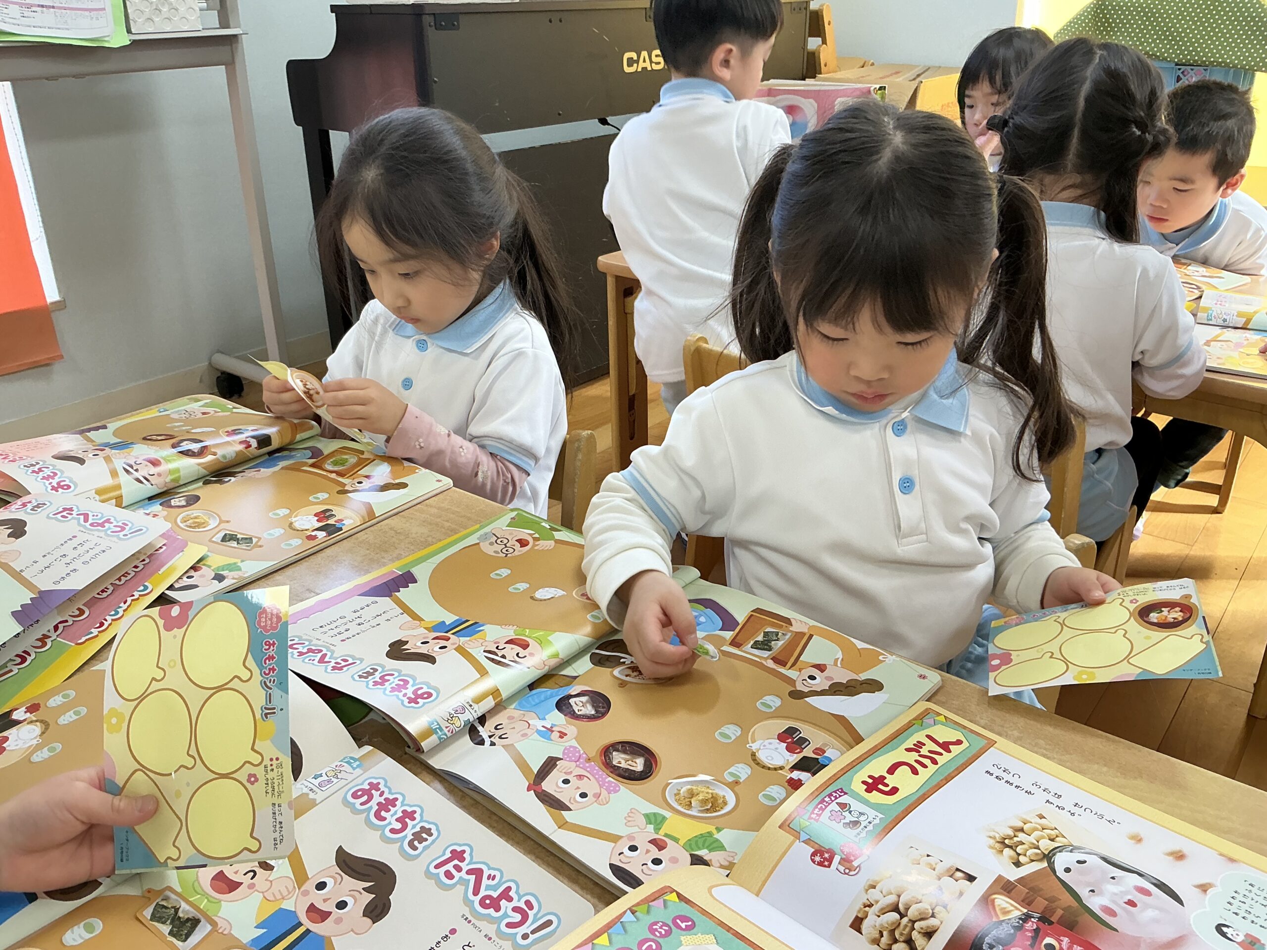 シール貼り『おもちをたべよう!』では、きな粉もち、おしるこなどのシールをイラストに自由に貼りました。