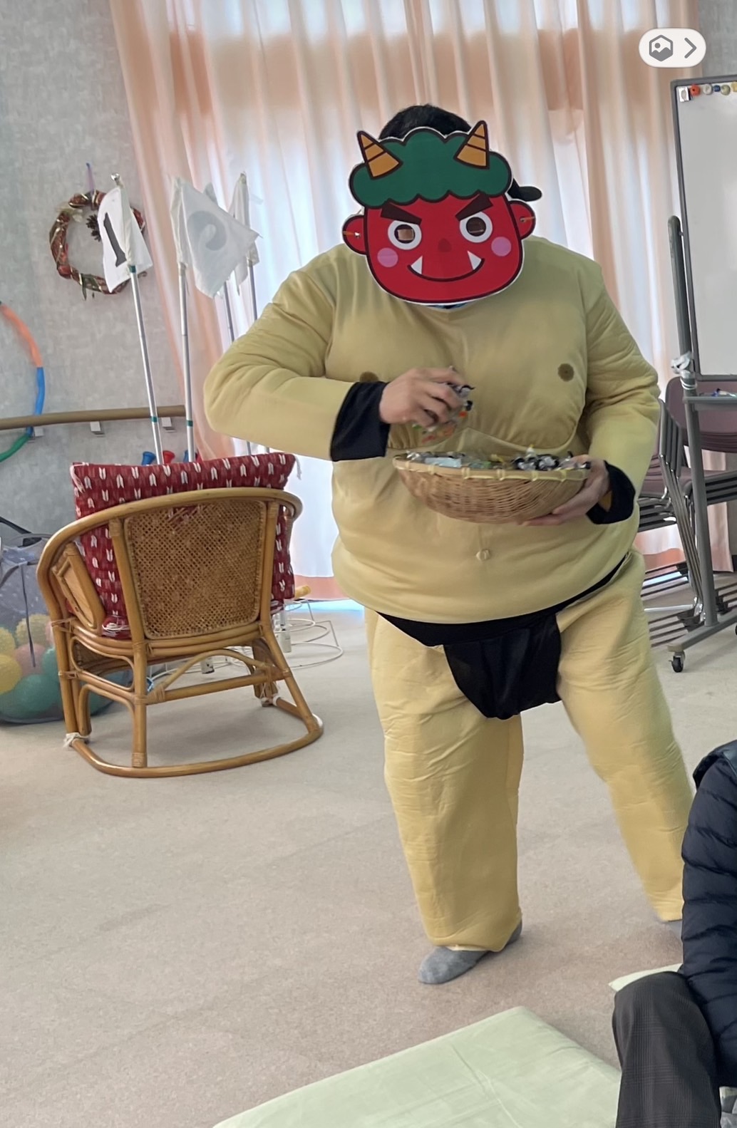 2月3日は節分ですが、つばき園では2月2日から4日まで3日間、豆まきレクを行いました。