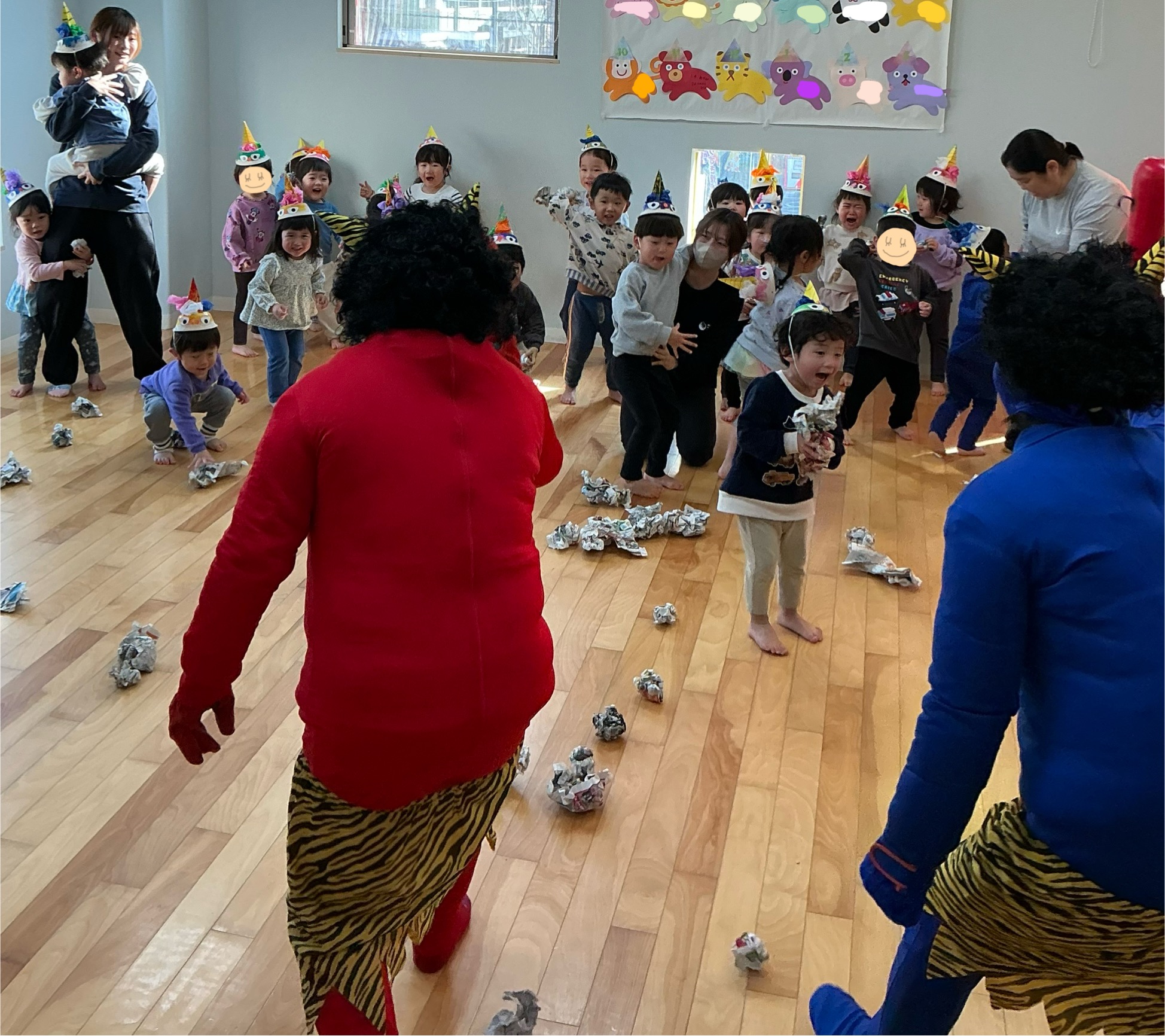 3・4・5歳児クラスになると鬼も逃げたくなるくらいの新聞紙豆が飛び交います‼️👹💦