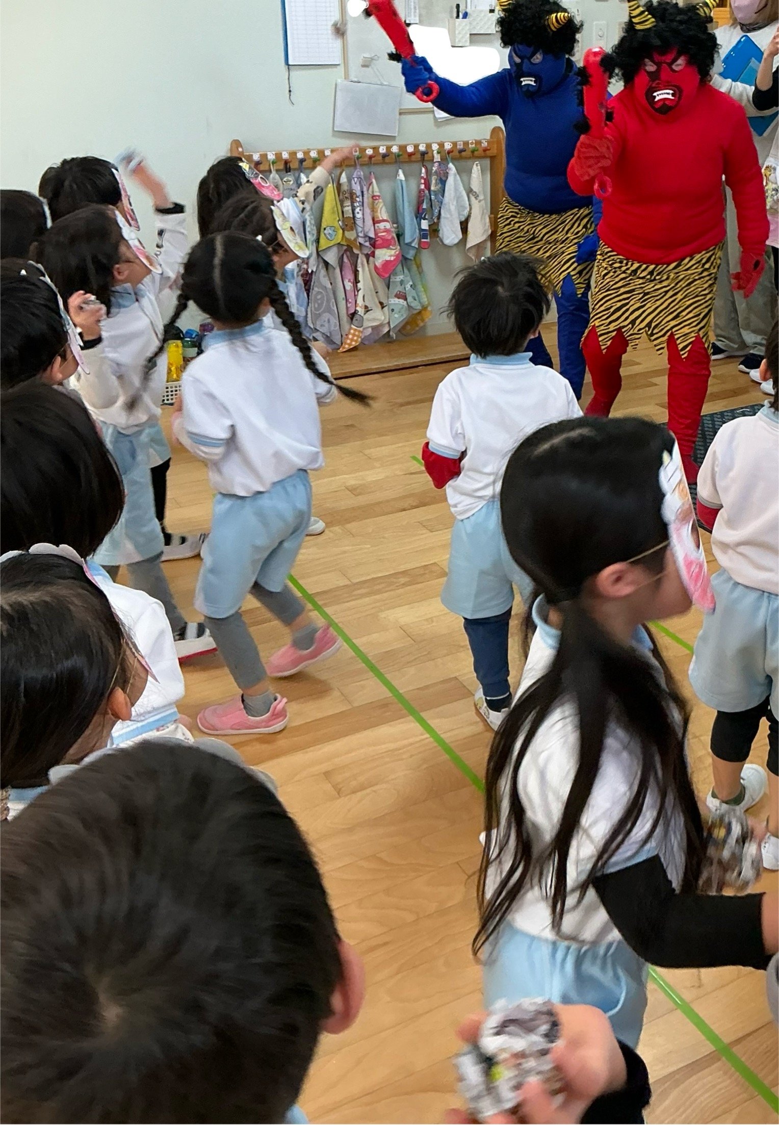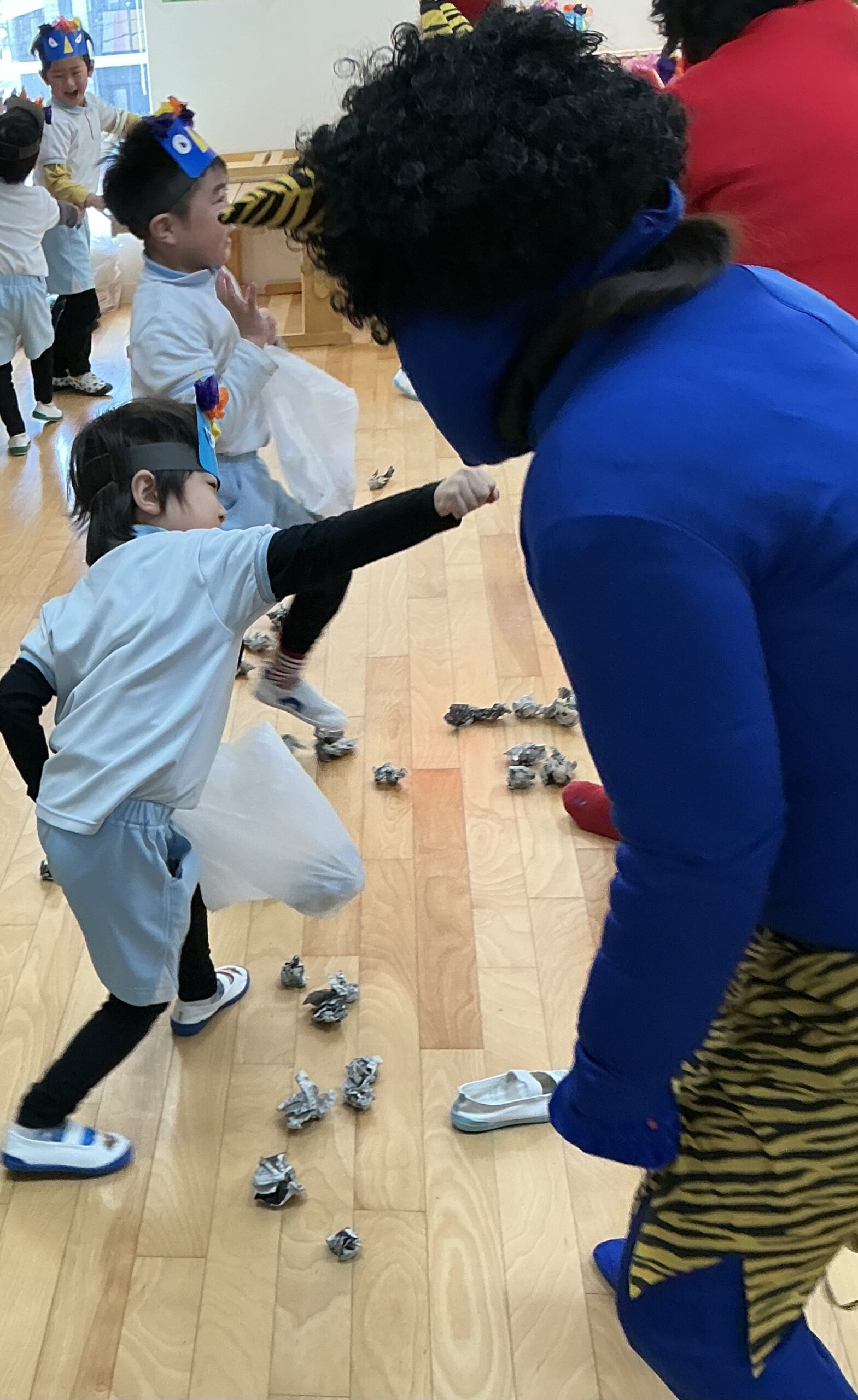 年齢が上がってくると、新聞紙豆をまく準備もしていましたが、いざ鬼を目の前にすると固まってしまう子、