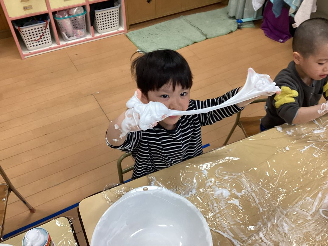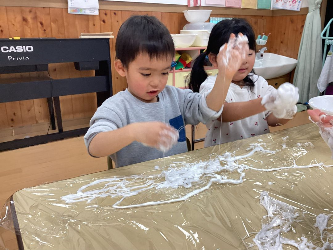 感触遊びでシェービングフォームと洗濯糊・コンタクト液を混ぜてスライムを作りました🧡いつものスライムとは違って感触も柔らかくクリームのようで『ケーキ🎂みたい😍』『美味しそう😋』と大喜びで😊自分で混ぜて固めていきました❣️