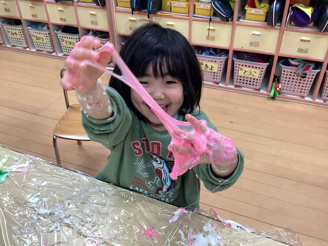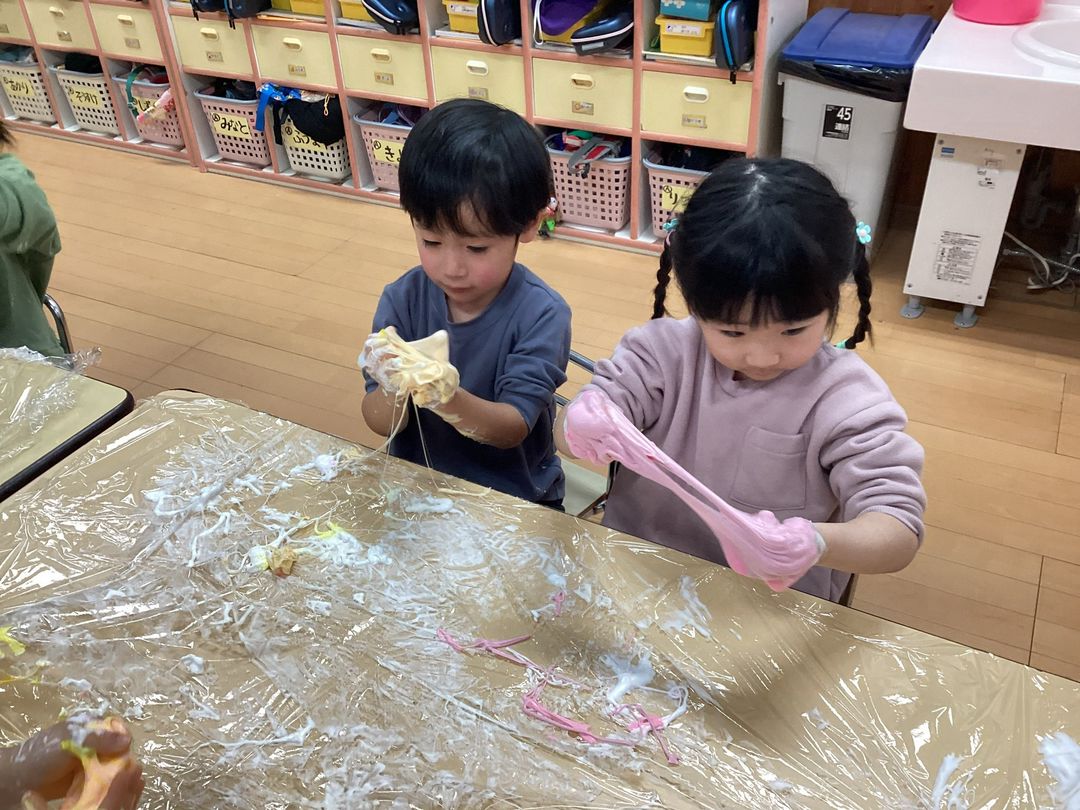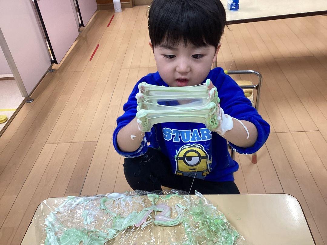 どんどん固まっていく様子を嬉しそうにみていました💖食紅で色をつけて食べ物に見立てて友達と会話を楽しみながら遊んでいました😍