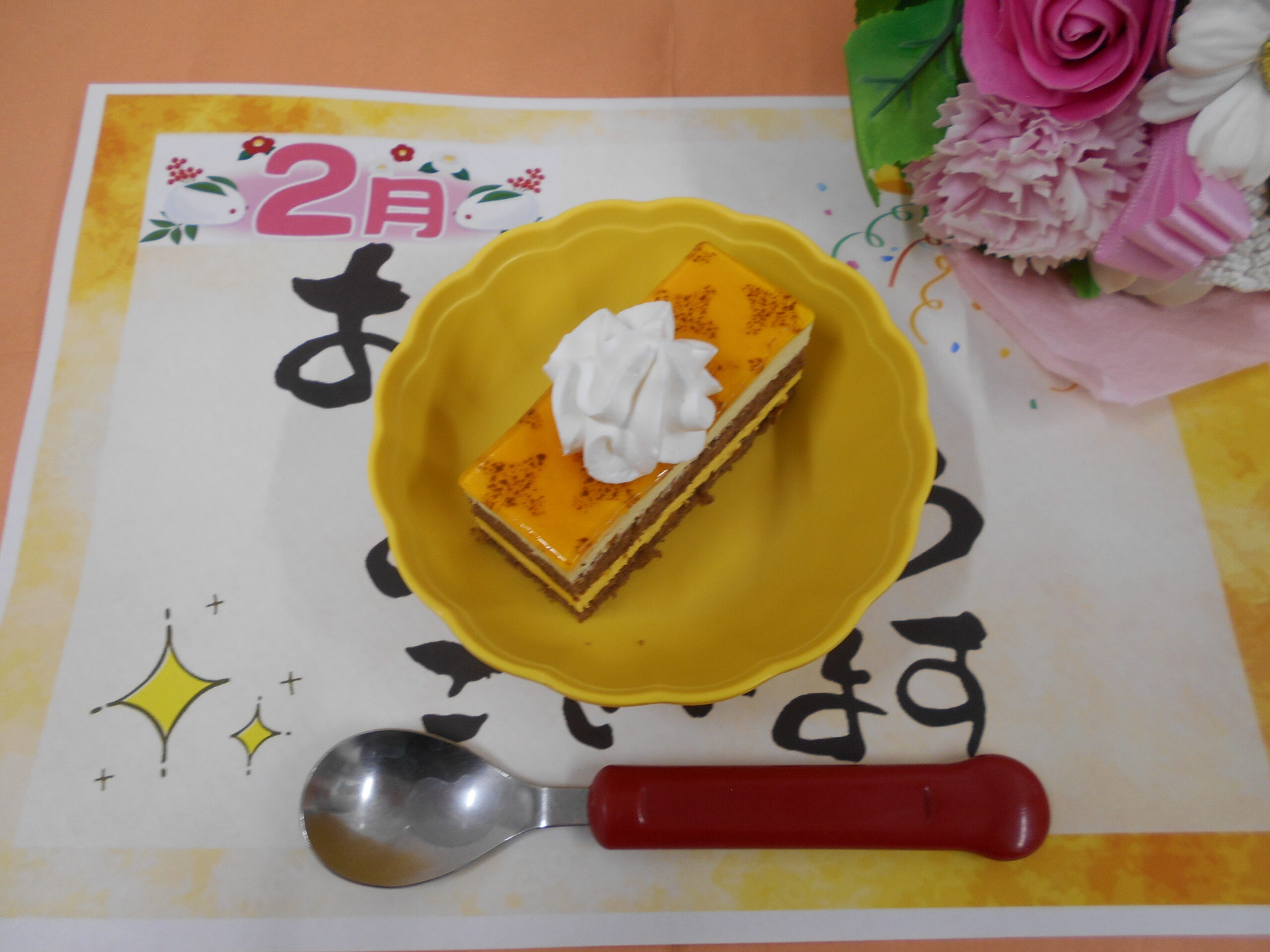 2月は「オレンジ味」のケーキで今月お誕生日の入居者様をお祝いさせていただきました🤩🎉