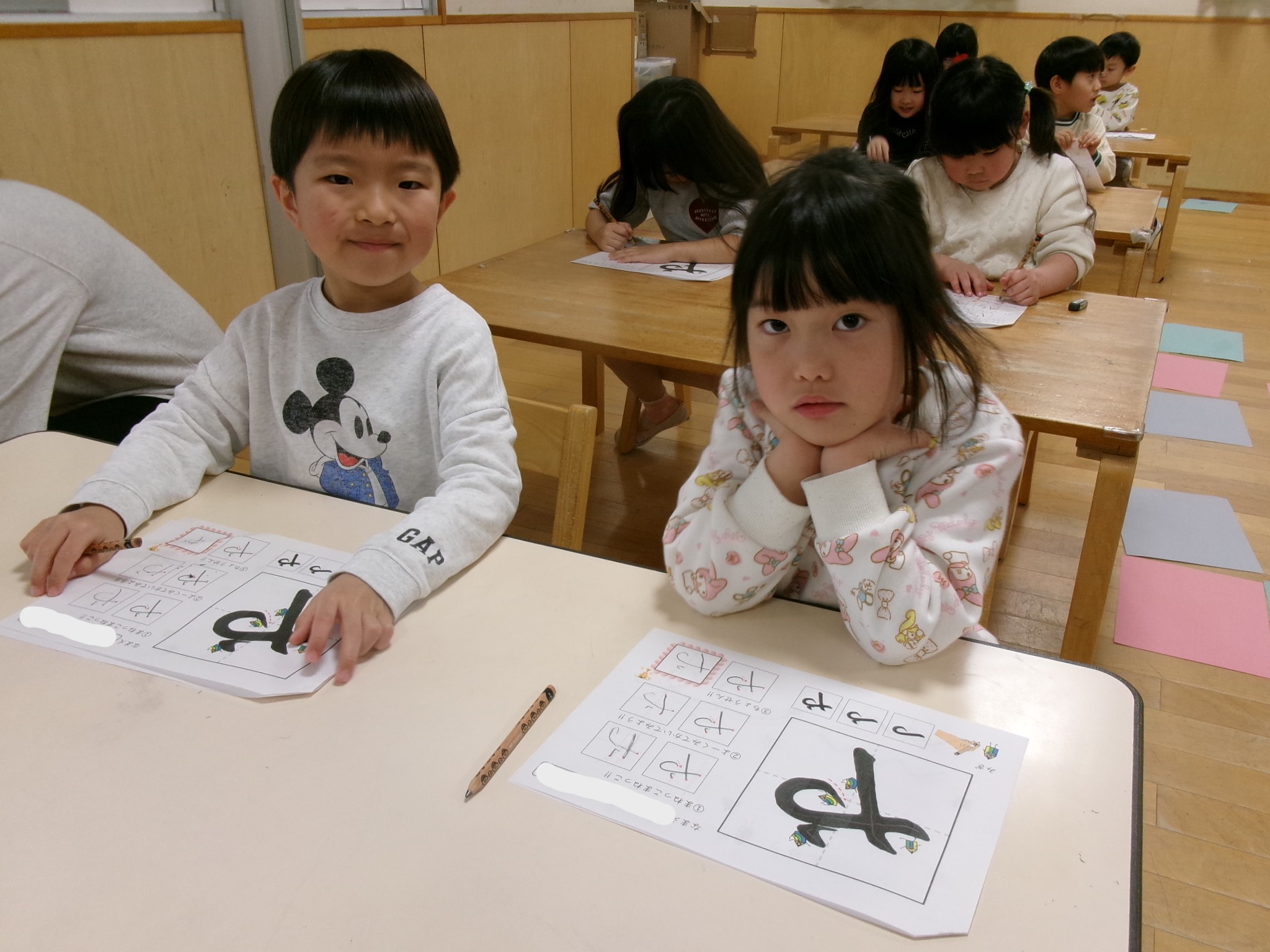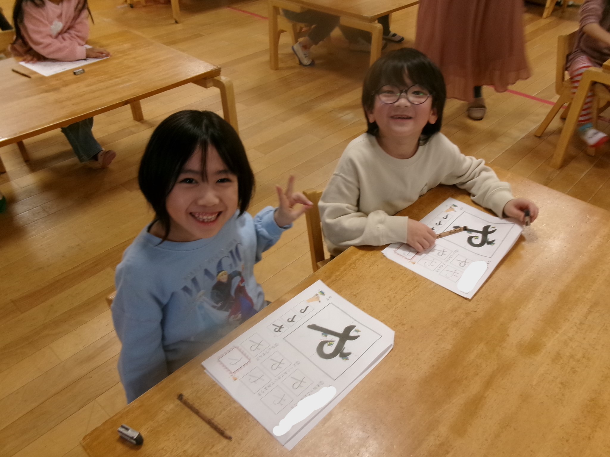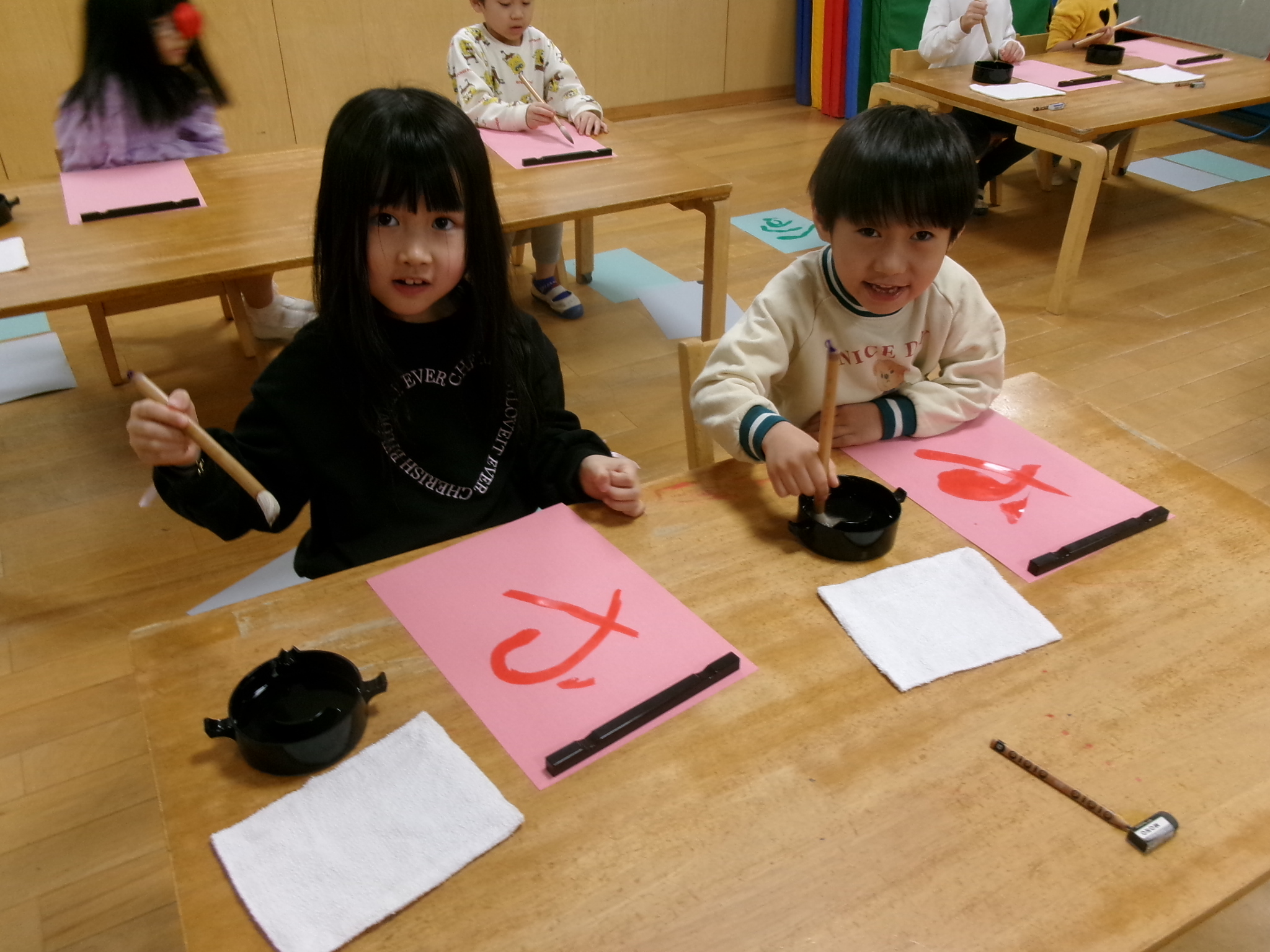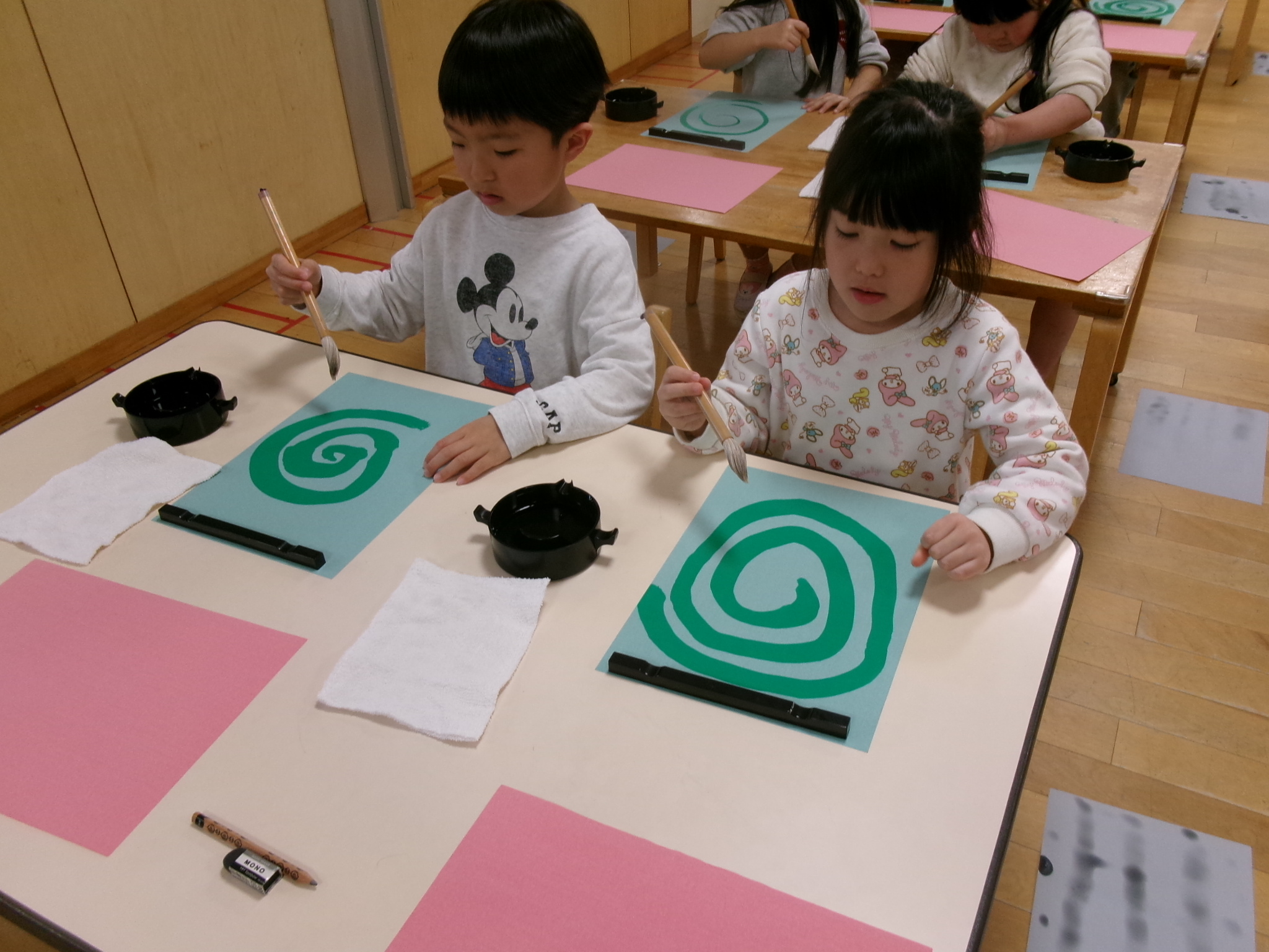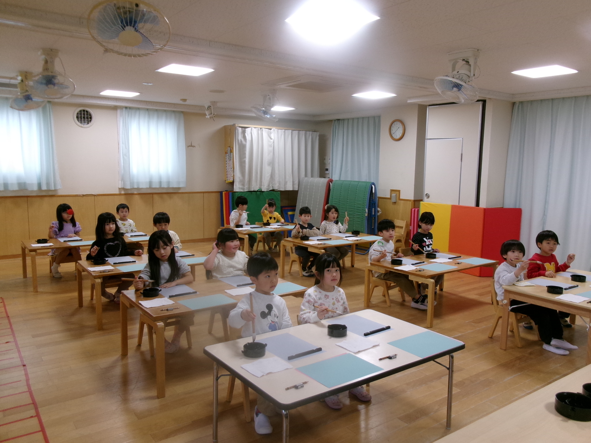 筆を初めて持つ子ども達も多く、筆の持ち方、使い方を教えていただきました。
