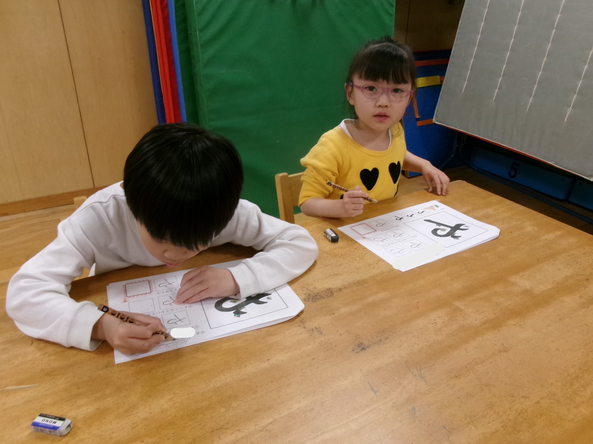 お友だちと見比べながら、上手に横線や丸を書いています。