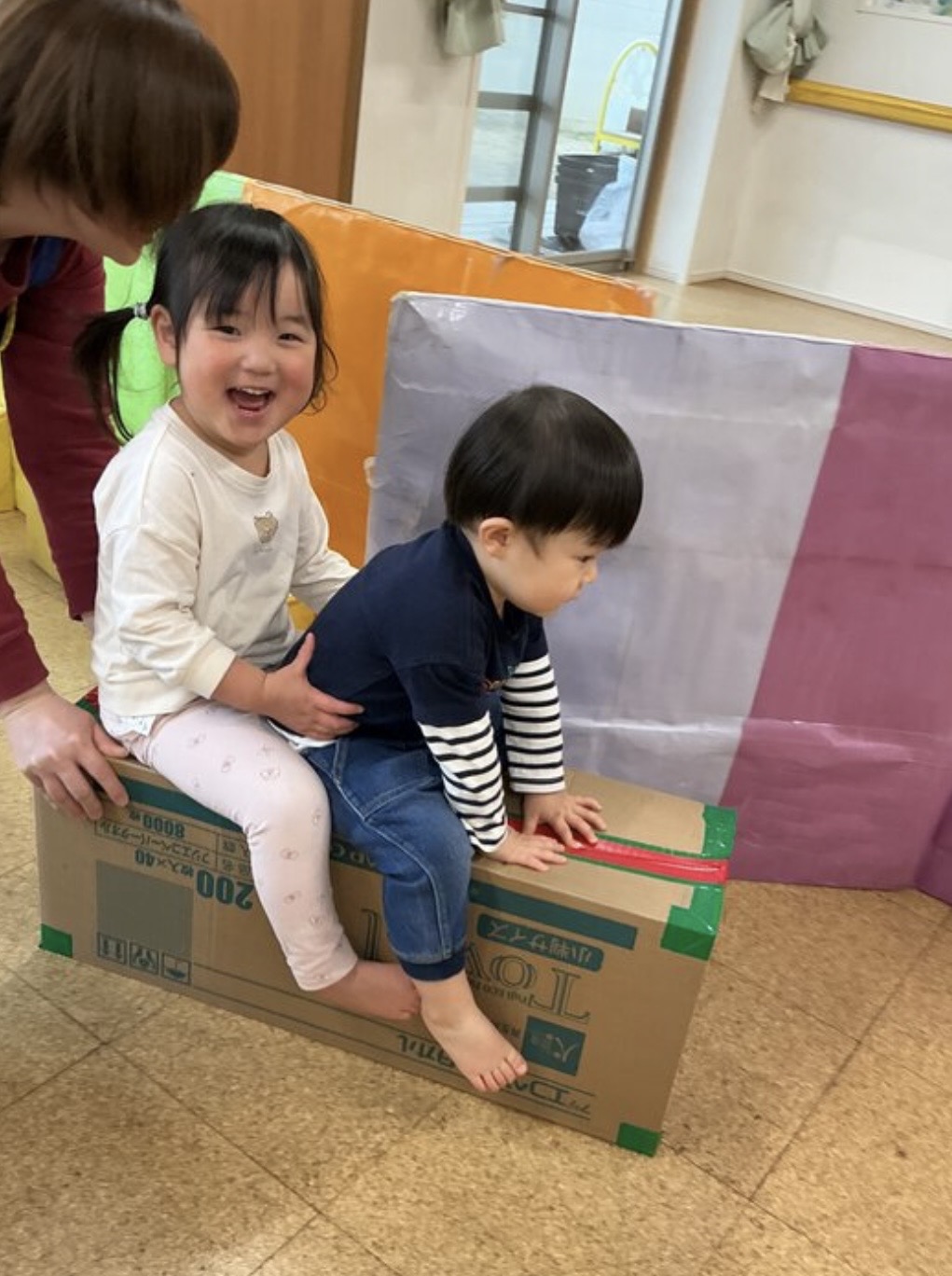 ダンボールの中に入り、「おいでー!」とお友達の名前を呼び誘い顔を見合わせ微笑ましいです♡