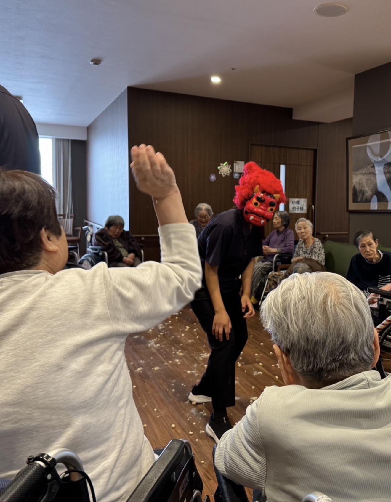 I 様は「鬼怖いね」と他利用者様と交流をしながら鬼に向かって「鬼は外」「福は内」と掛け声をかけながら豆まきに参加されていました。