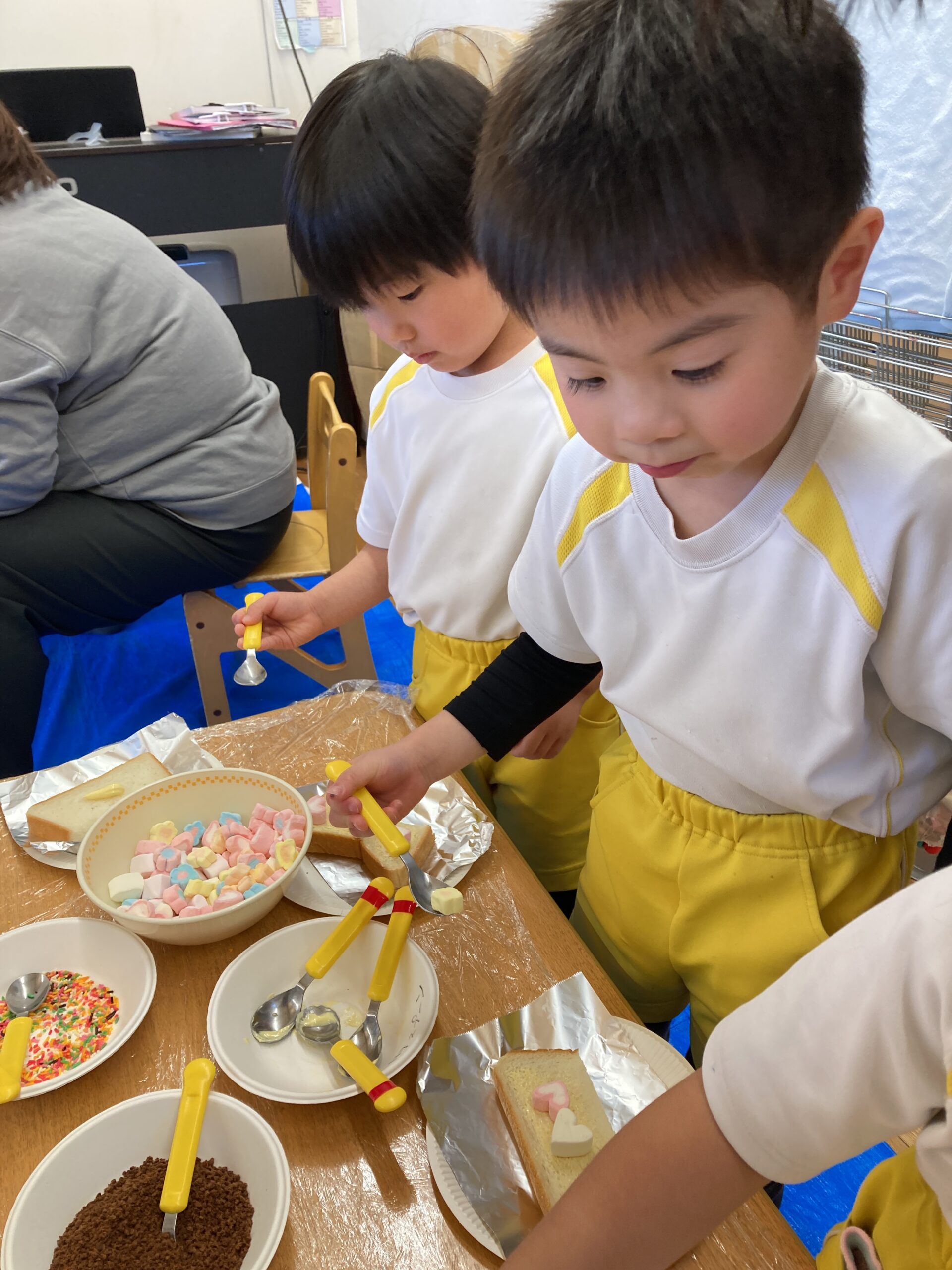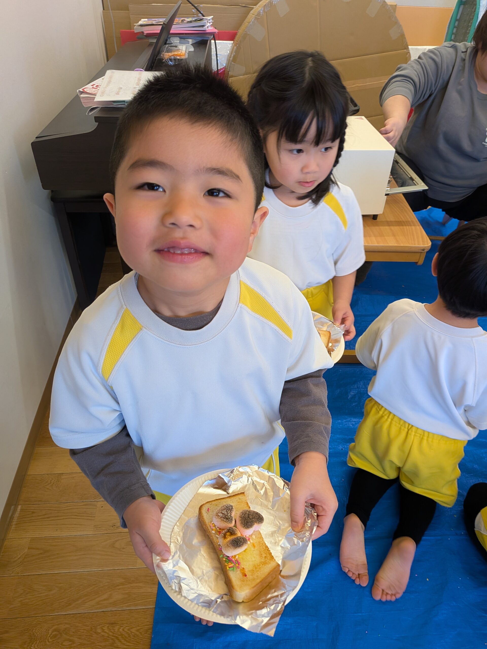 食パンに、マシュマロとチョコスプレー等でトッピング🎵