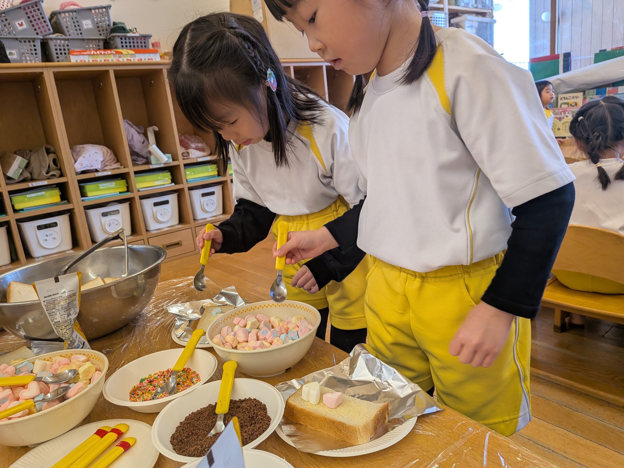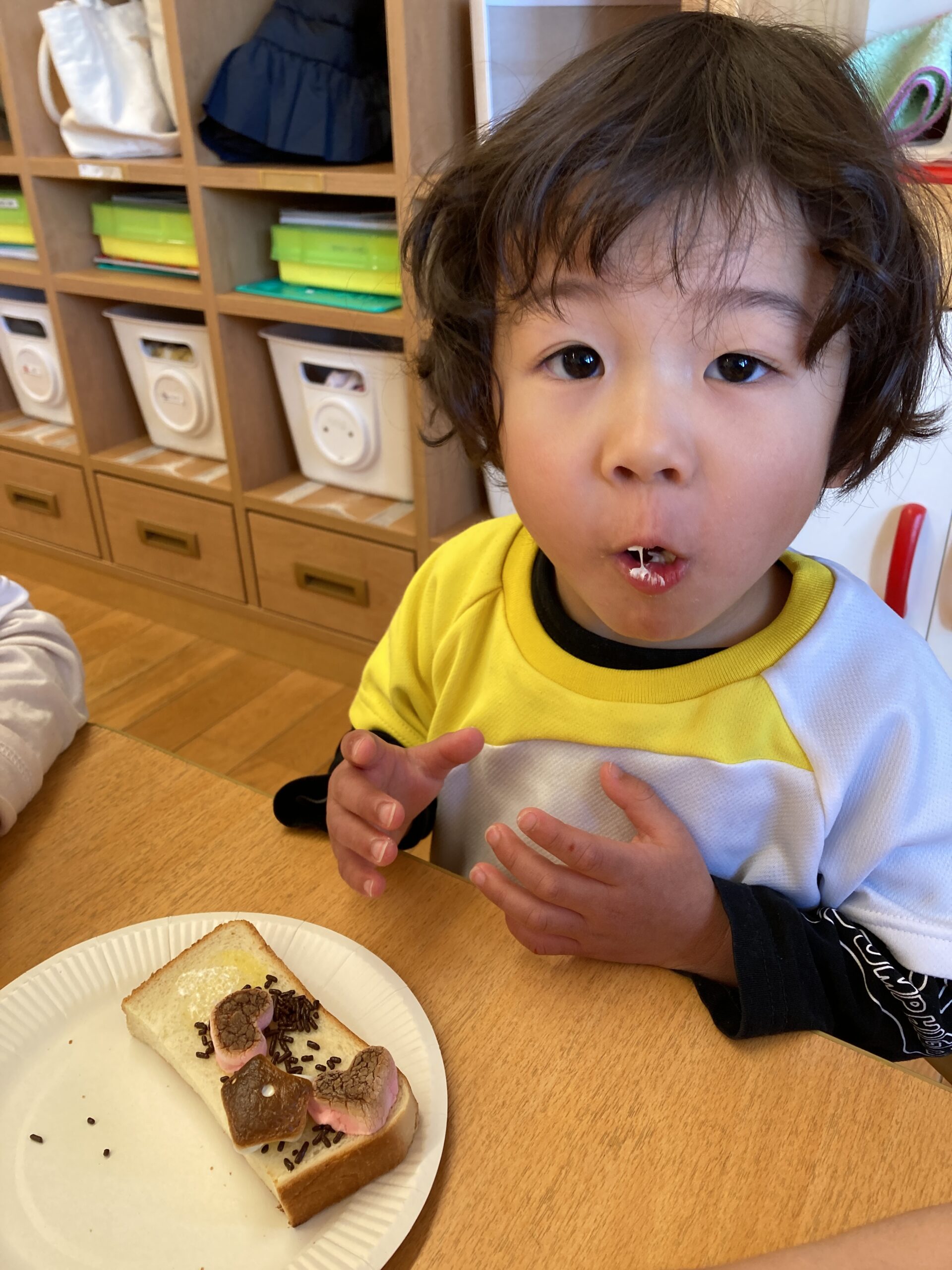 食パンに、マシュマロとチョコスプレー等でトッピング🎵