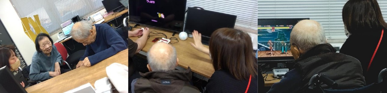 職員と昔流行した格闘ゲームや相撲のゲームで対戦。画面を見ながら自然と笑い声も広がります。