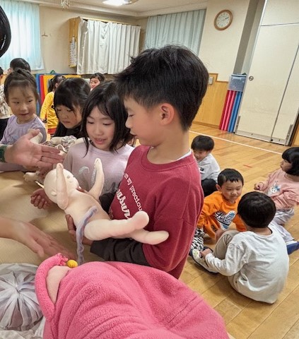 お人形にはへその緒もついてあり、「お家にあって、ママに見せてもらったことある」と隣のお友だちにお話ししている女の子もいました。