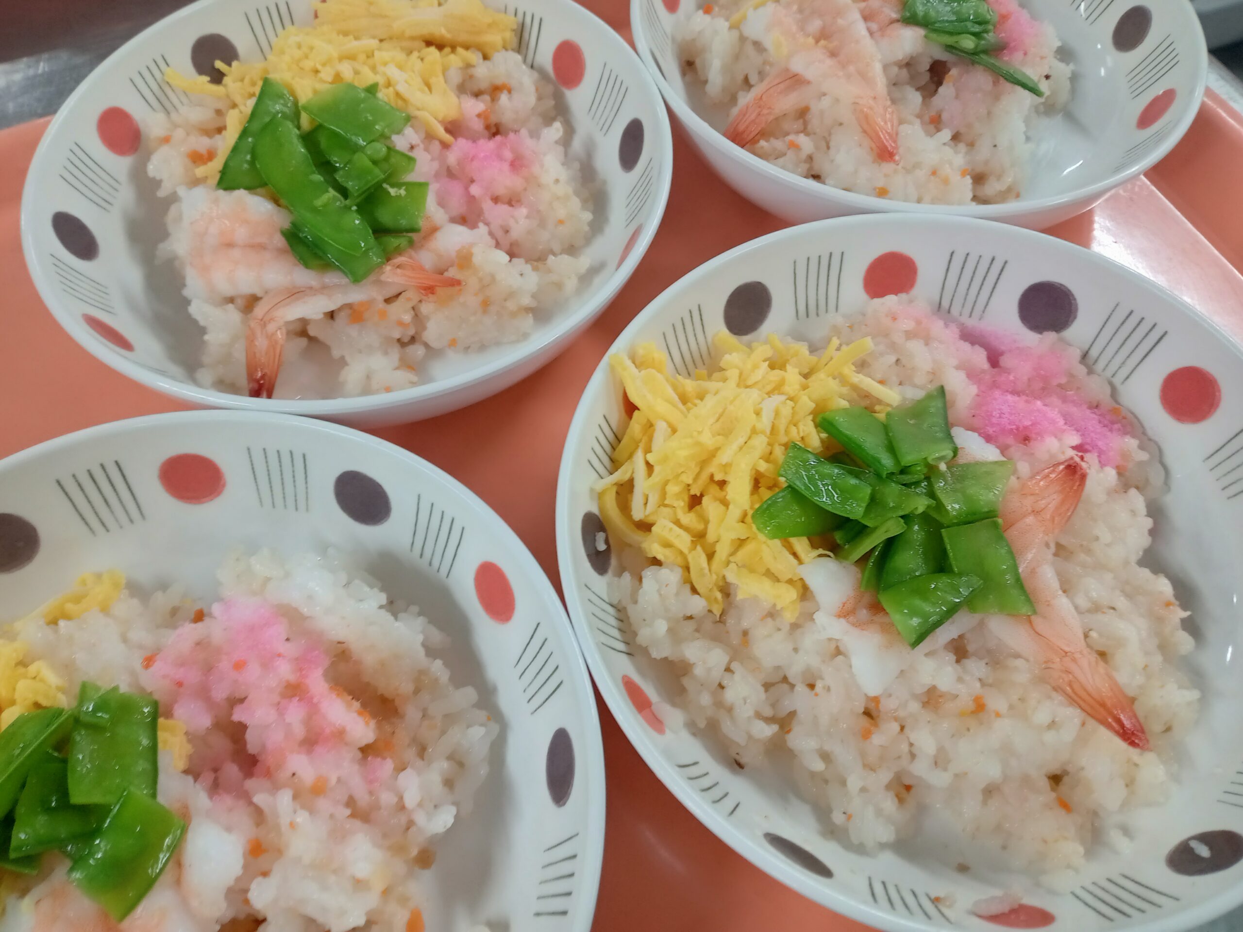 ちらし寿司には、エビ・たまご・さくらでんぶ・絹さやをトッピング。