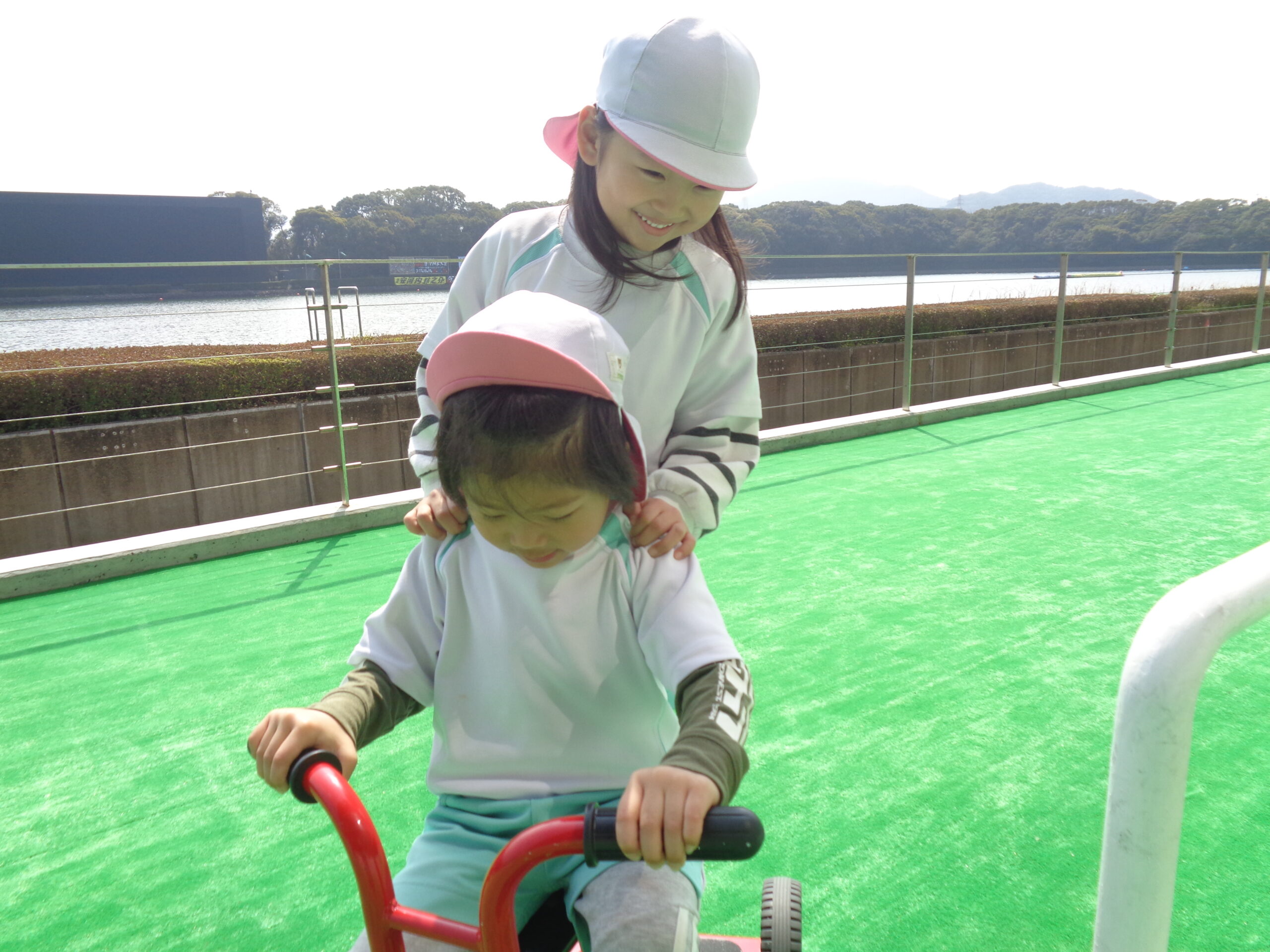 4.5歳児のみ、外でも遊びました。いろいろな三輪車があり「これ、どうやって乗るの?」と、お友達に聞いたり、「後ろ乗るよー」など、仲良く楽しんでいました。