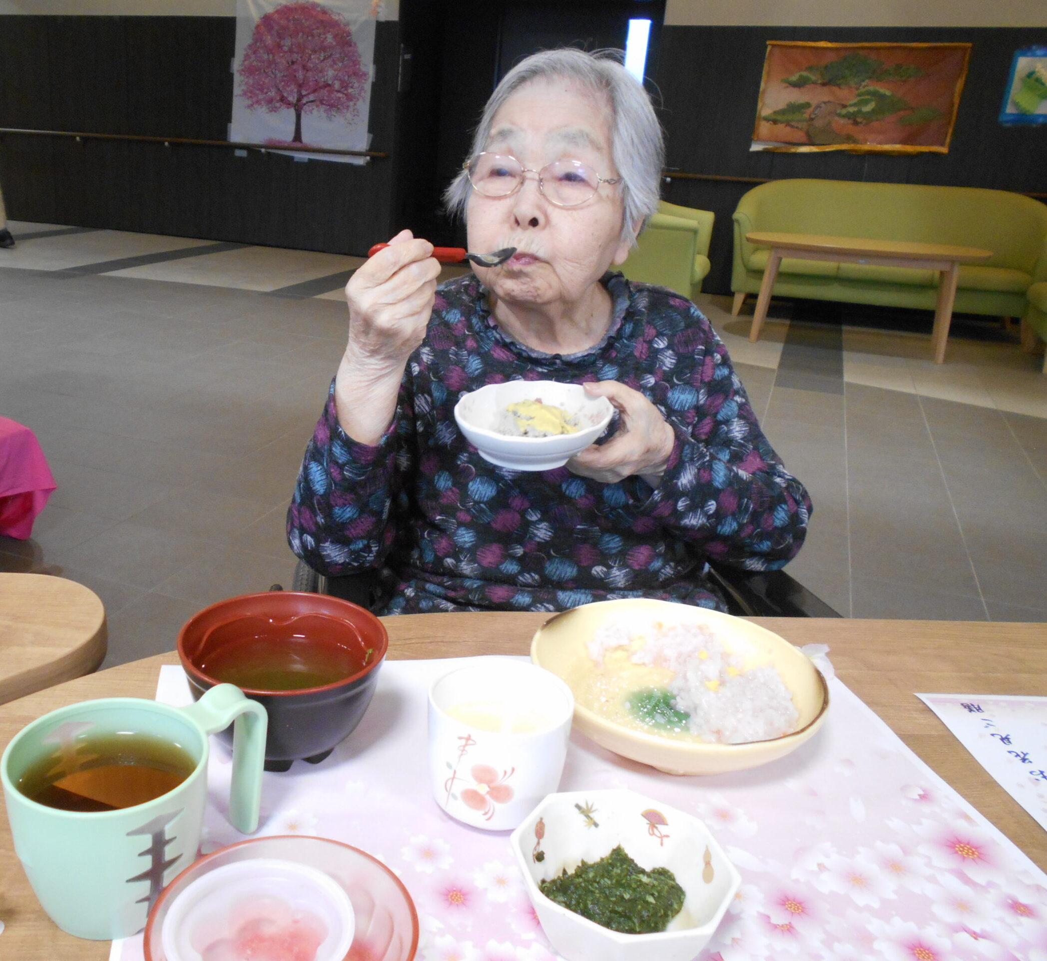 ケア課のG課長より「たまご豆腐がなめらかでおいしい☺️」「ゼリーもさっぱりしておいしい😳」と褒めていただきました🌸